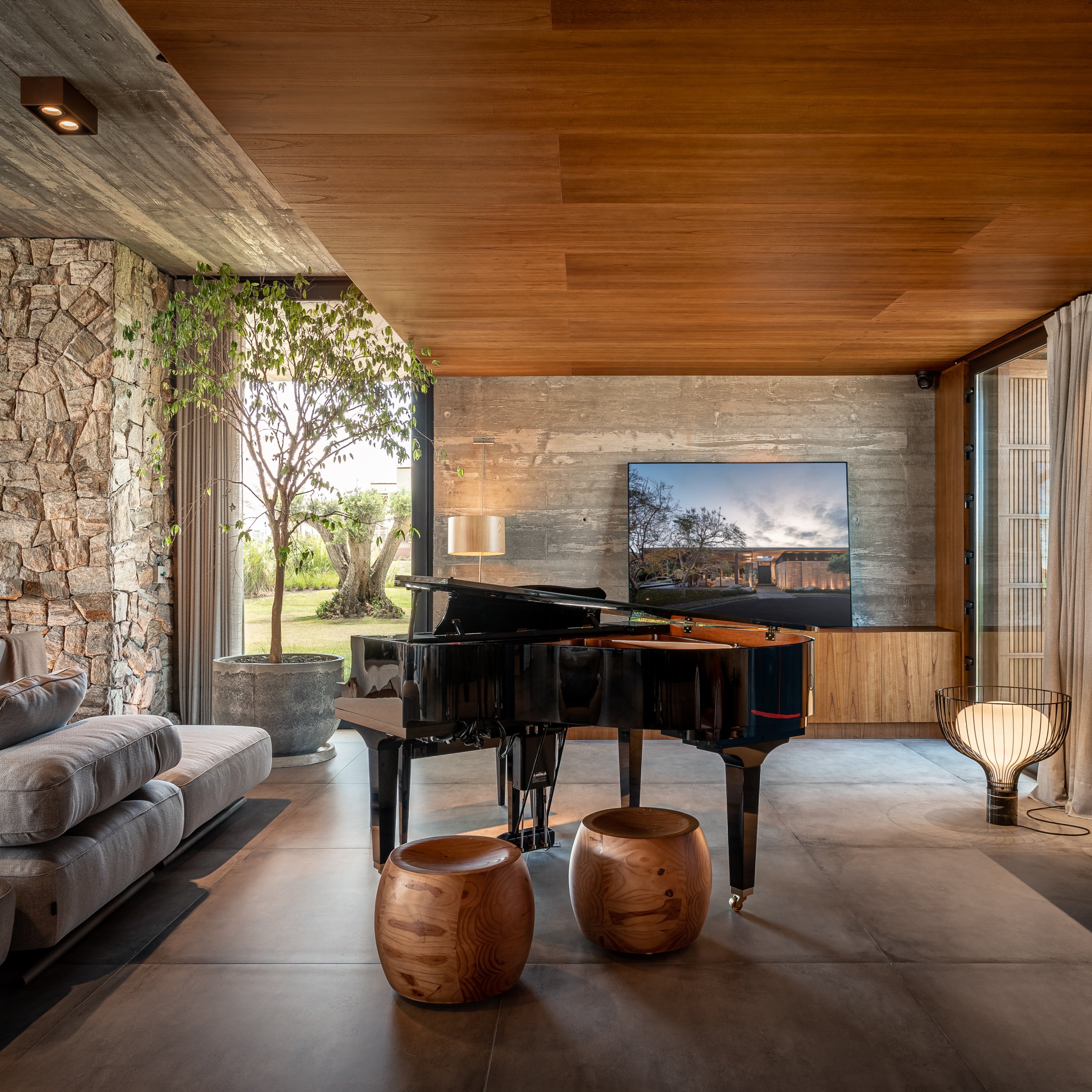 In the cladding of built elements, such as the fireplace and barbecue, we proposed the use of striking materials with personality, such as stone and corten steel. Natural fabrics and textures, predominantly in neutral tones, were used for the sofas and chairs.