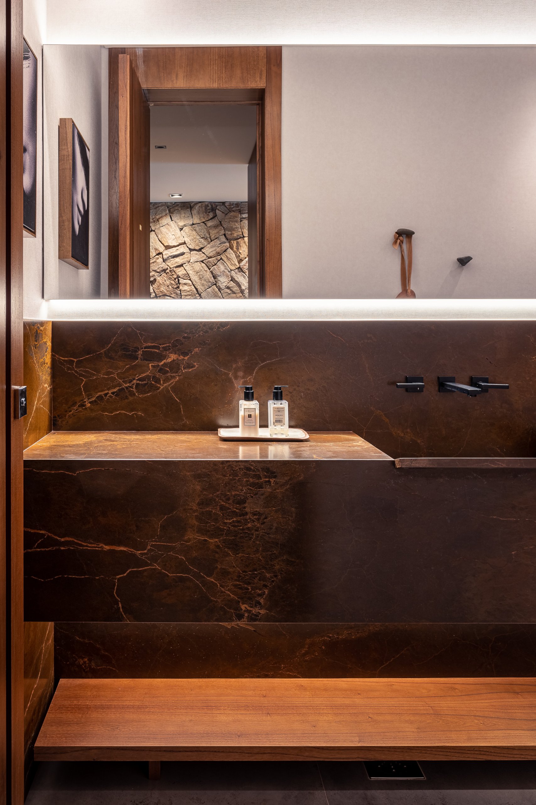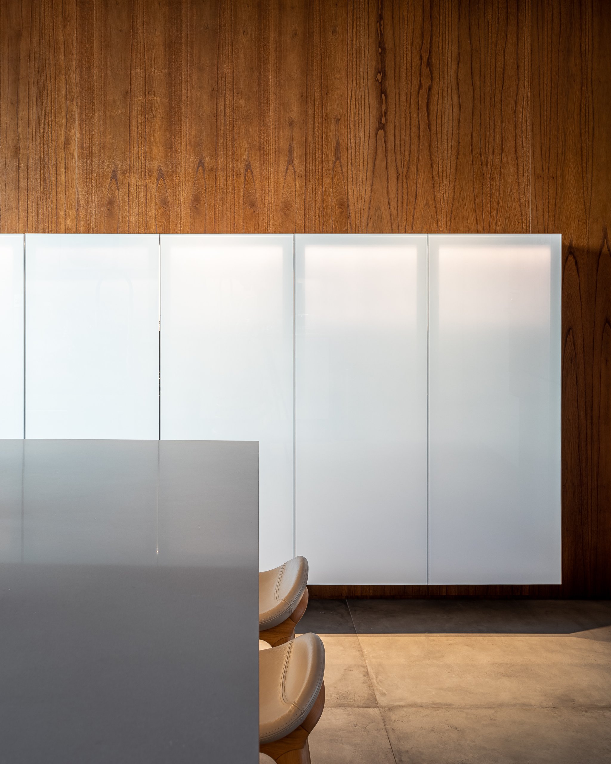 Starting from spaces with few visual barriers, we sought to create a project that would complement the initial architectural concept. We installed pieces of wood at specific points to warm up the space and bring warmth, which contrasted with strong, cold materials such as the concrete present in the walls and slabs.