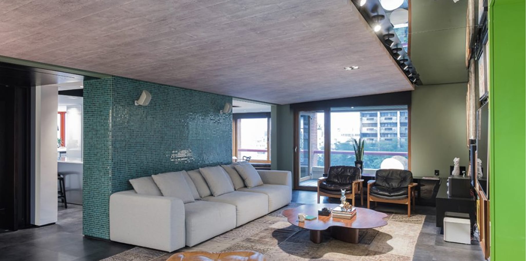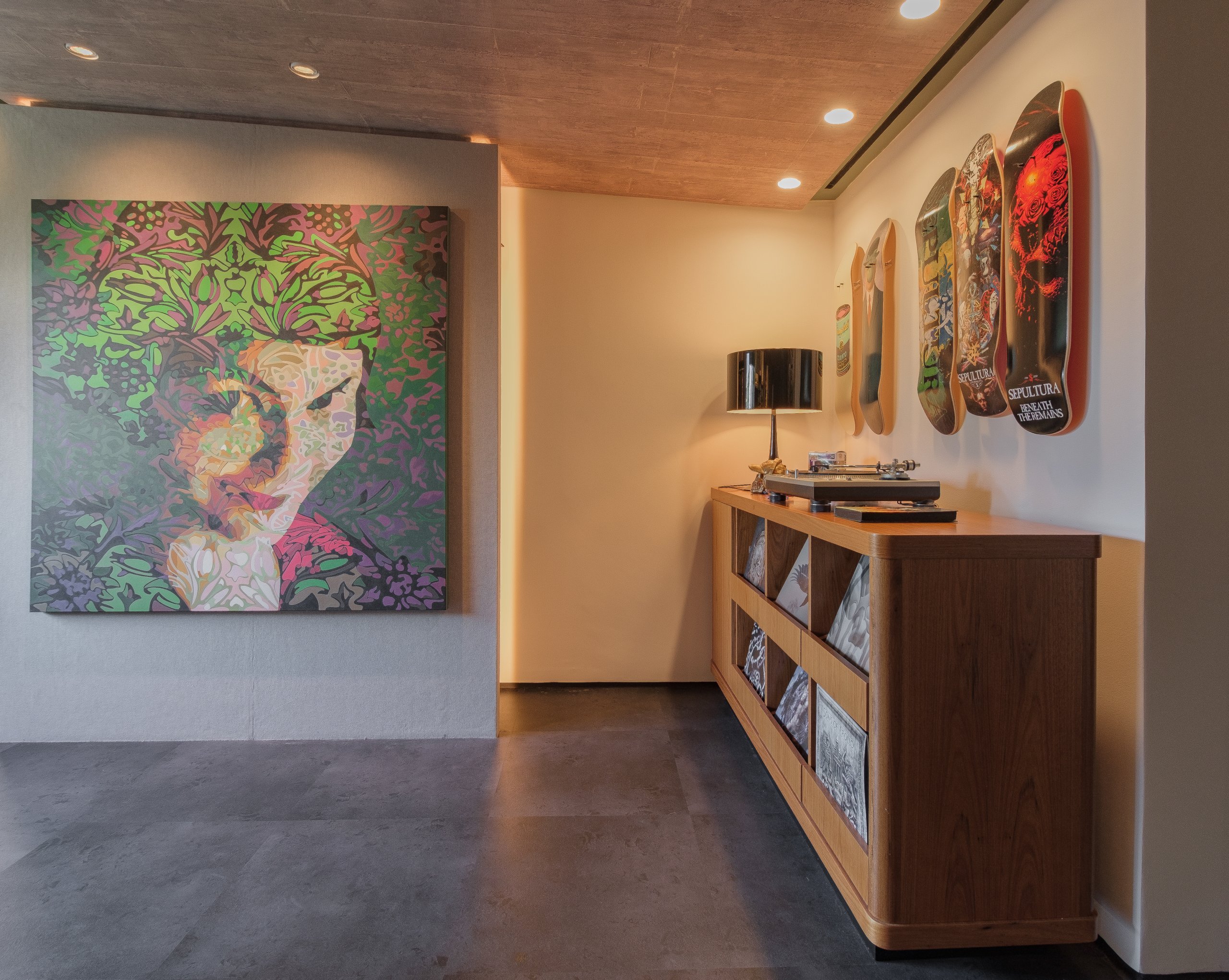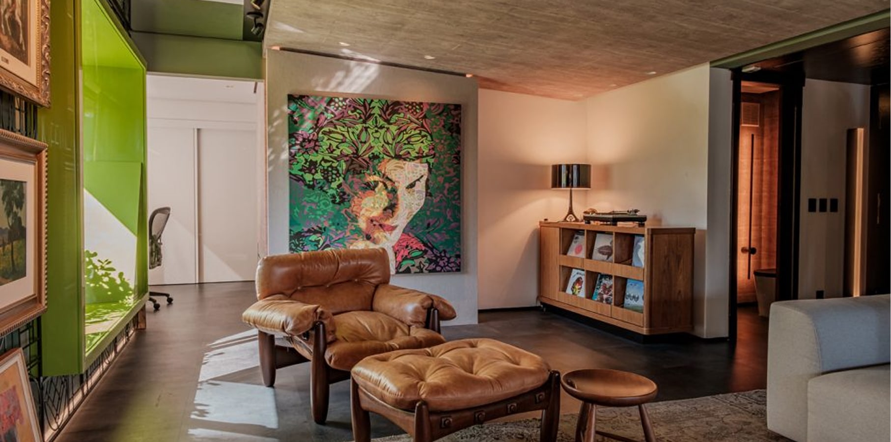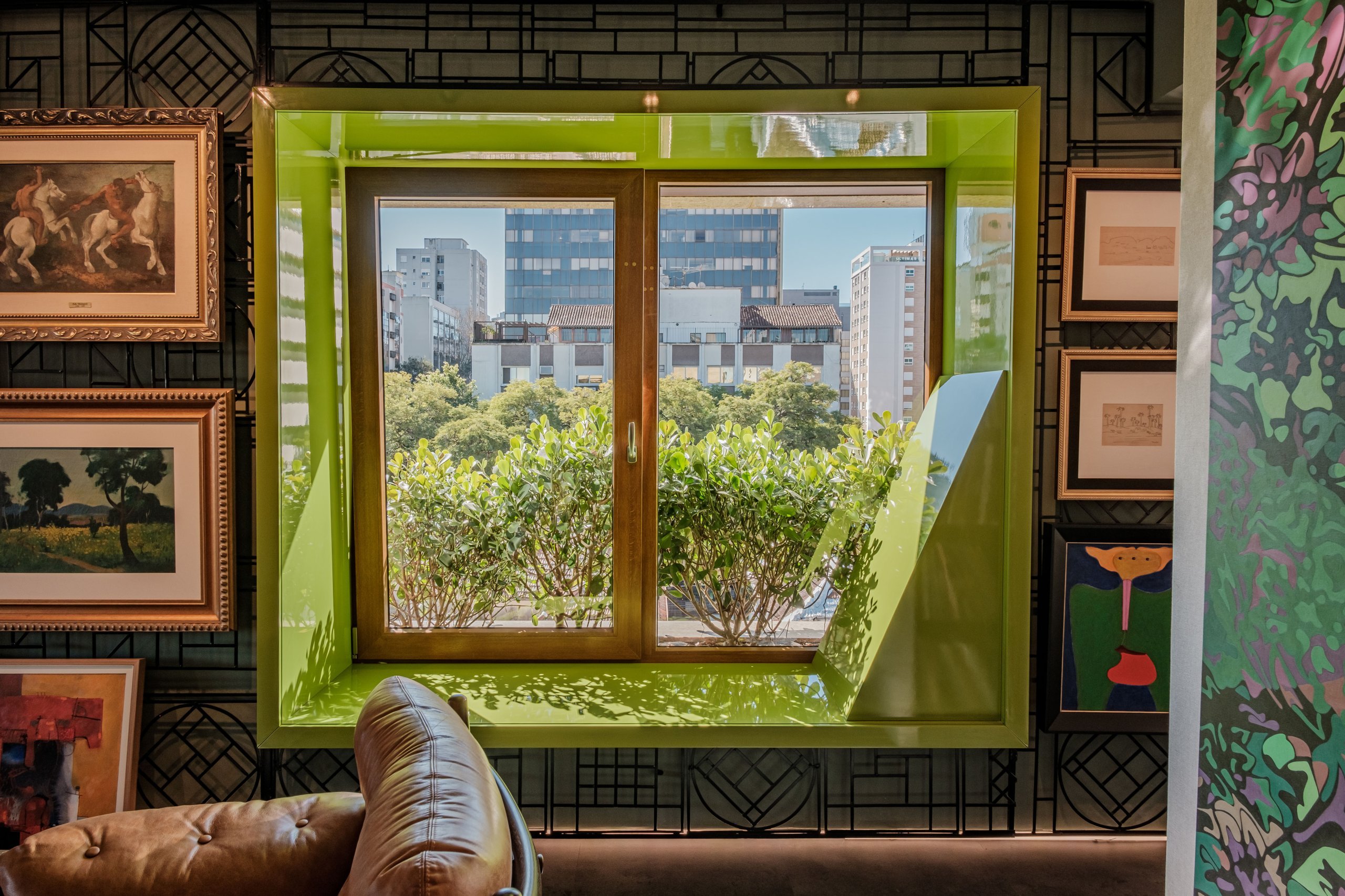 O nome é emprestado da tela de Nelson Wilbert, uma livre reprodução em óleo do cartaz que tornou famoso o filme “O Fabuloso Destino de Amélie Poulain”. De suas nuances surge a paleta de cores carregadas, com personalidade forte que pinta cada um dos espaços. A luminosidade que invade as aberturas permite uma composição de verdes, terrosos, concreto e preto. No estar principal, a parede de destaque se converte em homenagem à coleção de arte.