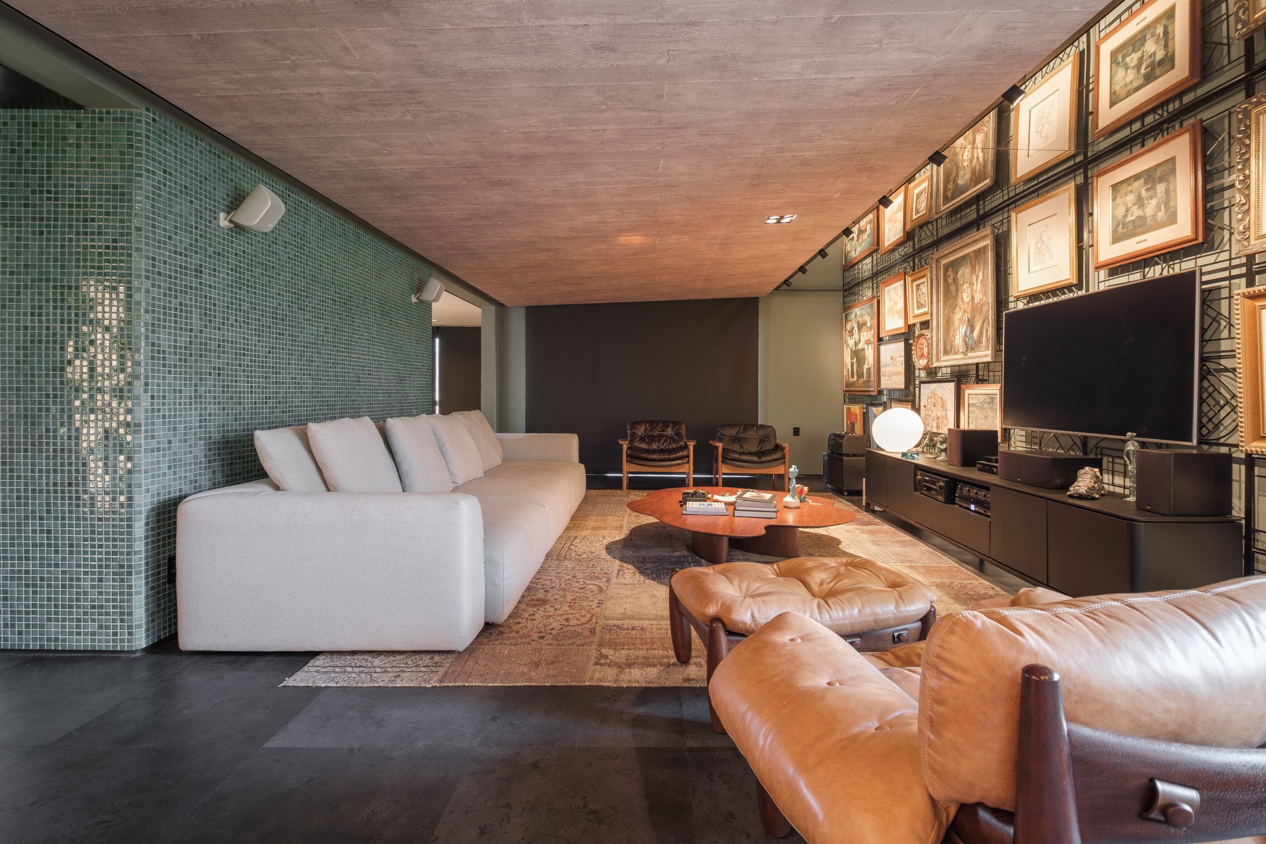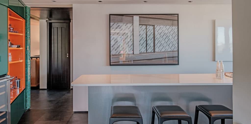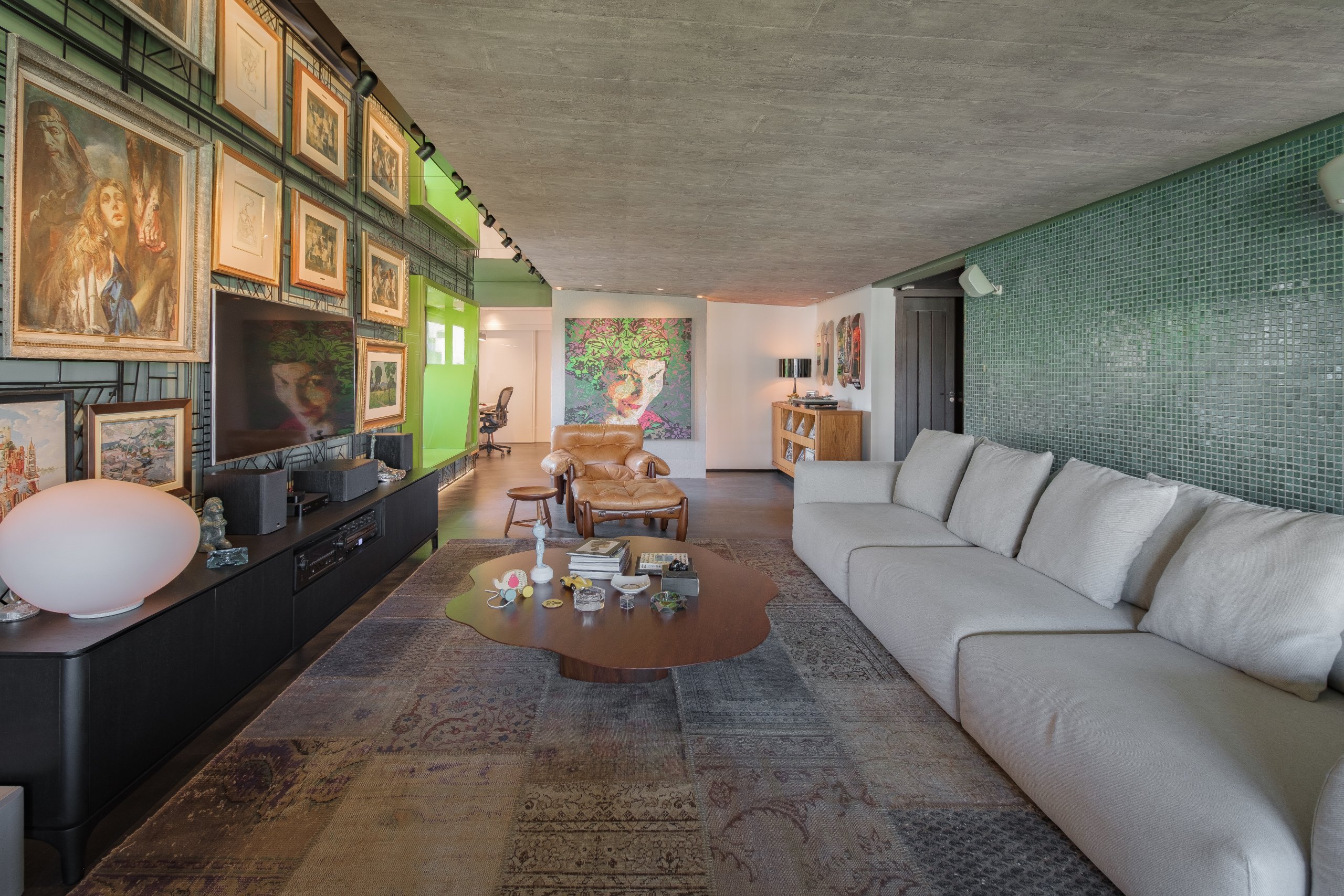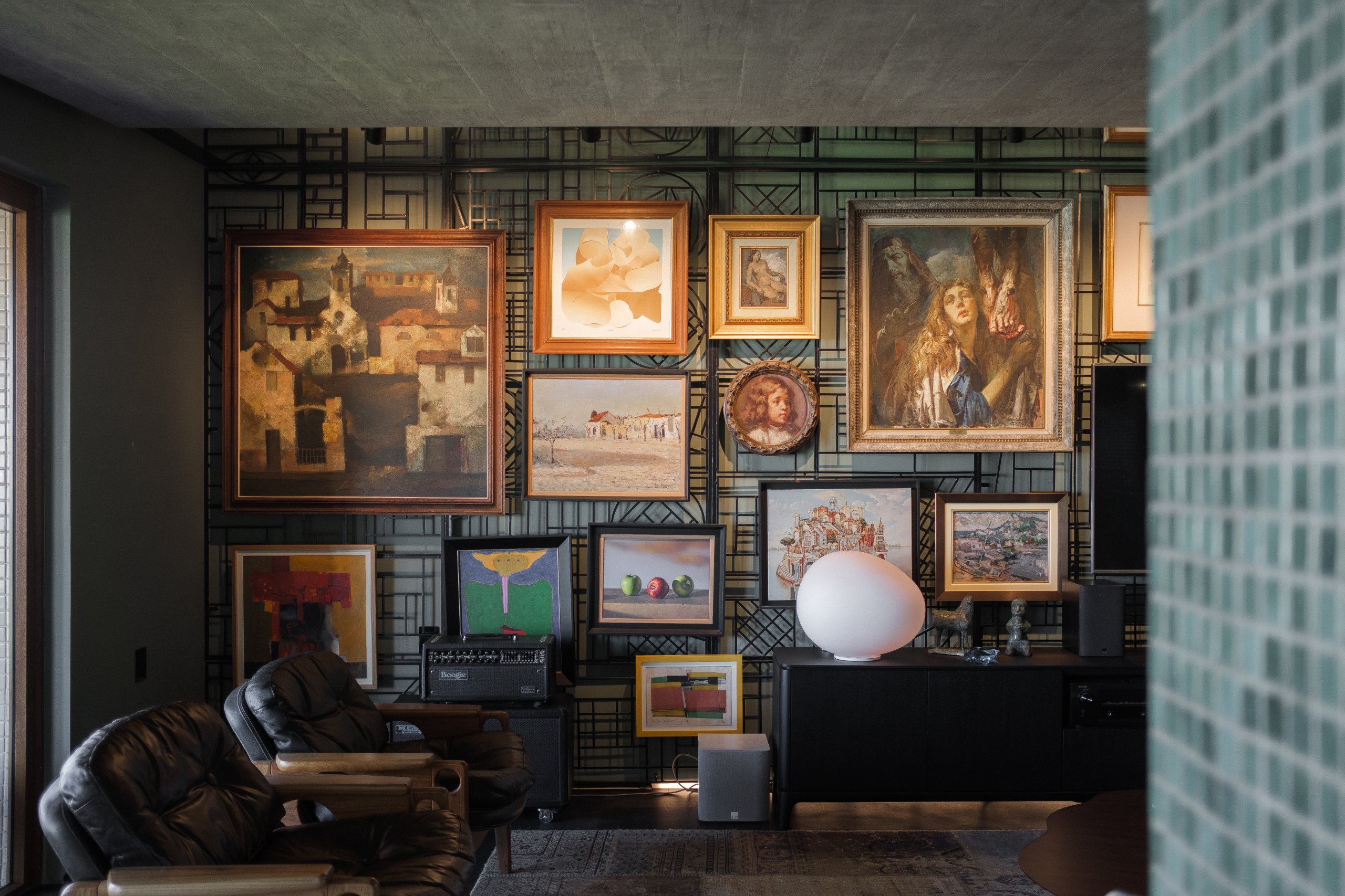 Sua intenção é a versatilidade, permitindo um rearranjo prático das peças para receber aquisições sempre que uma nova paixão surgir. Para obras que narram histórias, uma parede verdadeiramente viva. Acima dela, um espelho horizontal cria a ilusão de altura infinita.