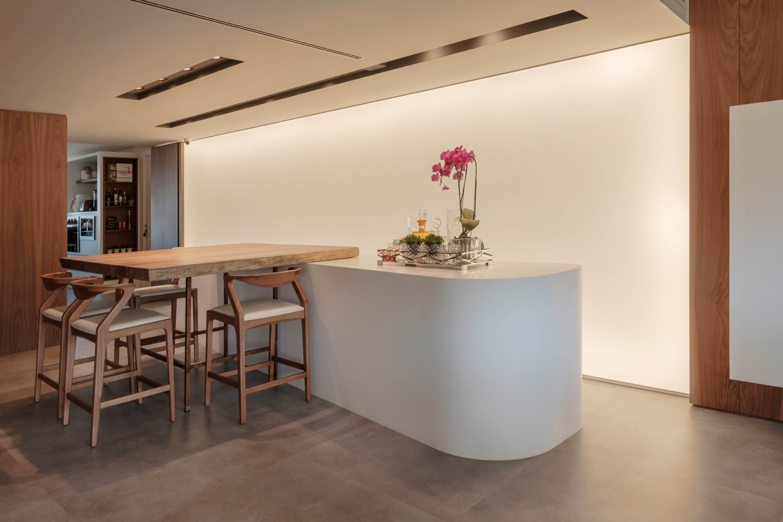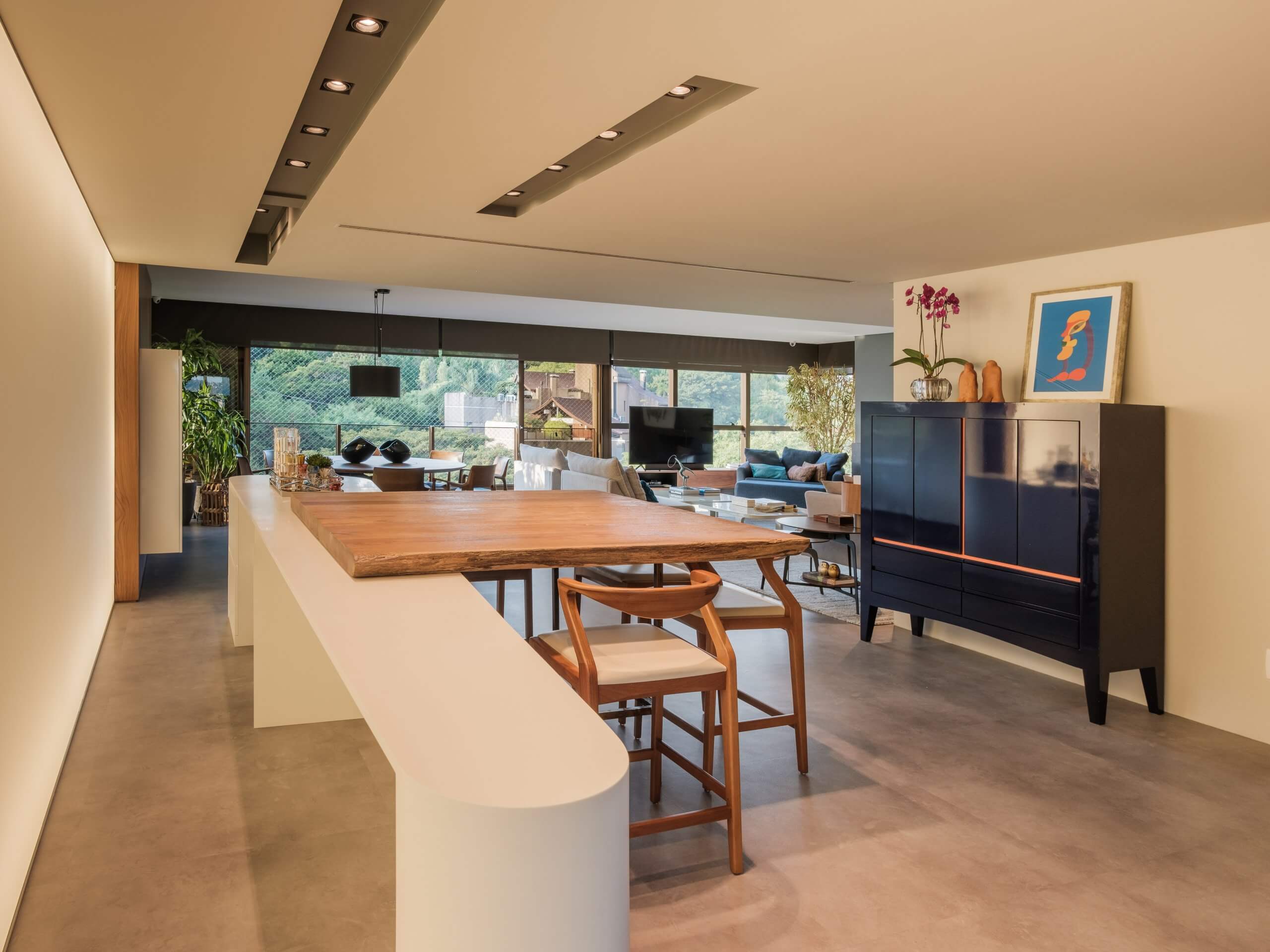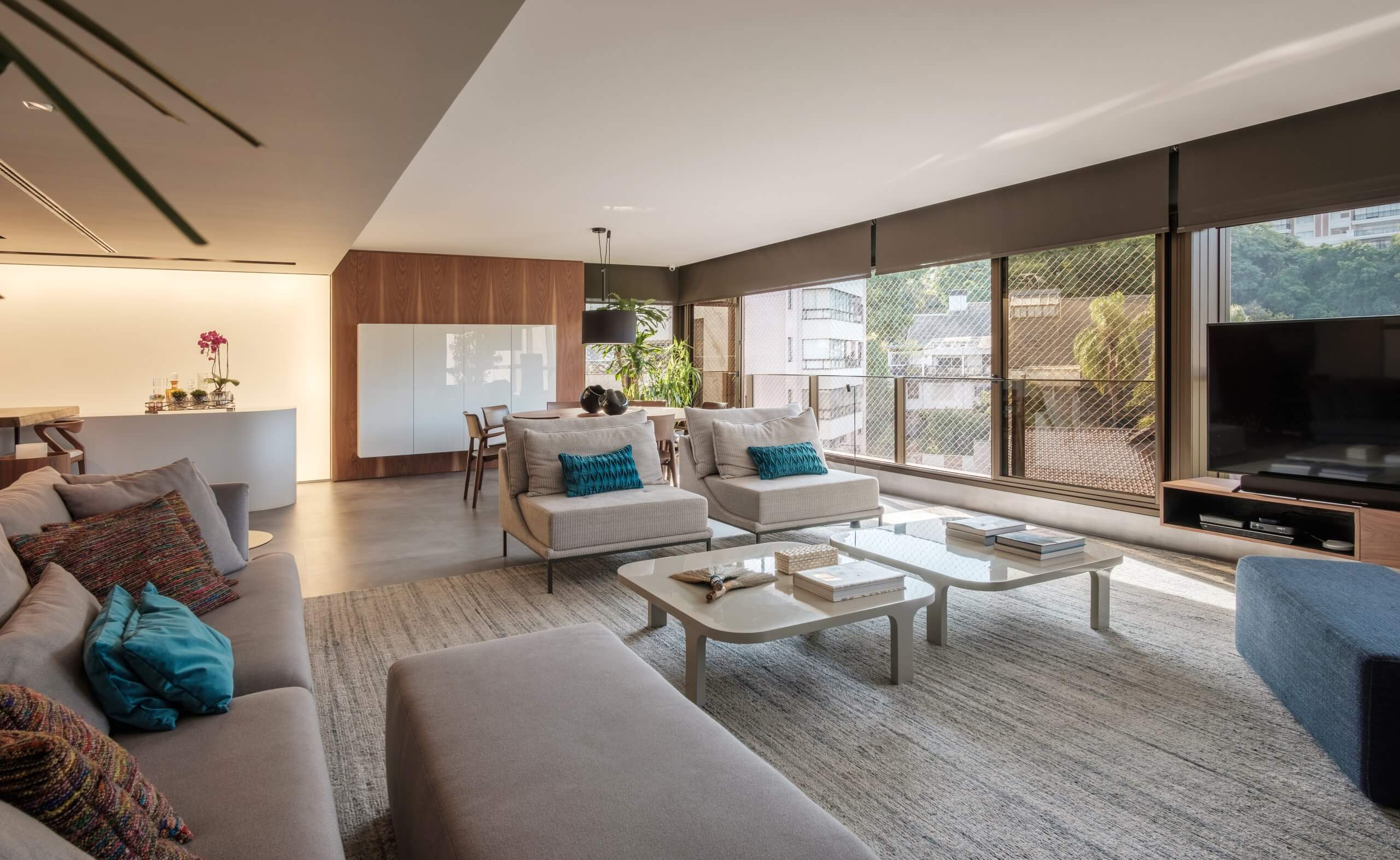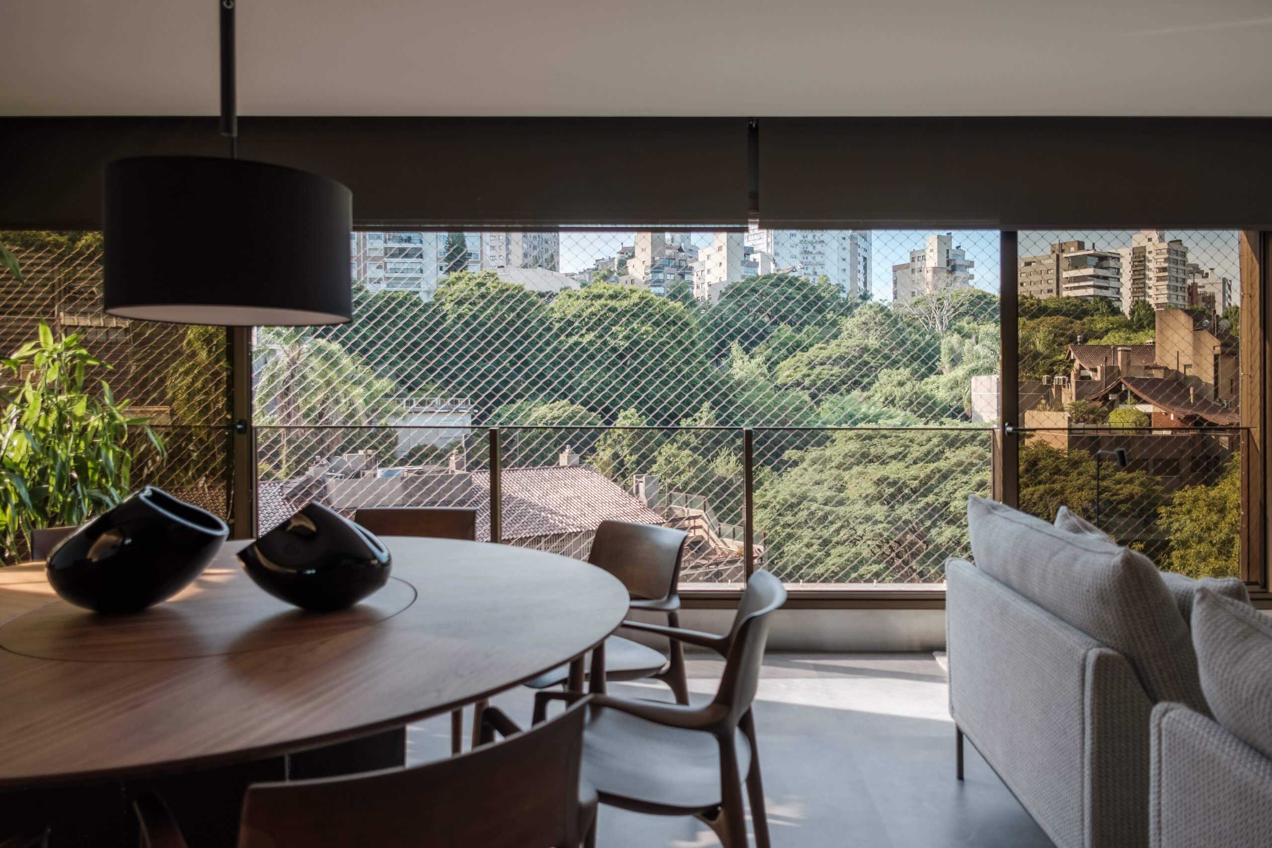 Os interiores deste apartamento, situado no bairro Bela Vista, em Porto Alegre, foram projetados para um jovem casal com uma filha pequena. Um dos desafios foi harmonizar a preferência do proprietário, arquiteto, pelo estilo contemporâneo, e de sua esposa pelo clássico. A solução foi brincar com o contraste de elementos, como na paleta de tons sóbrios, cinzas e azuis, inserir o bar berinjela e laranja. O painel em nogueira é interrompido pela parede retroiluminada num jogo de claro e escuro.