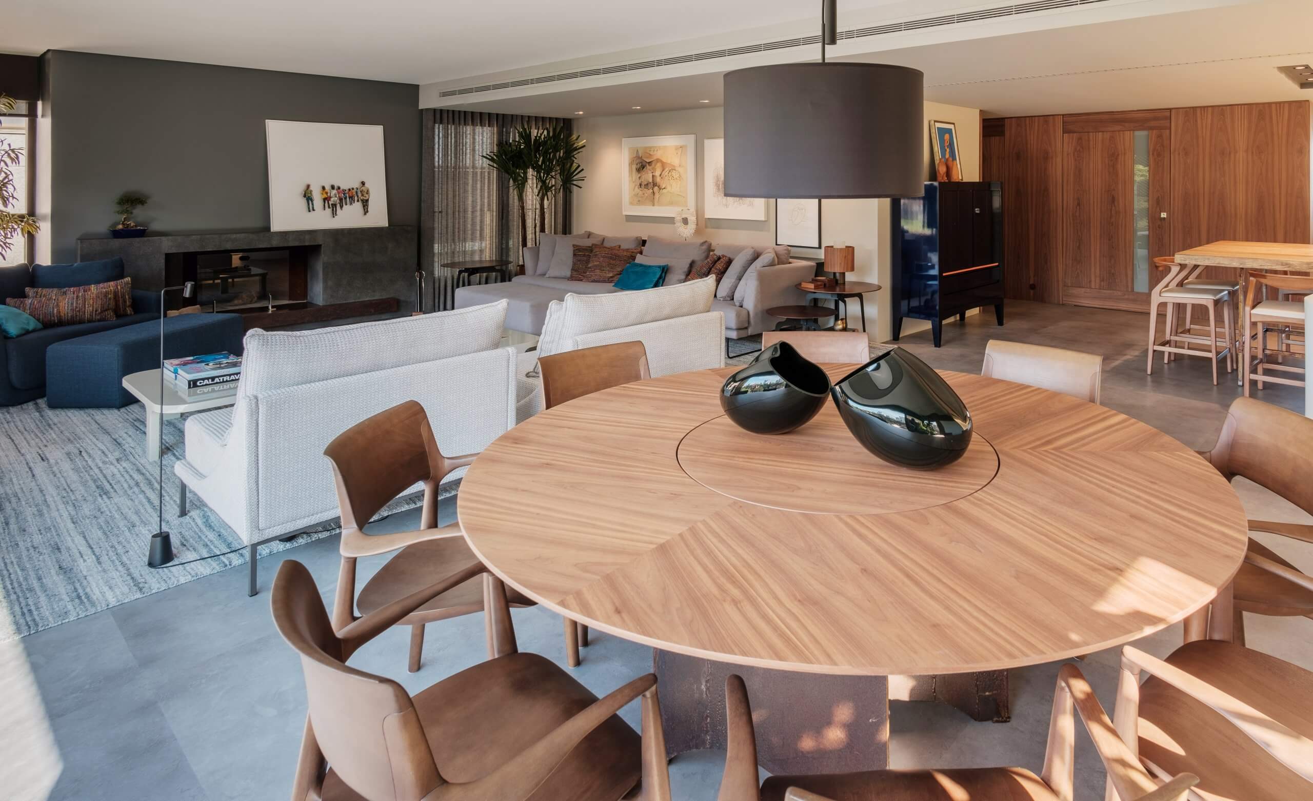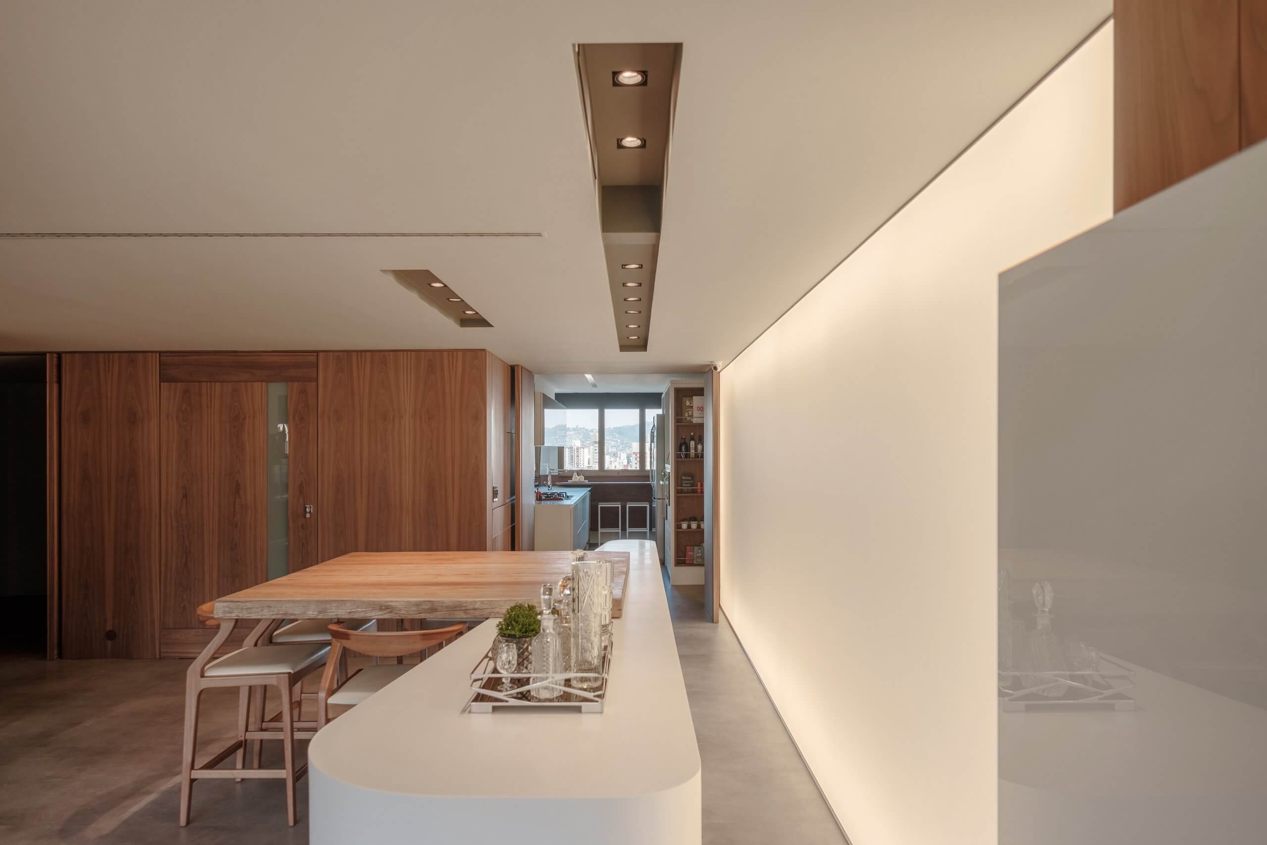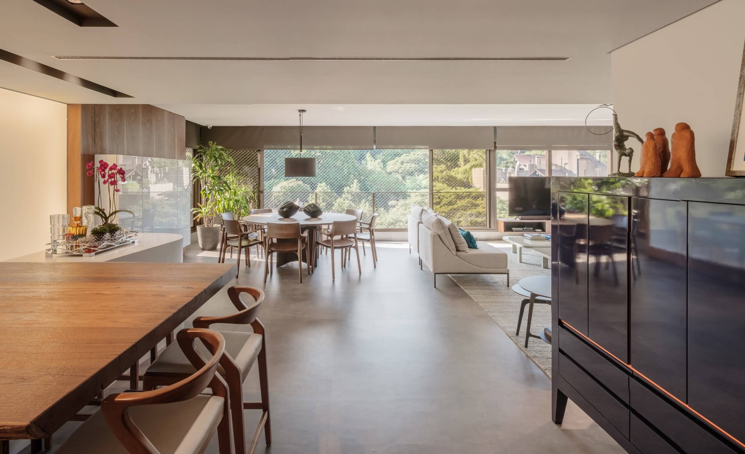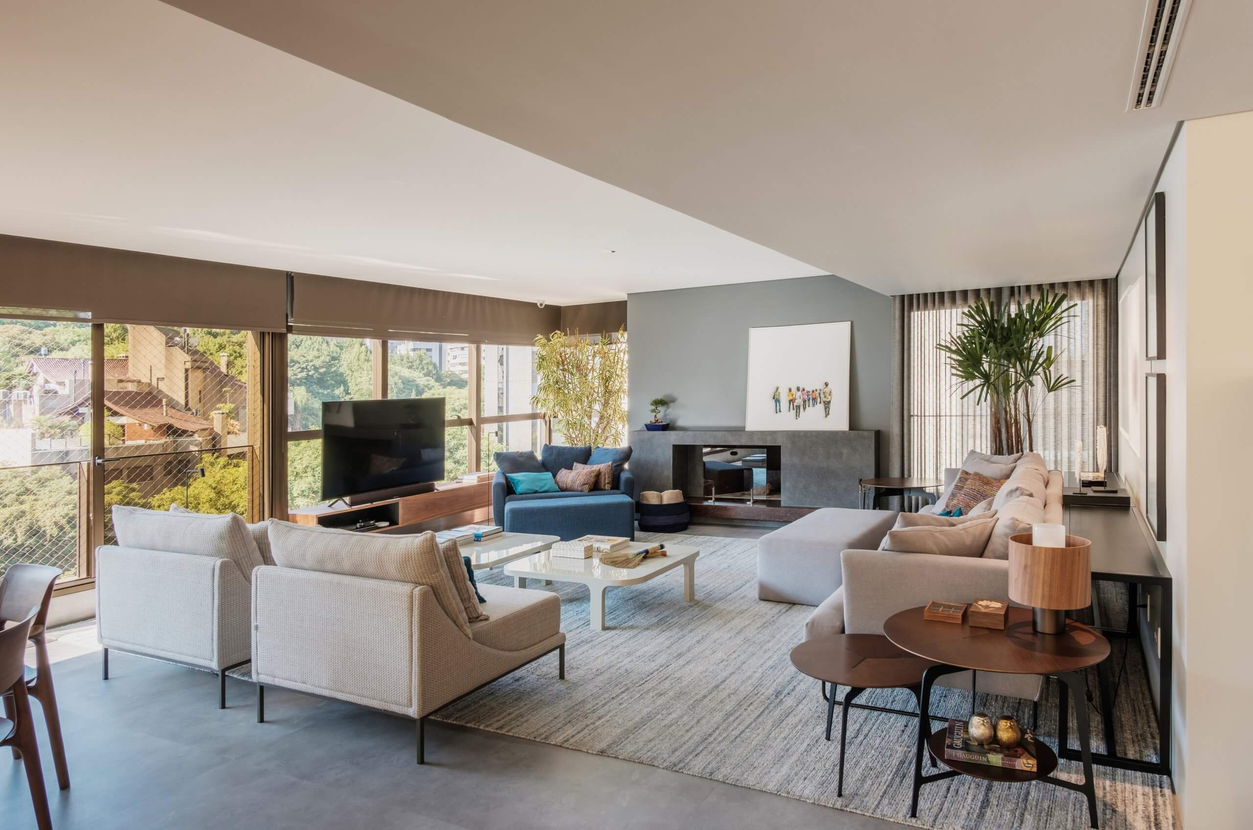 Os interiores deste apartamento, situado no bairro Bela Vista, em Porto Alegre, foram projetados para um jovem casal com uma filha pequena. Um dos desafios foi harmonizar a preferência do proprietário, arquiteto, pelo estilo contemporâneo, e de sua esposa pelo clássico. A solução foi brincar com o contraste de elementos, como na paleta de tons sóbrios, cinzas e azuis, inserir o bar berinjela e laranja. O painel em nogueira é interrompido pela parede retroiluminada num jogo de claro e escuro.