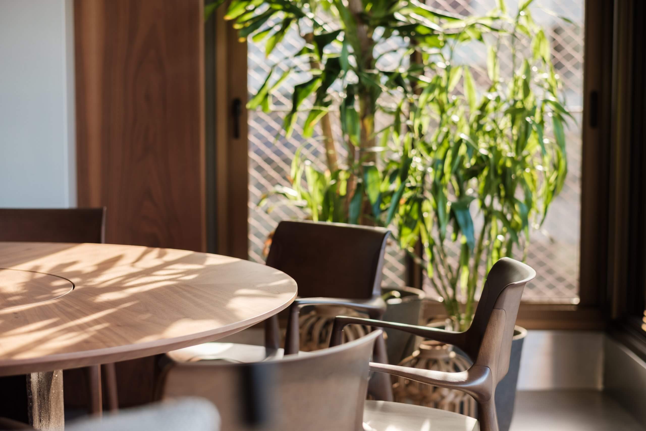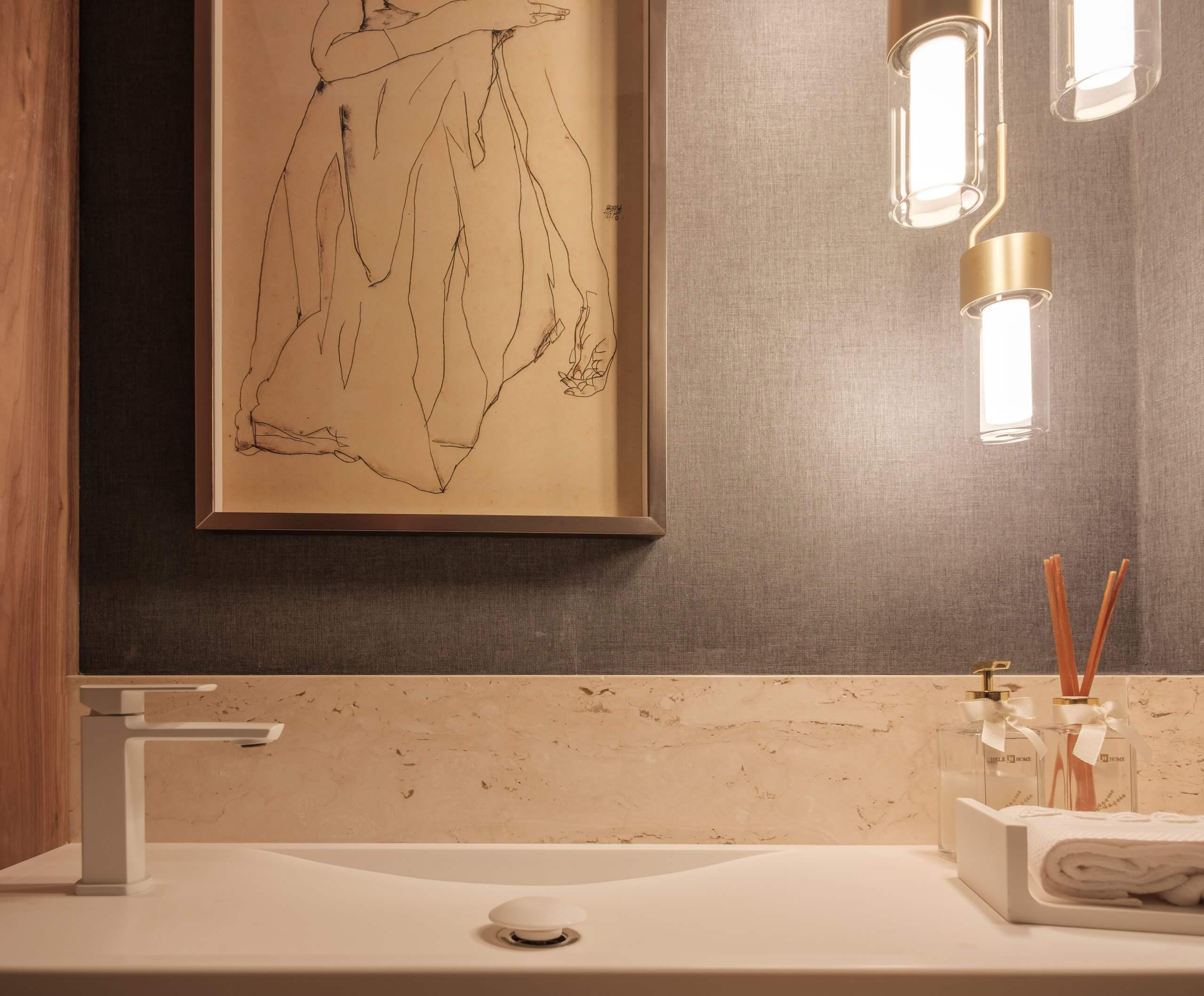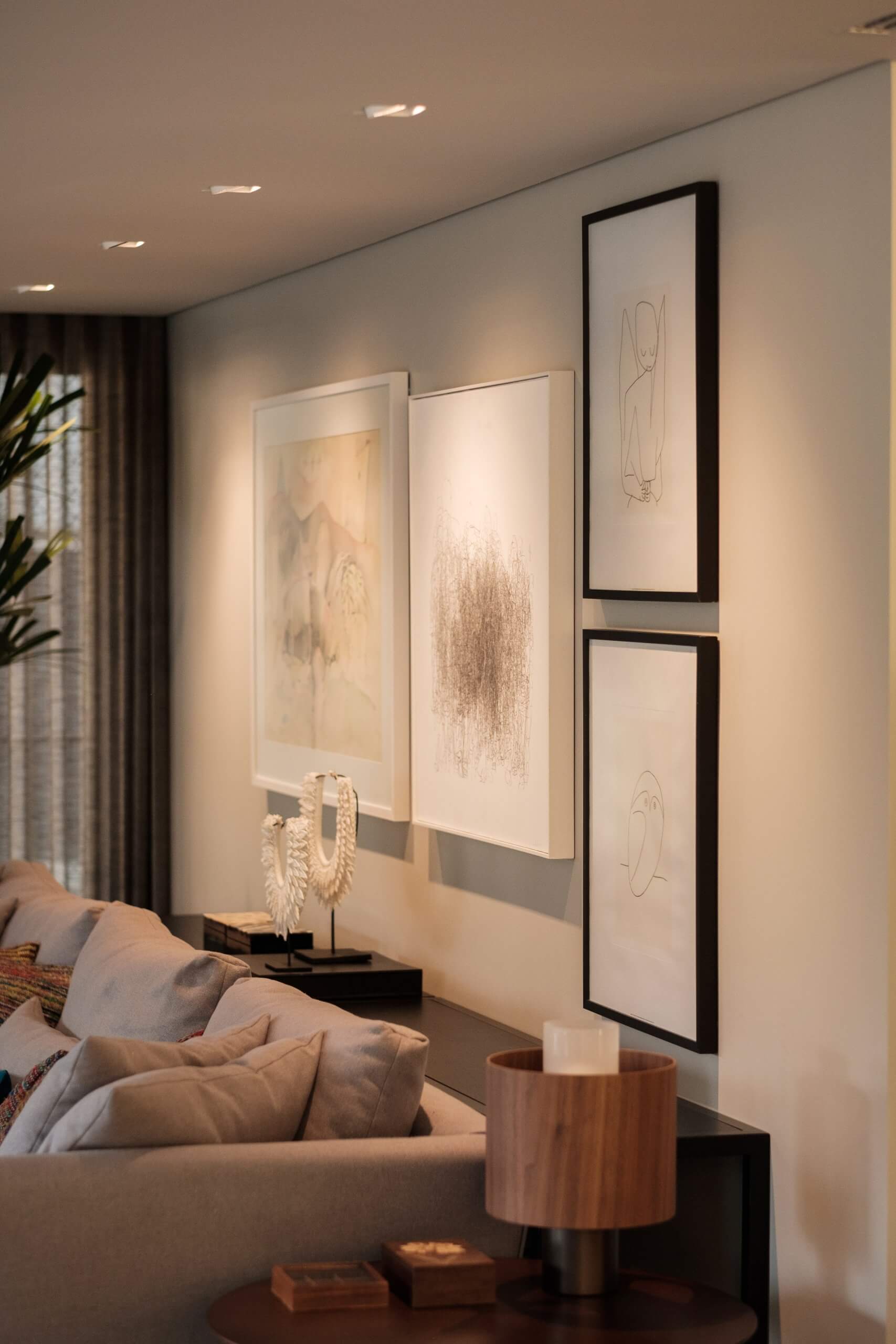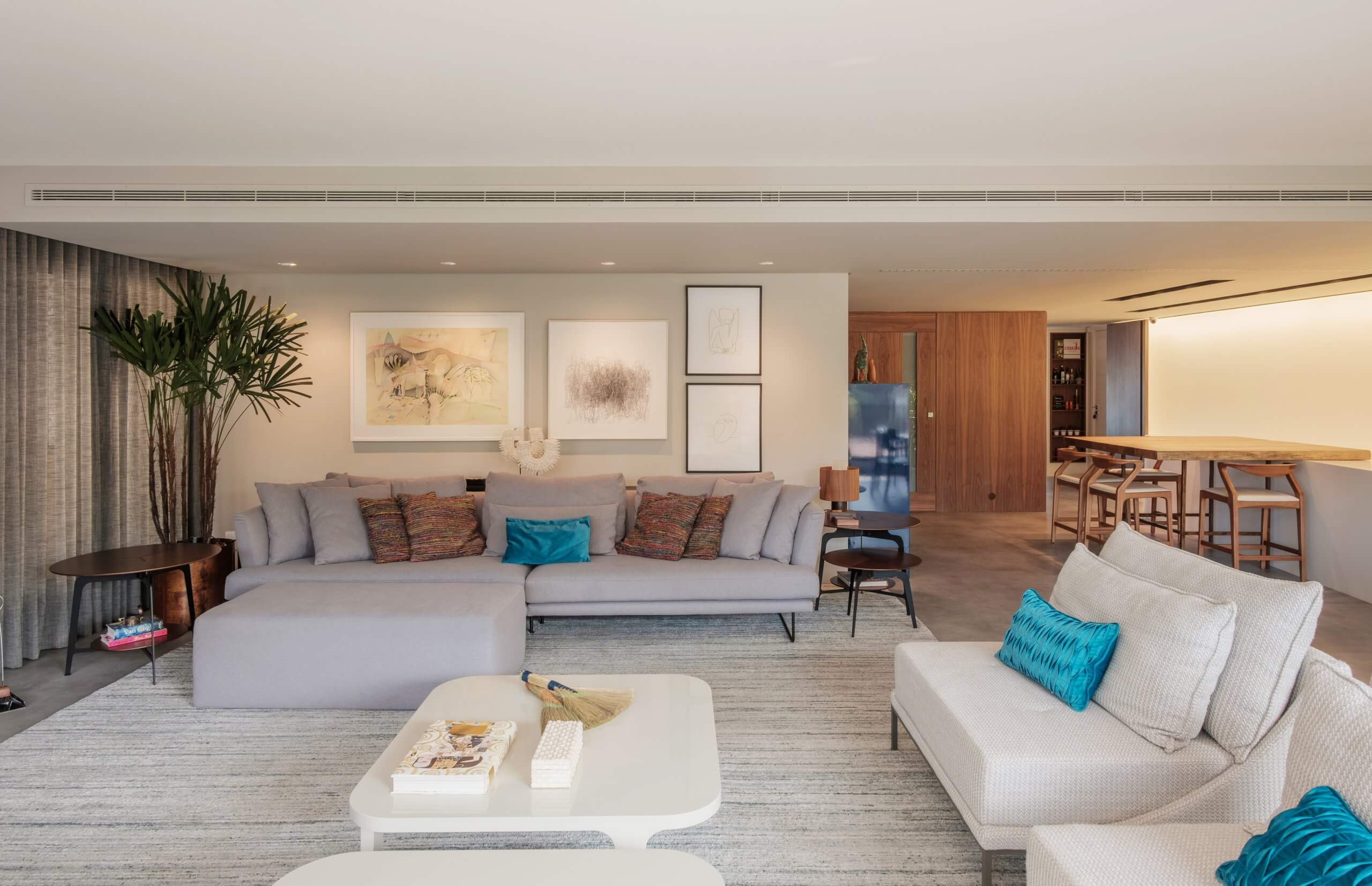 Os interiores deste apartamento, situado no bairro Bela Vista, em Porto Alegre, foram projetados para um jovem casal com uma filha pequena. Um dos desafios foi harmonizar a preferência do proprietário, arquiteto, pelo estilo contemporâneo, e de sua esposa pelo clássico. A solução foi brincar com o contraste de elementos, como na paleta de tons sóbrios, cinzas e azuis, inserir o bar berinjela e laranja. O painel em nogueira é interrompido pela parede retroiluminada num jogo de claro e escuro.