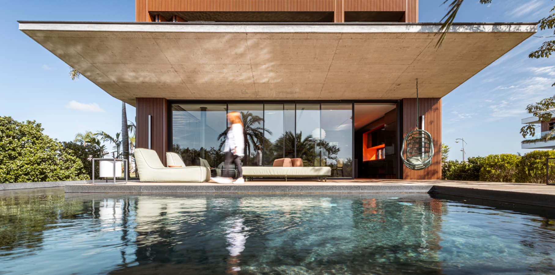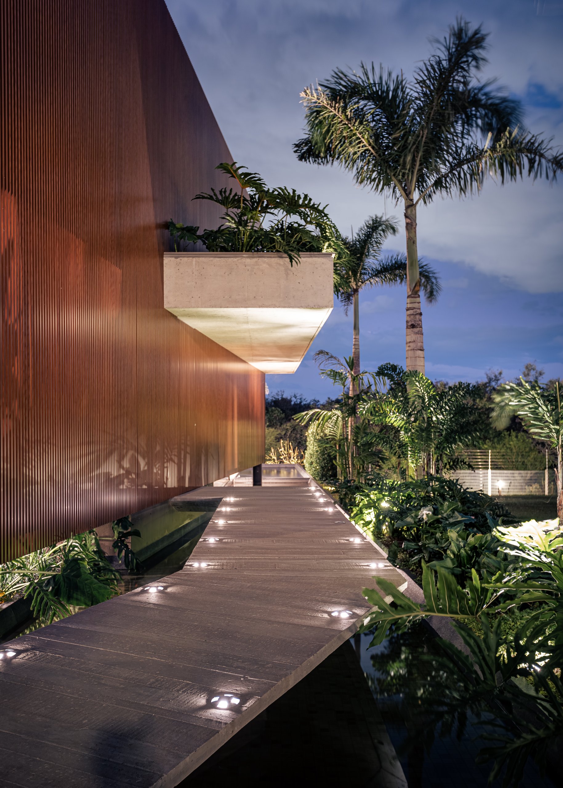 A volumetria é refletida na piscina e no espelho d’água que circundam a residência, sobre o qual uma passarela encaminha o pedestre desde o passeio até a porta de entrada. Para conferir leveza, a piscina foi implantada em um patamar suavemente suspenso sob o jardim.