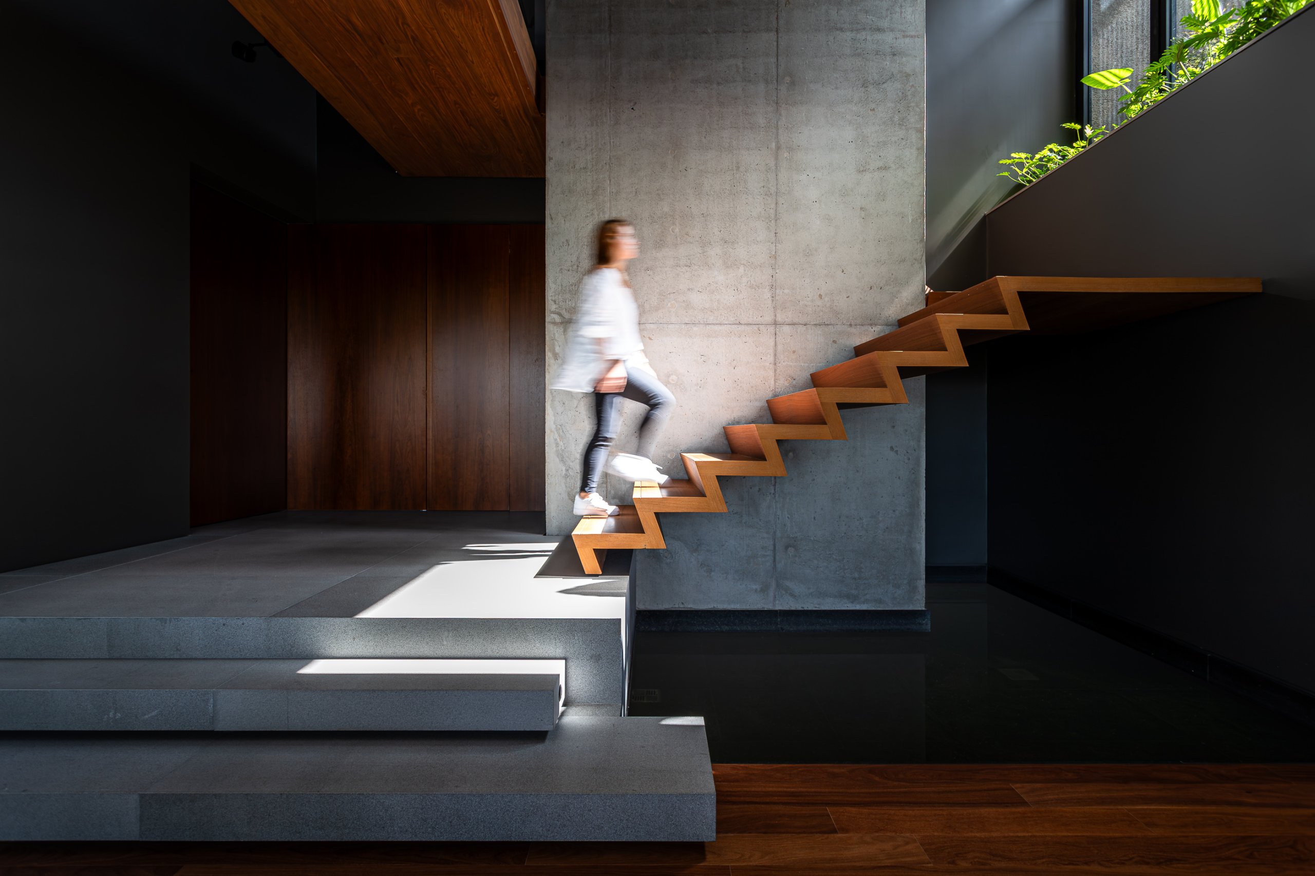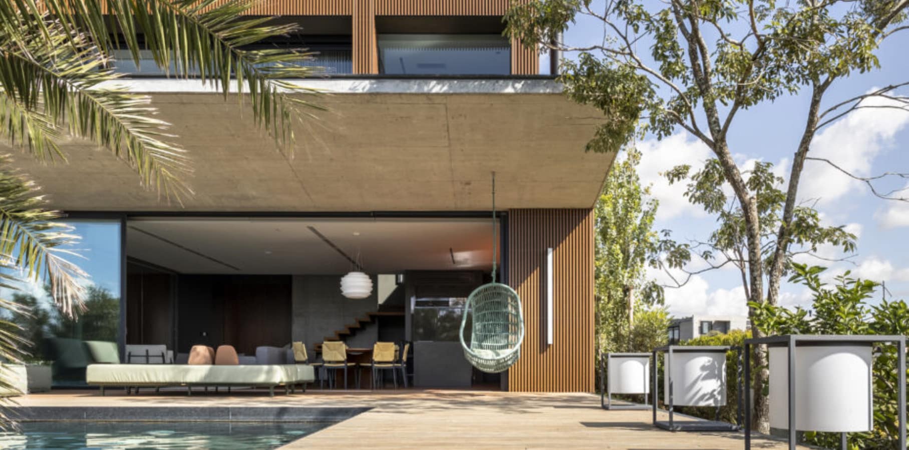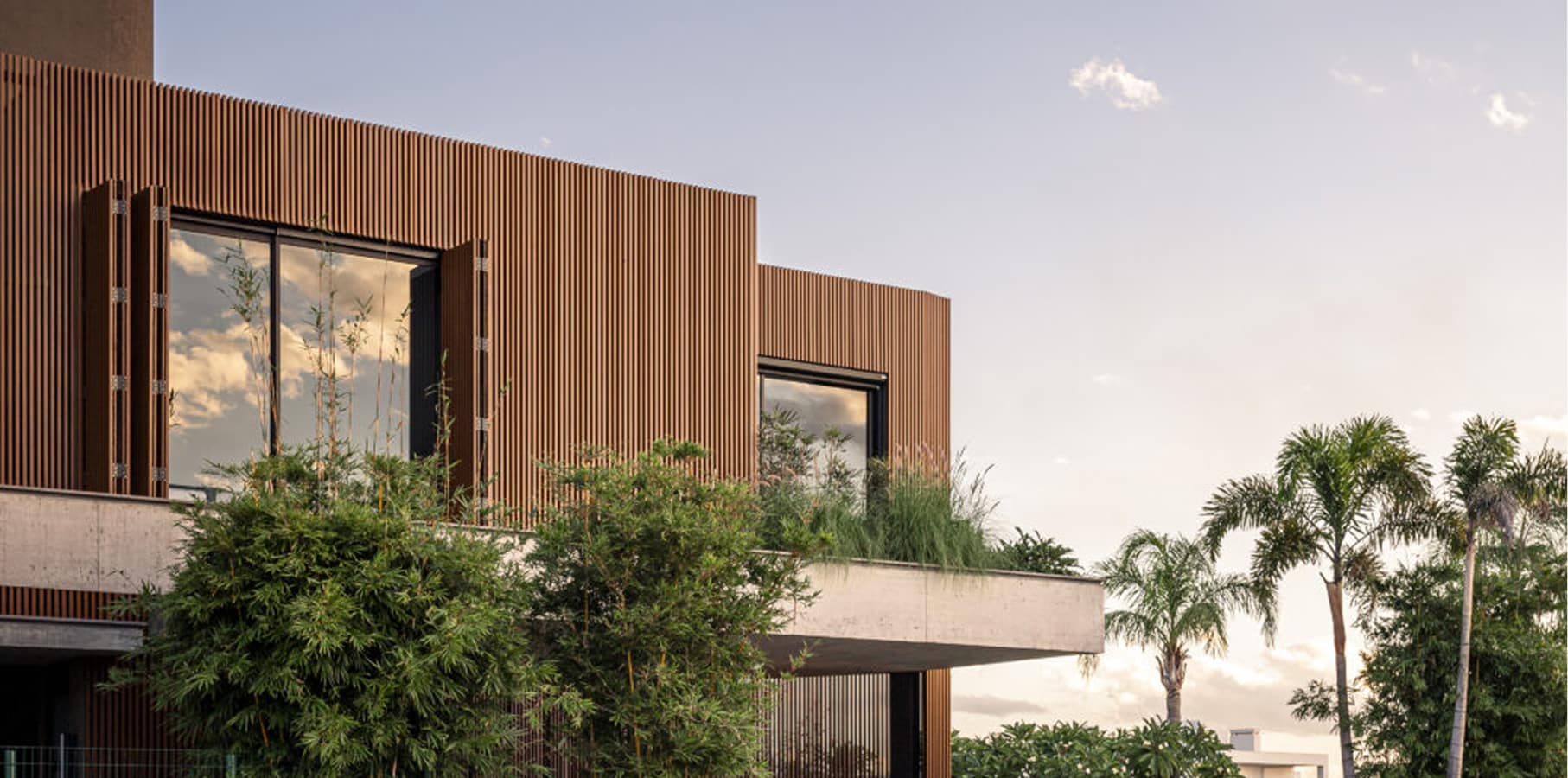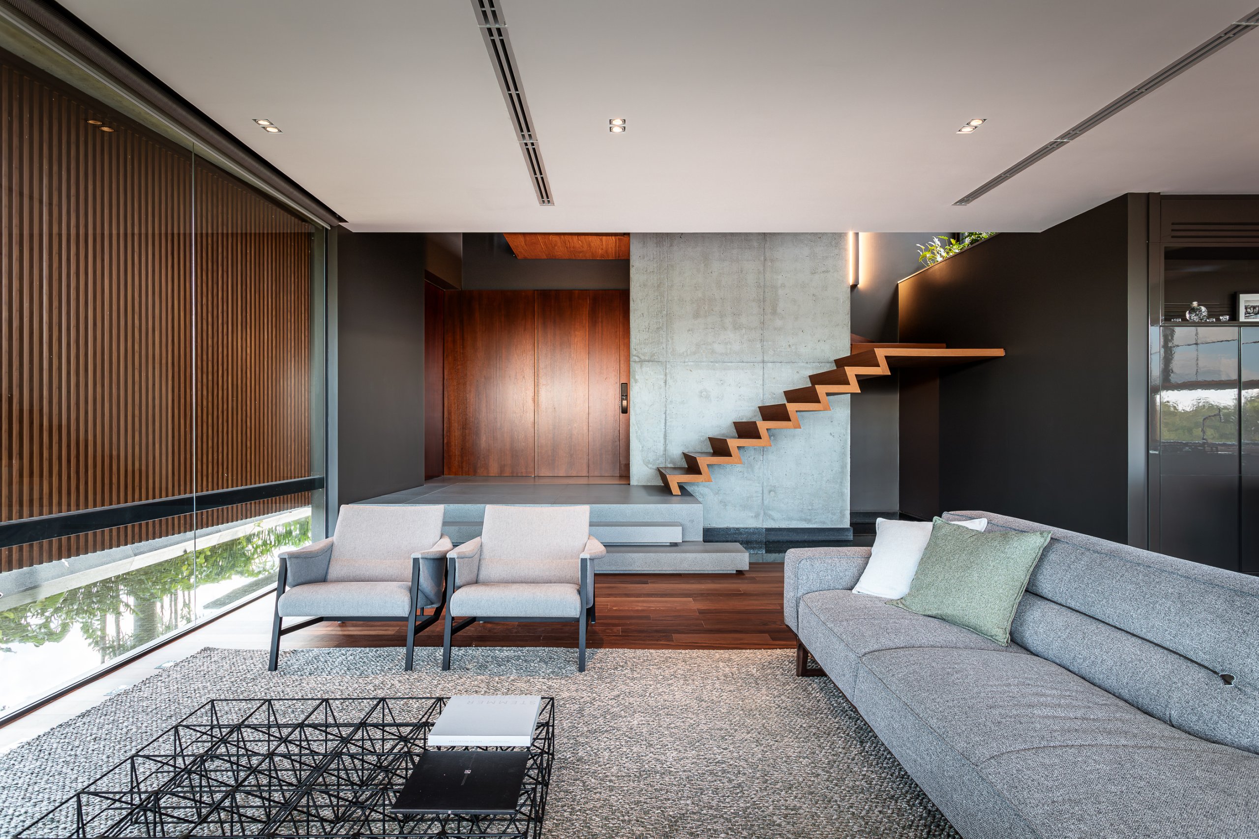 O exterior da casa é revestido por um grande painel em perfis de alumínio com acabamento amadeirado, interrompidos por lâminas horizontais de concreto aparente, que trazem o verde para junto da residência. No interior, foram selecionados elementos em uma paleta de cores única, com tons de cinza e detalhes em laranja.