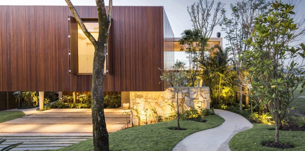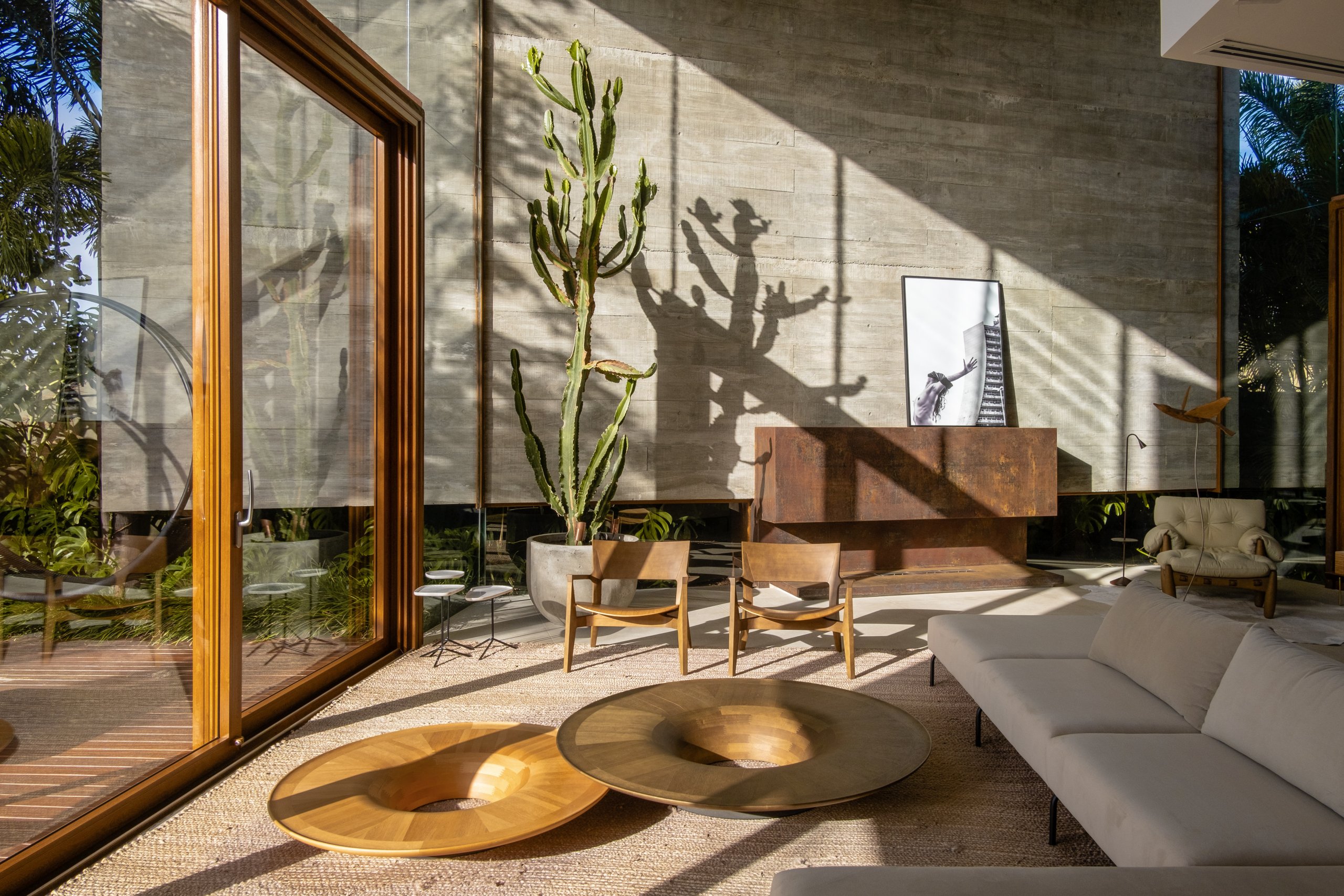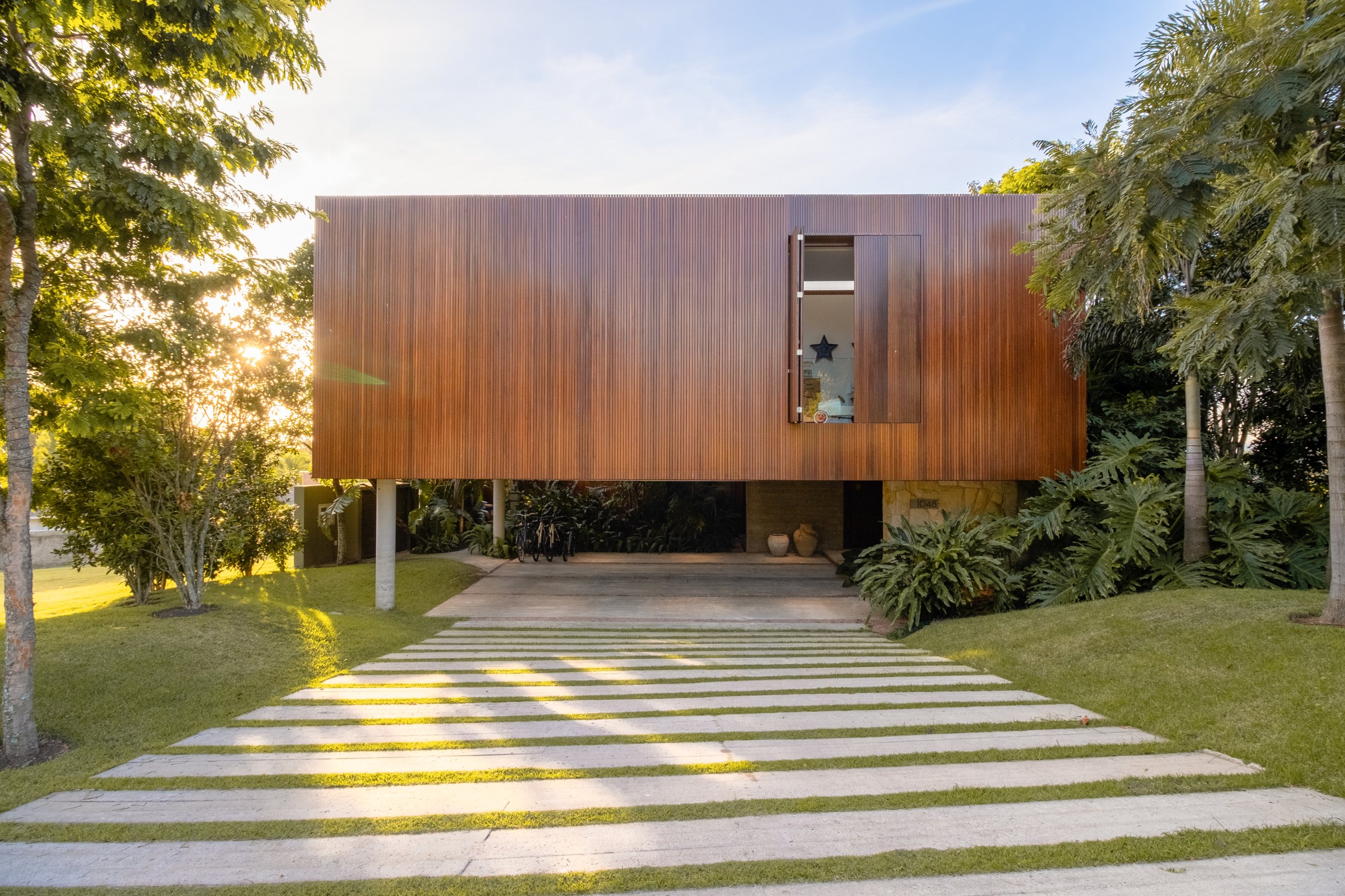 Em um lote elevado no condomínio Terraville, em Porto Alegre, com vista para o campo de golf, a sensação de privacidade e isolamento foi o ponto de partida. A casa se ergue em três blocos distintos: a fachada frontal é o primeiro, em um cubo revestido de madeira que flutua sobre a garagem aberta e abriga as suítes dos filhos. O living se estende a partir da entrada em outro volume, com parede lateral e teto em concreto aparente.