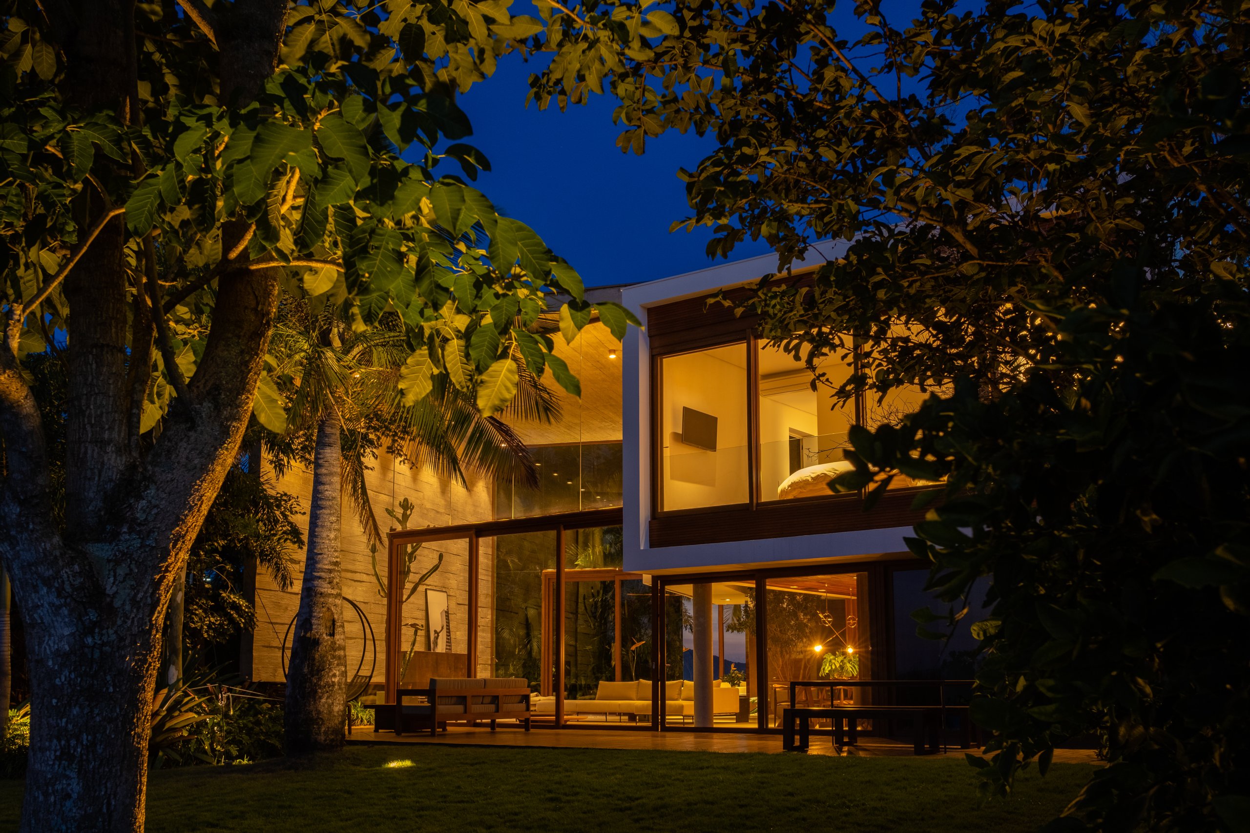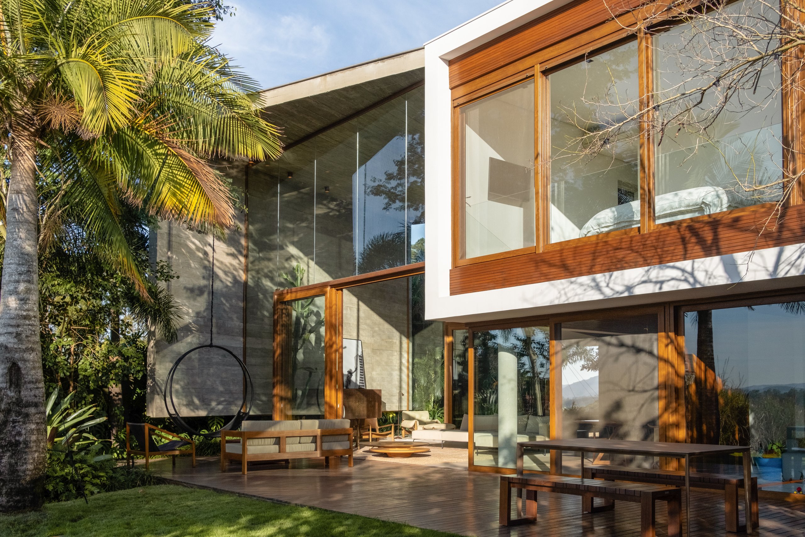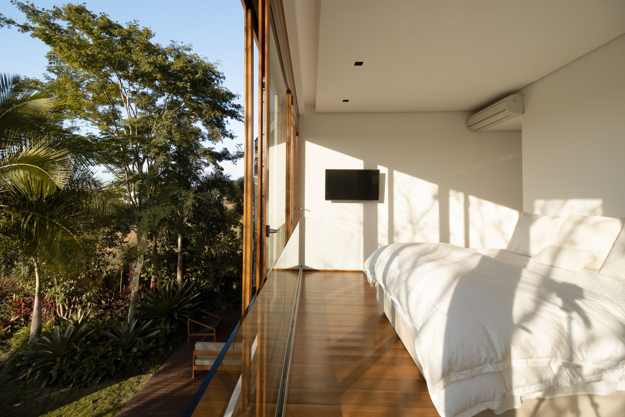 Todo o espaço é permeado por painéis de vidro, descortinando a vista para as árvores do jardim. O terceiro volume, em alvenaria branca, tem dois pavimentos: o inferior concentra a área de serviço, cozinha e brinquedoteca. No superior está a suíte do casal, à parte das demais.