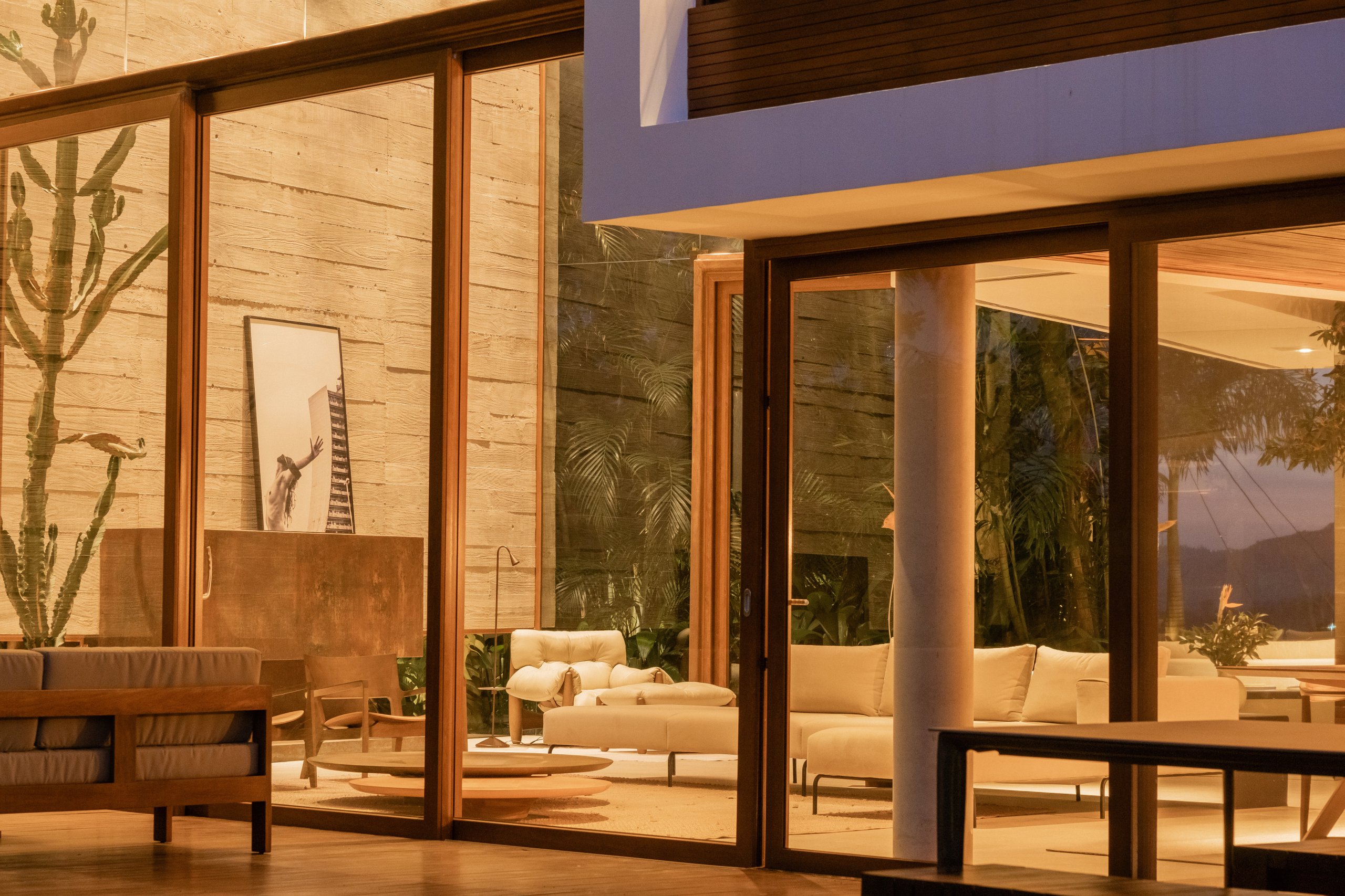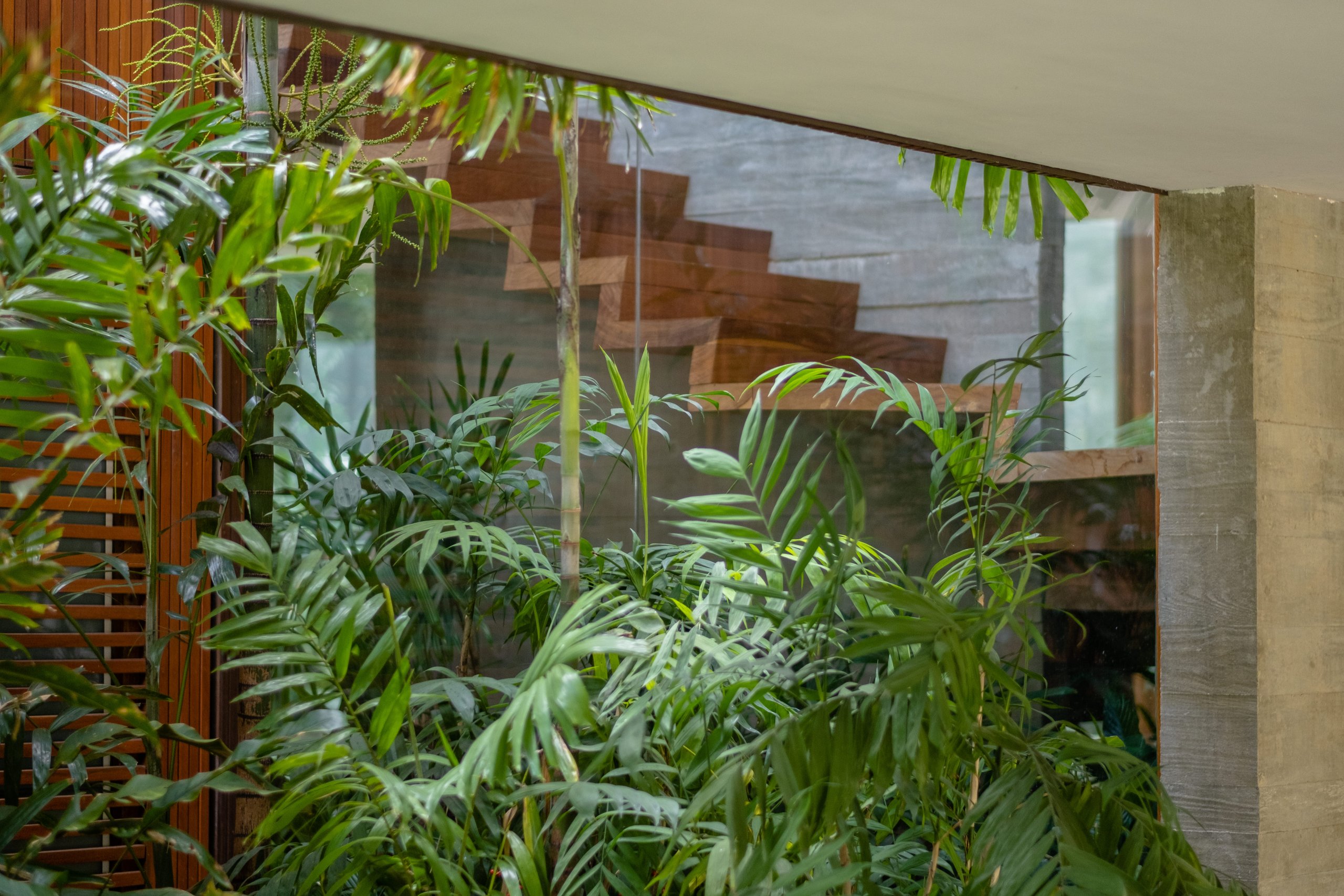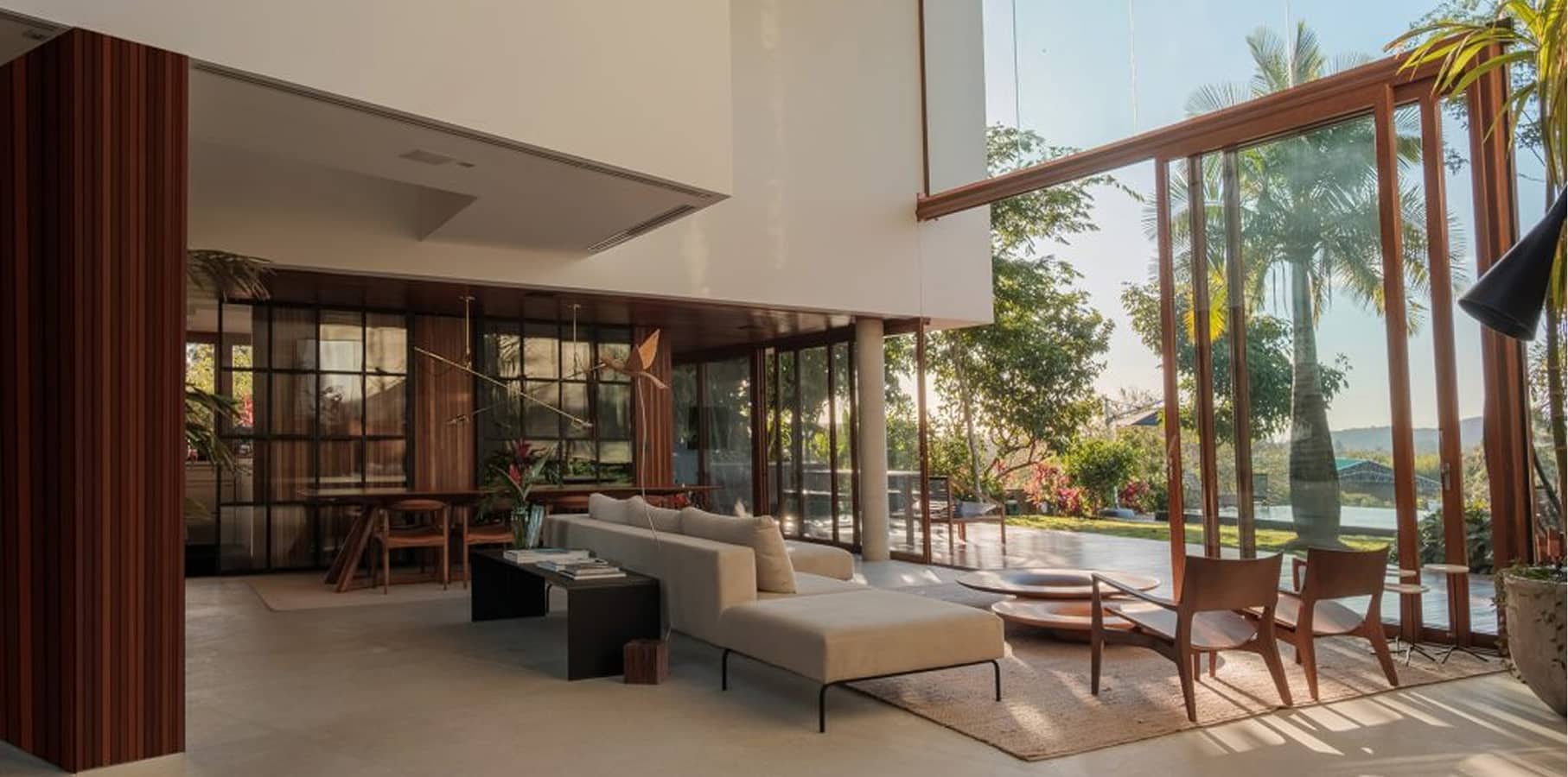 Todo o espaço é permeado por painéis de vidro, descortinando a vista para as árvores do jardim. O terceiro volume, em alvenaria branca, tem dois pavimentos: o inferior concentra a área de serviço, cozinha e brinquedoteca. No superior está a suíte do casal, à parte das demais.