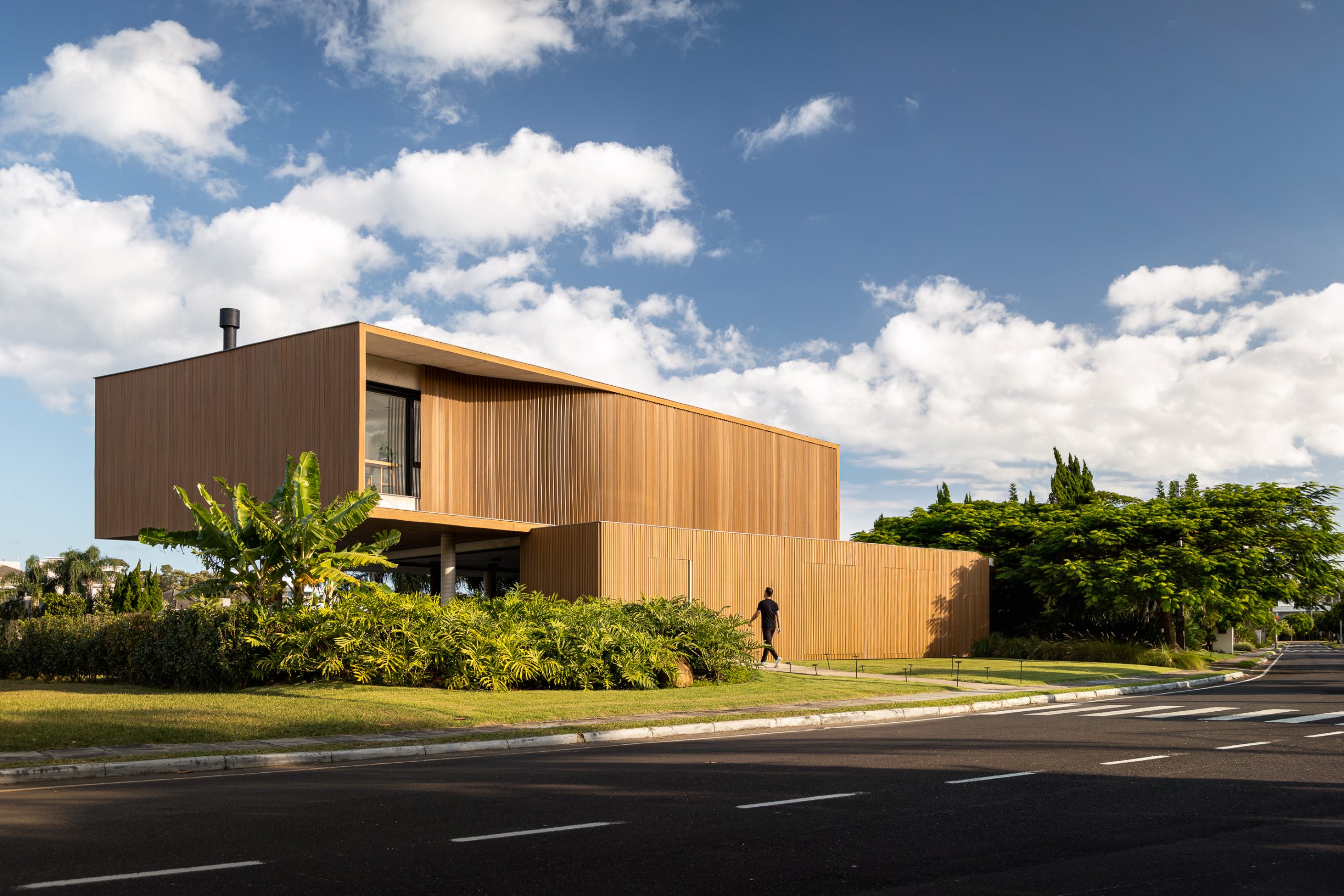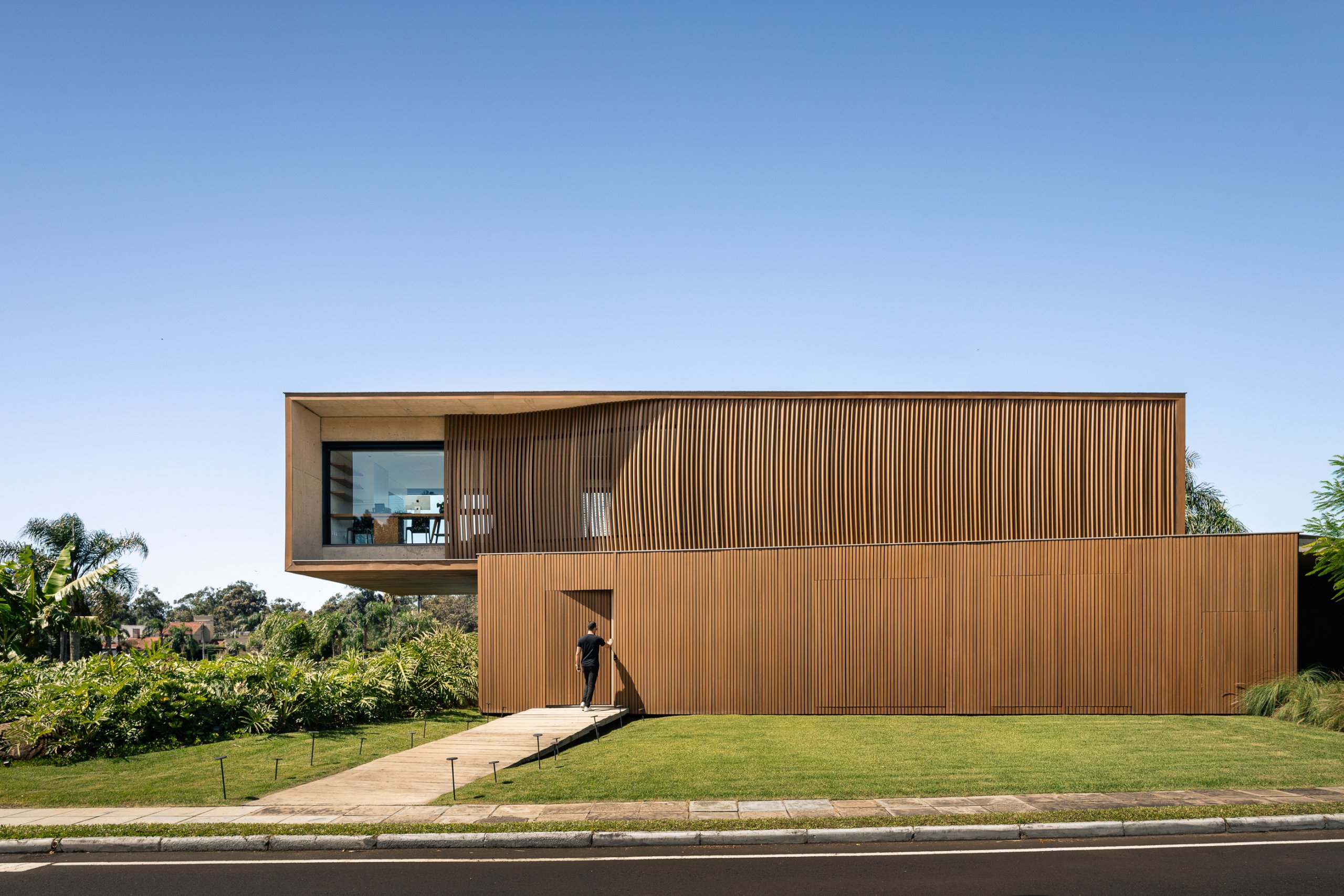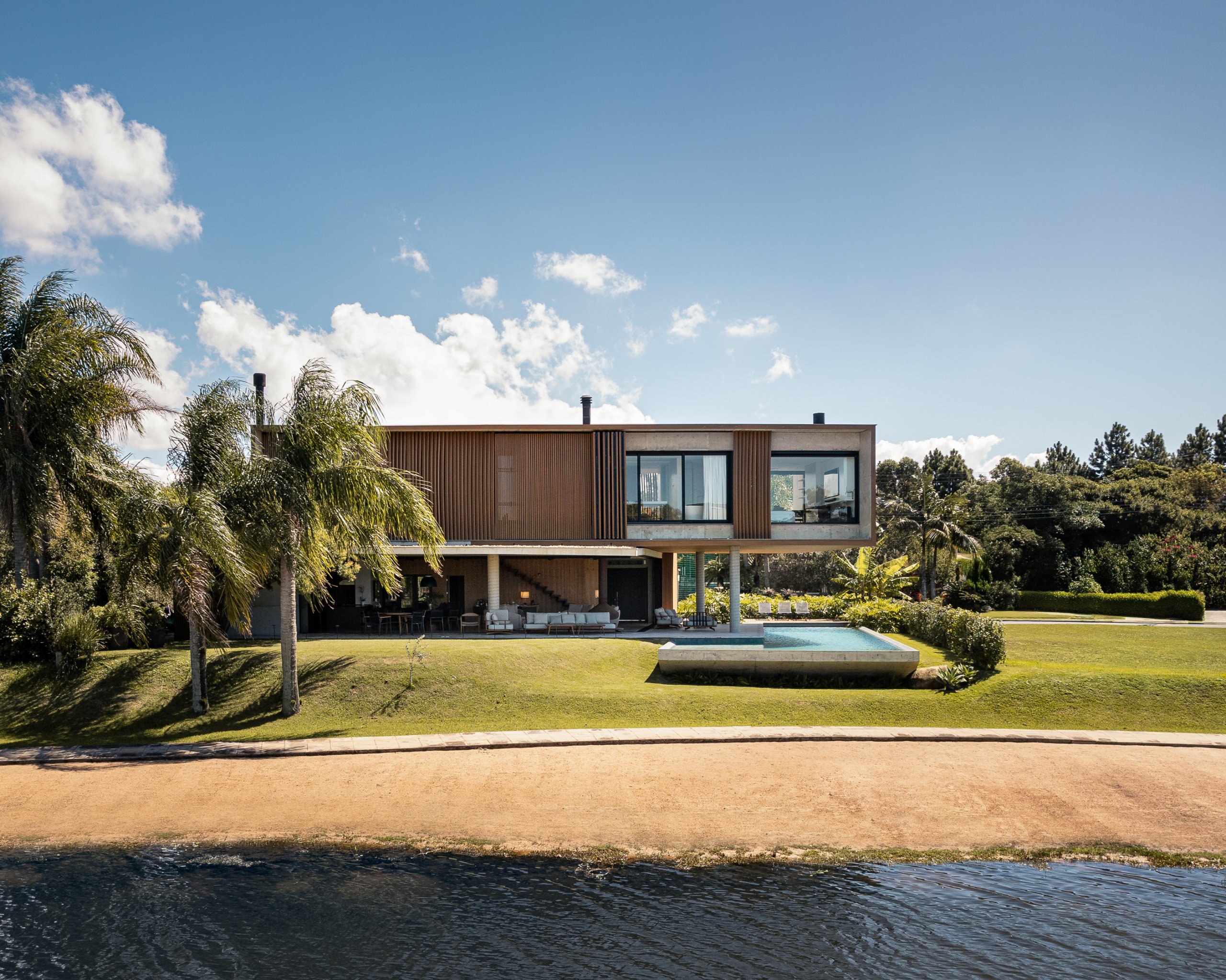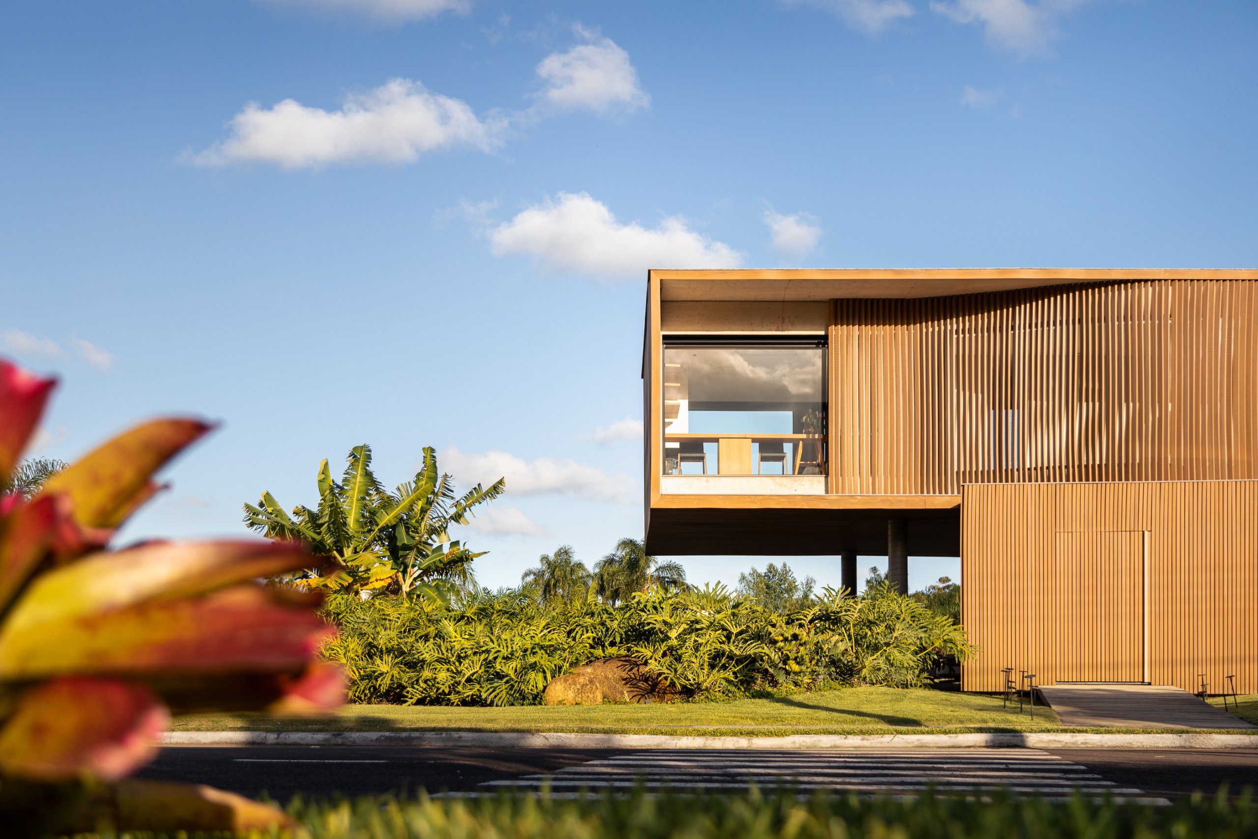 Formalmente, a fachada frontal compõe-se de 2 volumes sobrepostos, com um sútil desalinhamento. Enquanto o inferior avança sobre o jardim, recoberto por painéis de esquadrias camarão, também em madeira ecológica WPC, o superior segue o ângulo trapezoidal do terreno, com um brise linear, no mesmo material, finalizado por uma ondulação que expõe o estar íntimo e filtra a entrada de luz, proporcionando efeitos cênicos na circulação. A fachada voltada para o lago harmoniza o volume superior, que flutua sobre a base em vidro e descortina a área social.