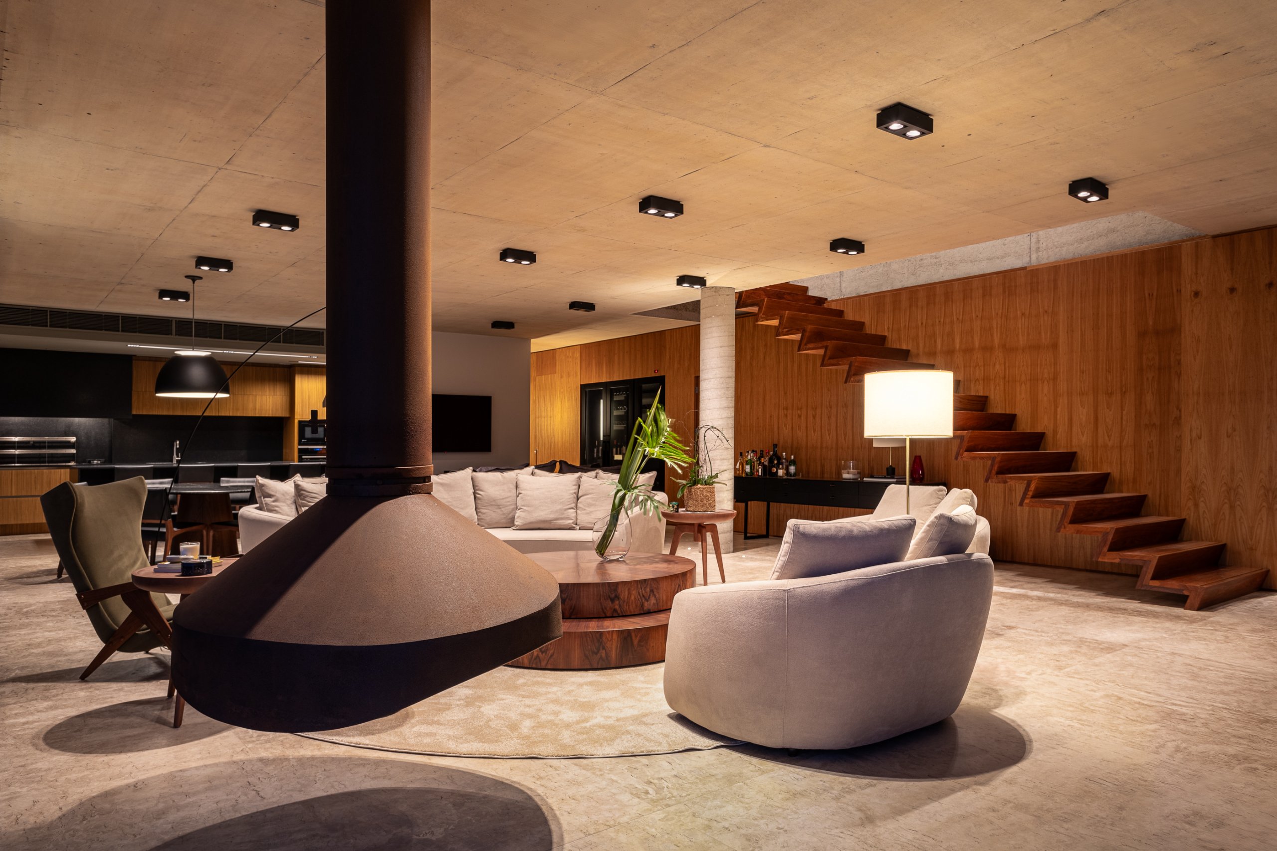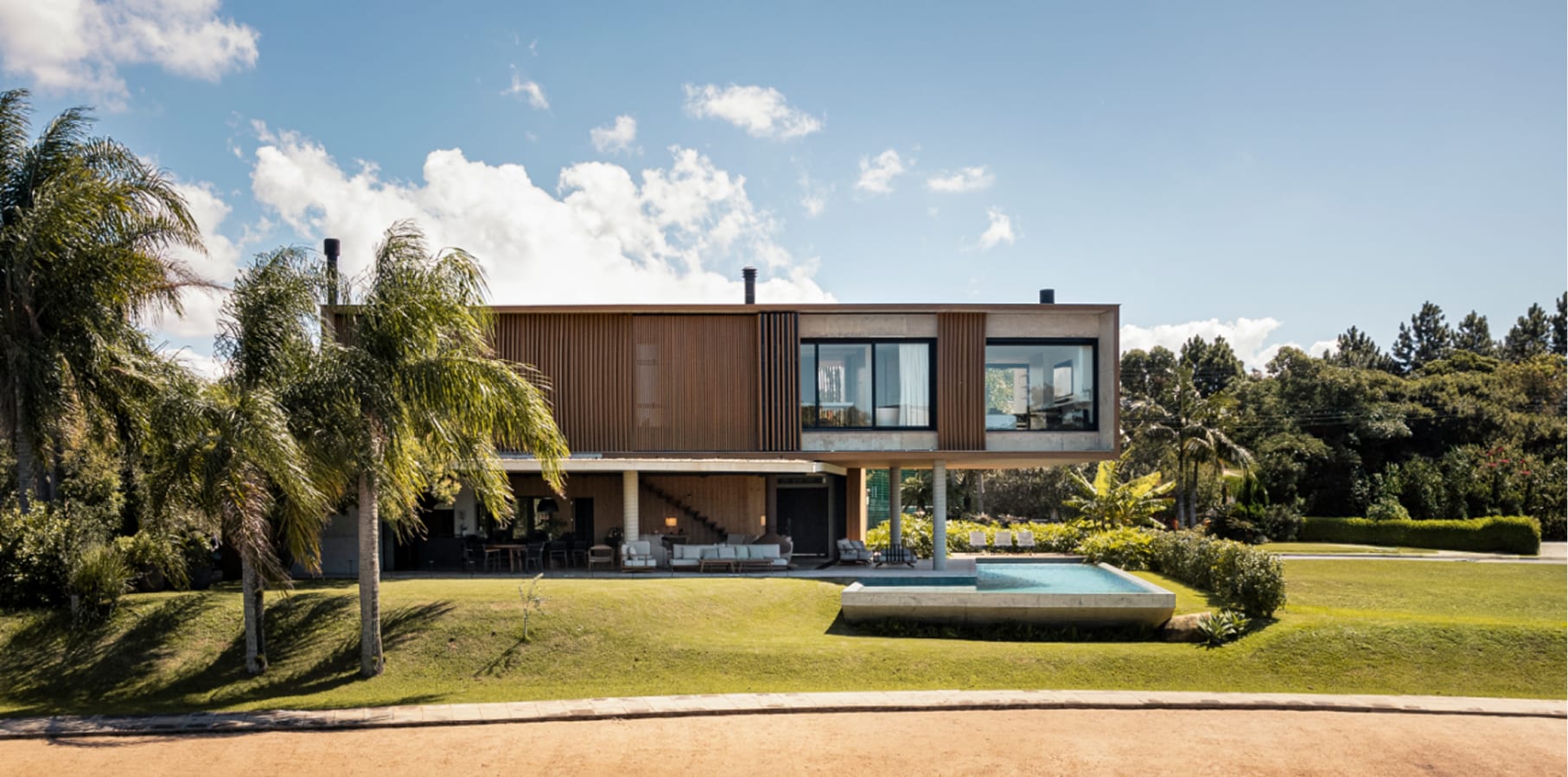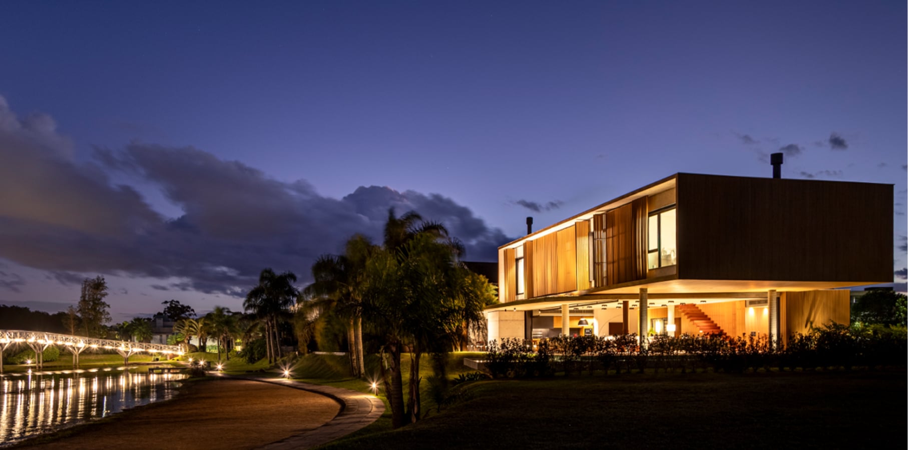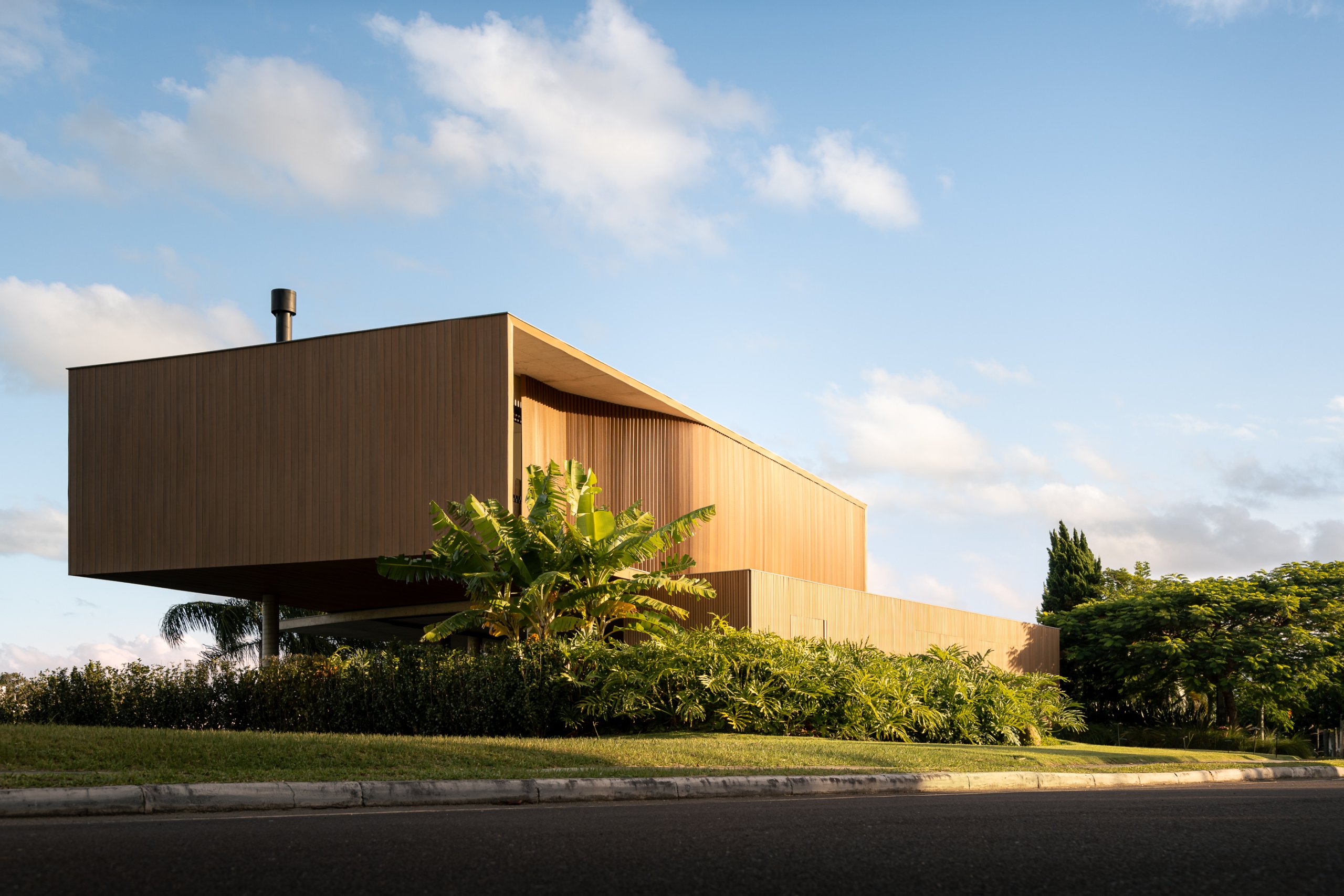 Formalmente, a fachada frontal compõe-se de 2 volumes sobrepostos, com um sútil desalinhamento. Enquanto o inferior avança sobre o jardim, recoberto por painéis de esquadrias camarão, também em madeira ecológica WPC, o superior segue o ângulo trapezoidal do terreno, com um brise linear, no mesmo material, finalizado por uma ondulação que expõe o estar íntimo e filtra a entrada de luz, proporcionando efeitos cênicos na circulação. A fachada voltada para o lago harmoniza o volume superior, que flutua sobre a base em vidro e descortina a área social.