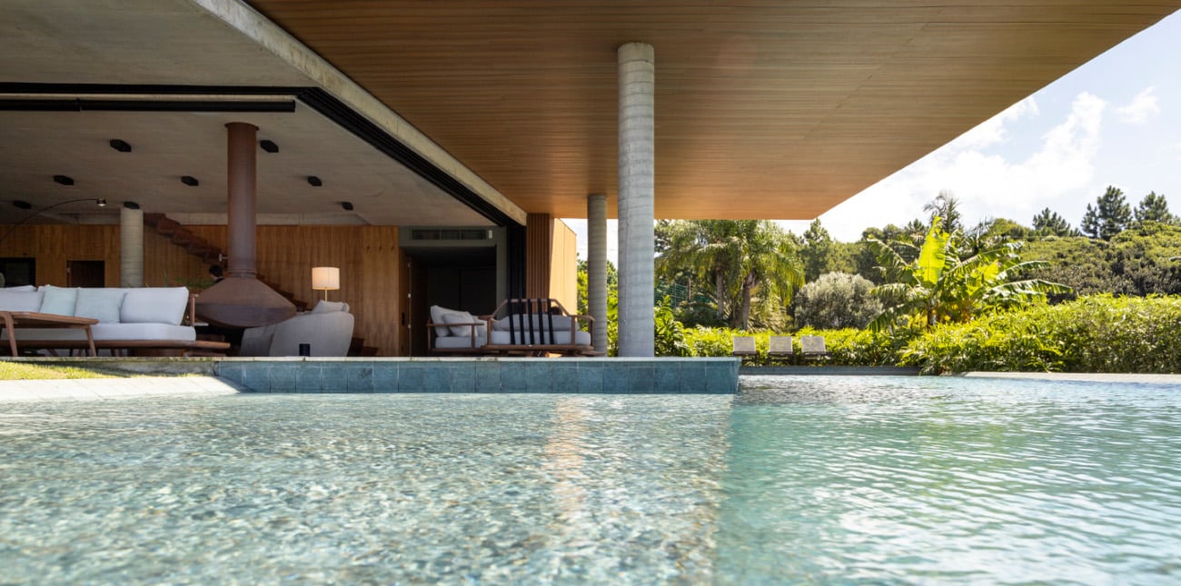 A piscina de 18 x 7 metros prolonga-se desde a frente do lote, projetando-se em balanço em direção à praia, conferindo uma sensação de continuidade entre as águas. Estende-se sobre ela o segundo pavimento, que abriga a área íntima. As três suítes, bem como o estar da família, neste andar, voltam-se para a vista sobre o lago, que é sul.