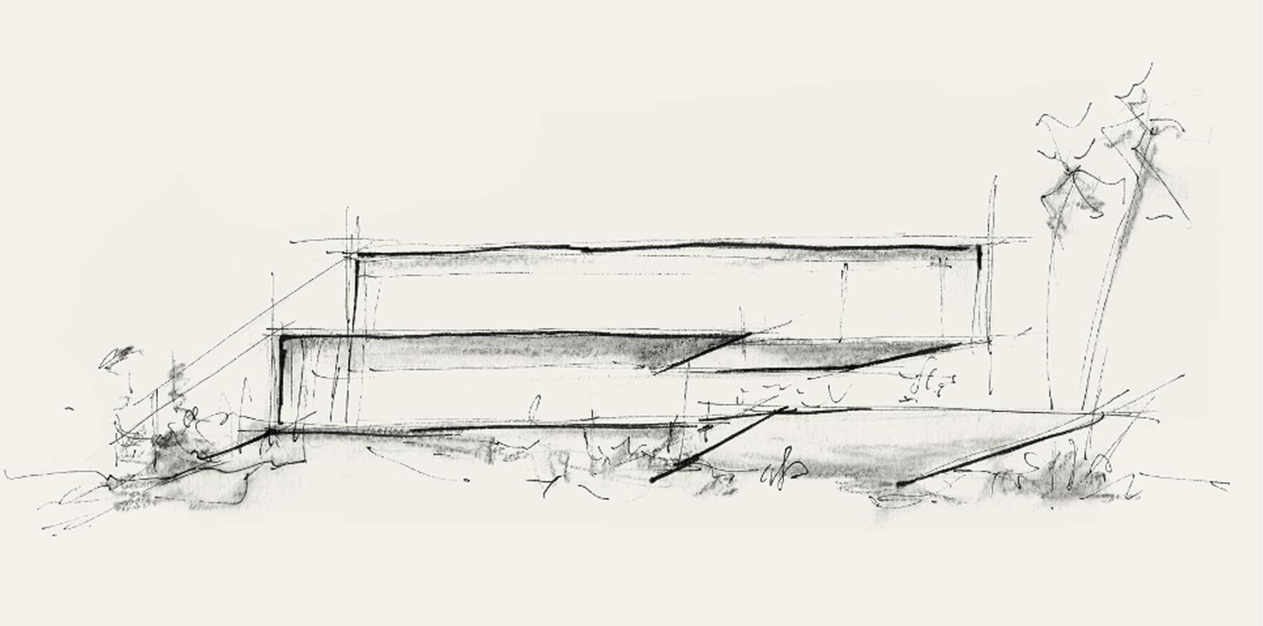 O formato do terreno foi determinante para a configuração do projeto. Dois volumes perpendiculares compõem a geometria simples da edificação.