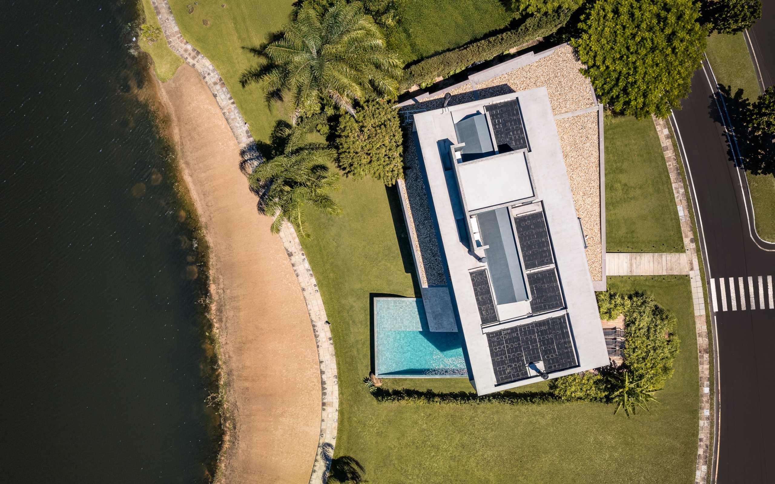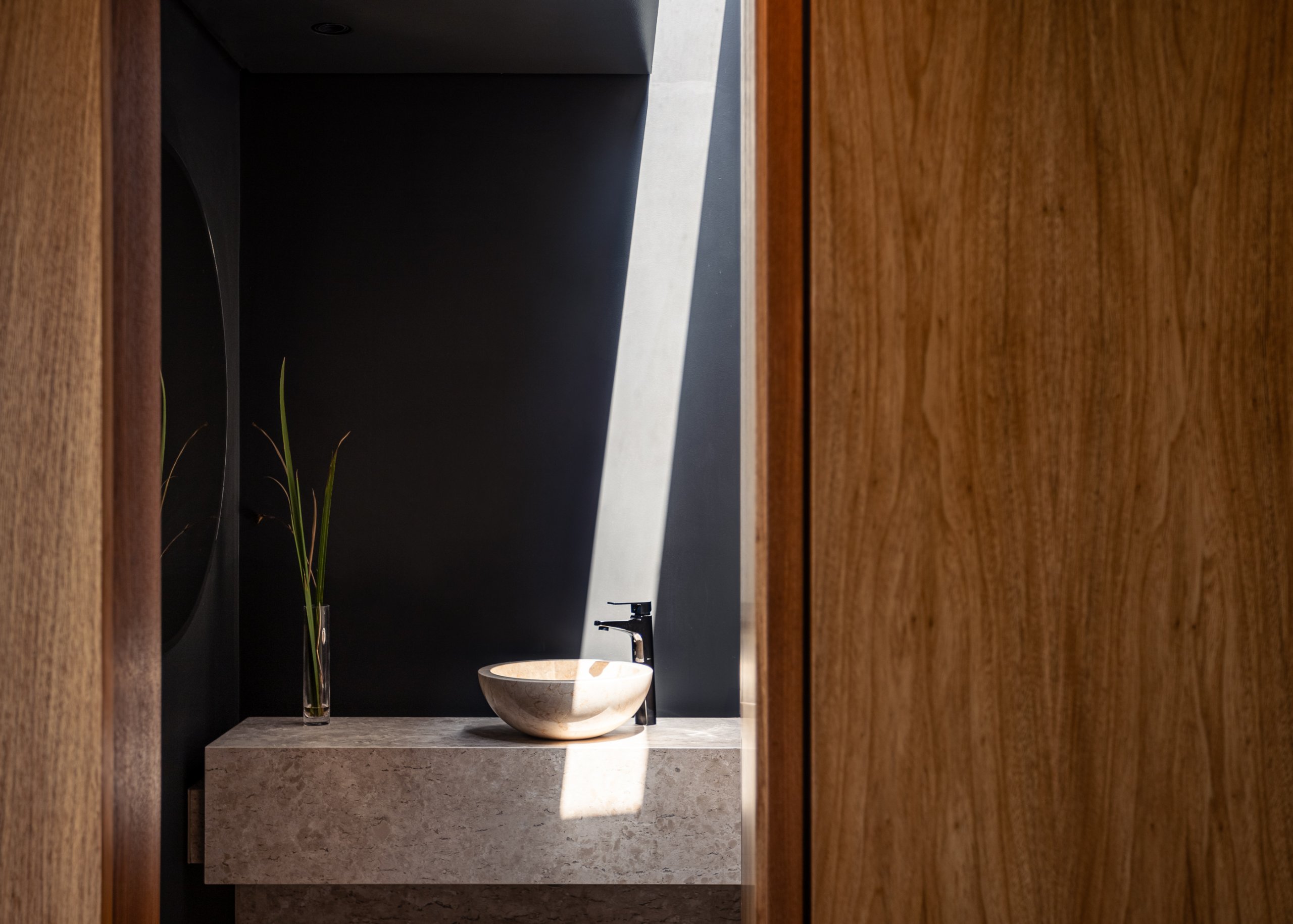 Como sempre os projetos da Stemmer Rodrigues têm uma preocupação especial com a sustentabilidade, além dos cuidados com a ventilação cruzada e insolação, todos os banheiros contam com iluminação e ventilação natural por zenitais. A casa é abastecida por painéis fotovoltaicos, ocultos na cobertura, que geram energia inclusive para o aquecimento da piscina.