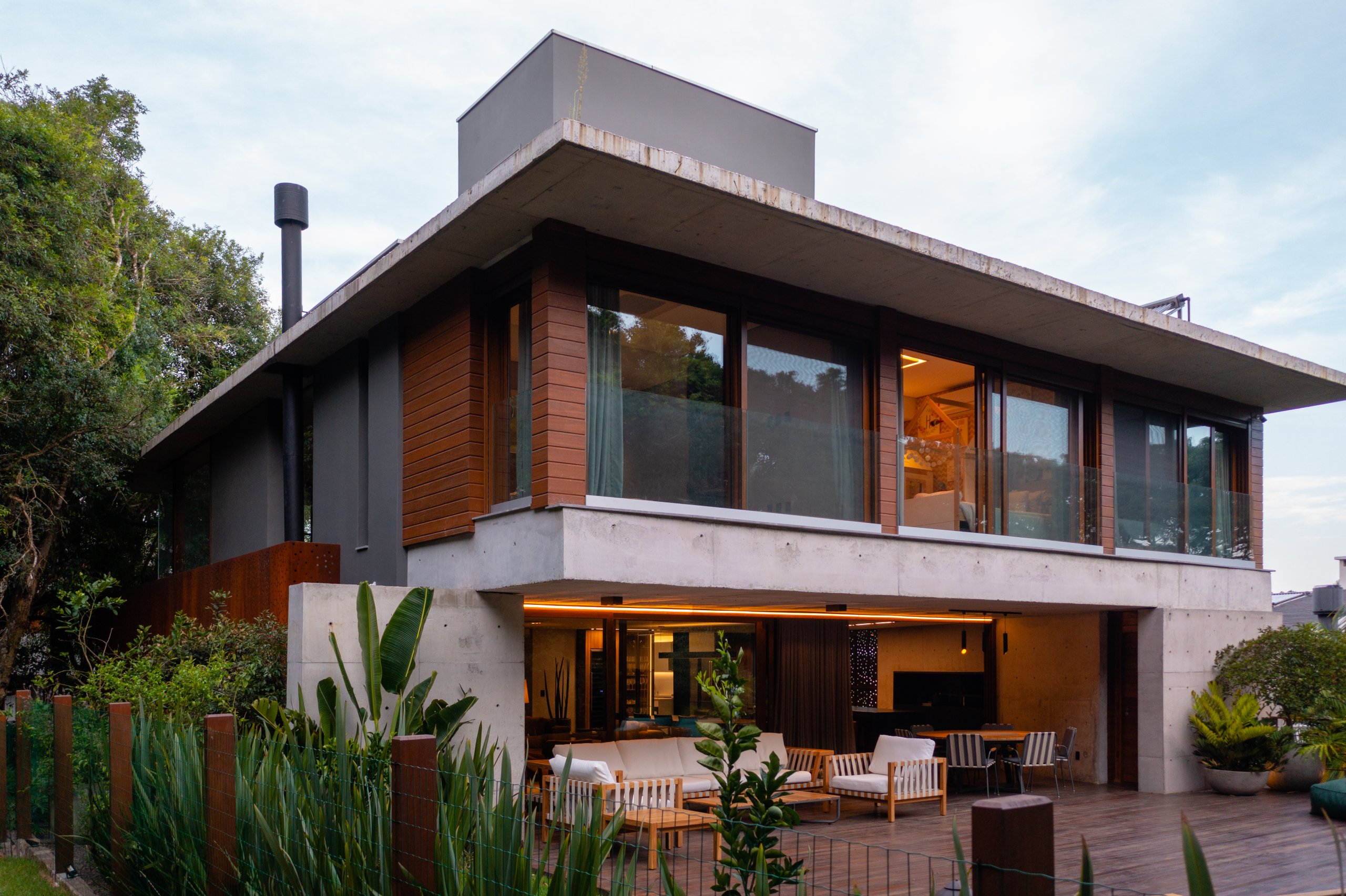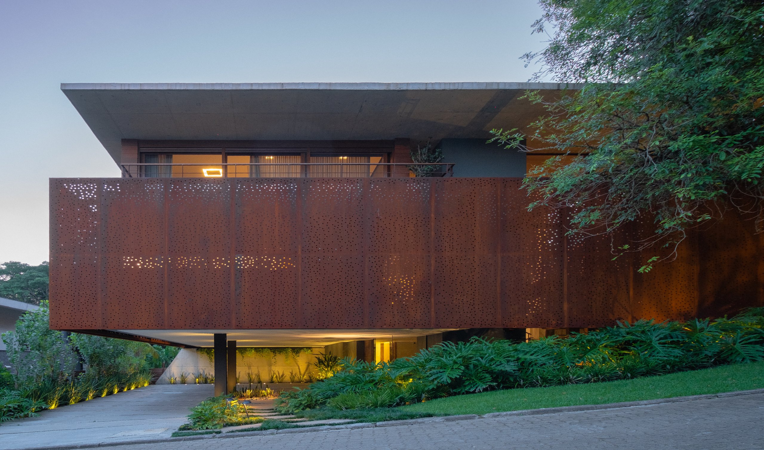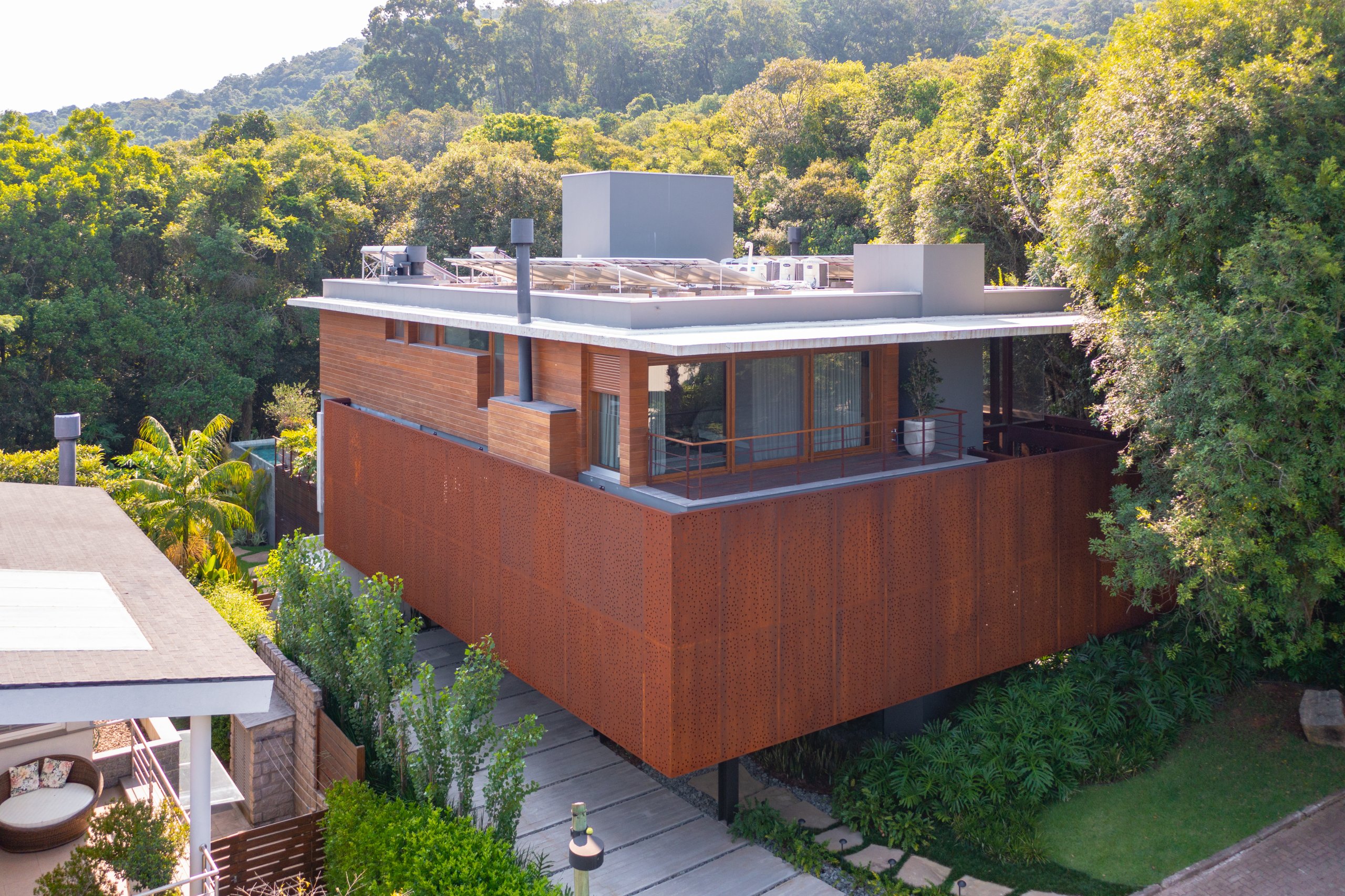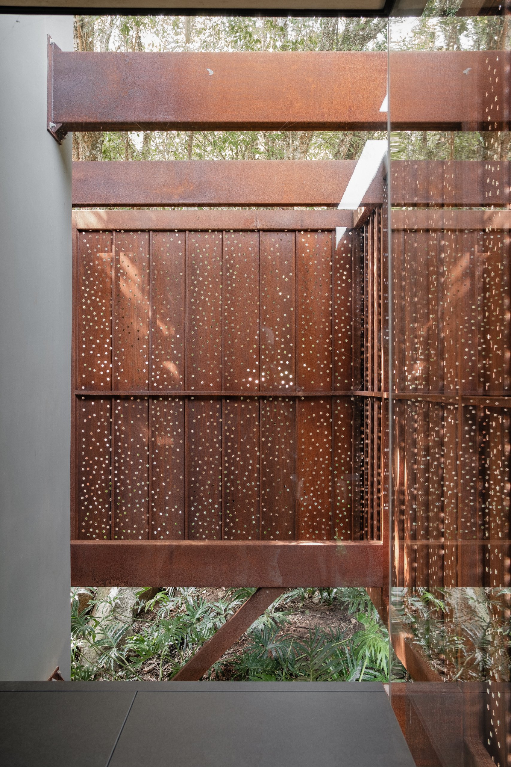 Como um elemento flutuante translúcido que brinca com a percepção dos volumes, placas de aço corten perfuradas contornam toda a casa. A área social se volta para o arvoredo que dá nome à casa, inspiração também da paleta de cores que constrói um equilibrado mimetismo.