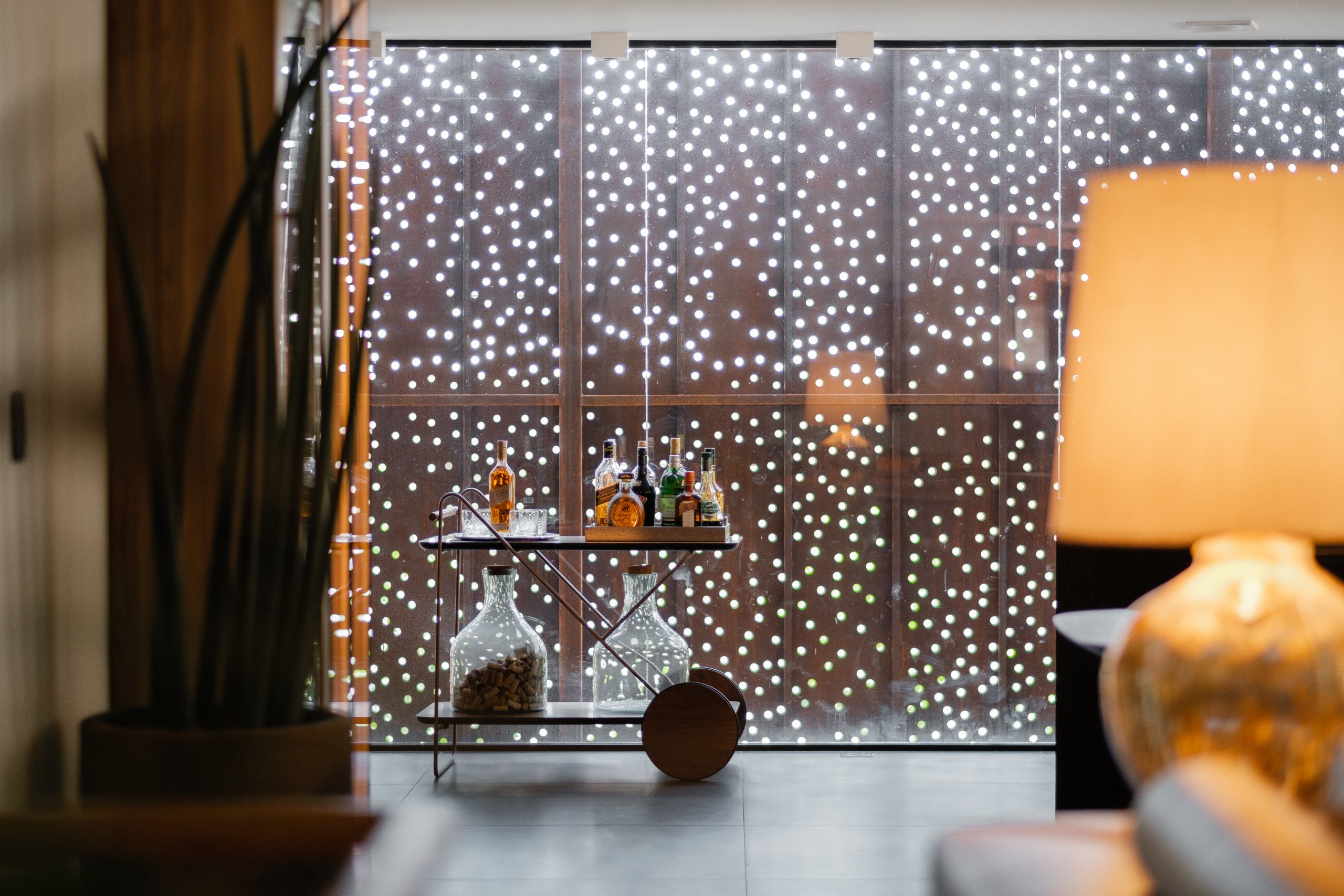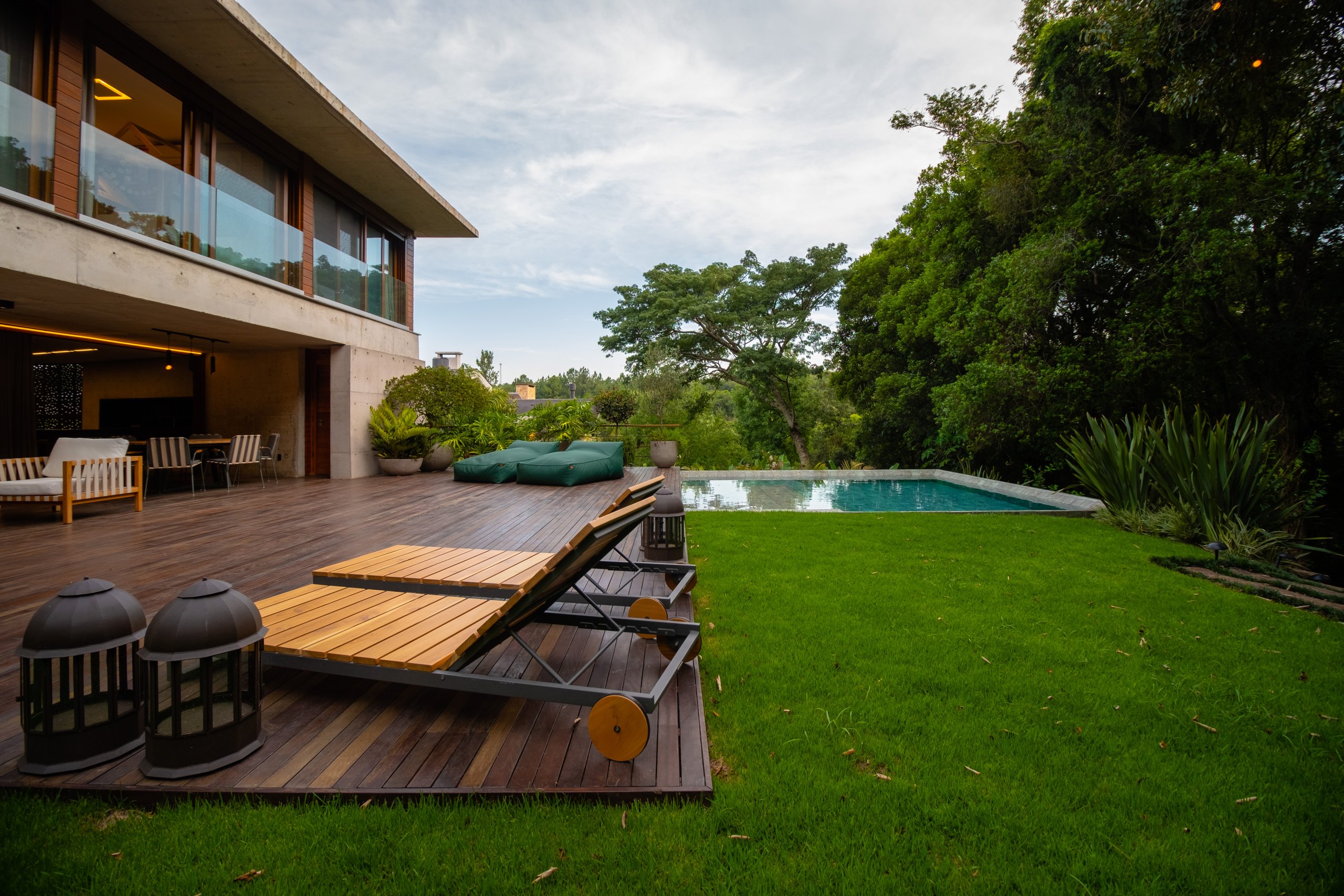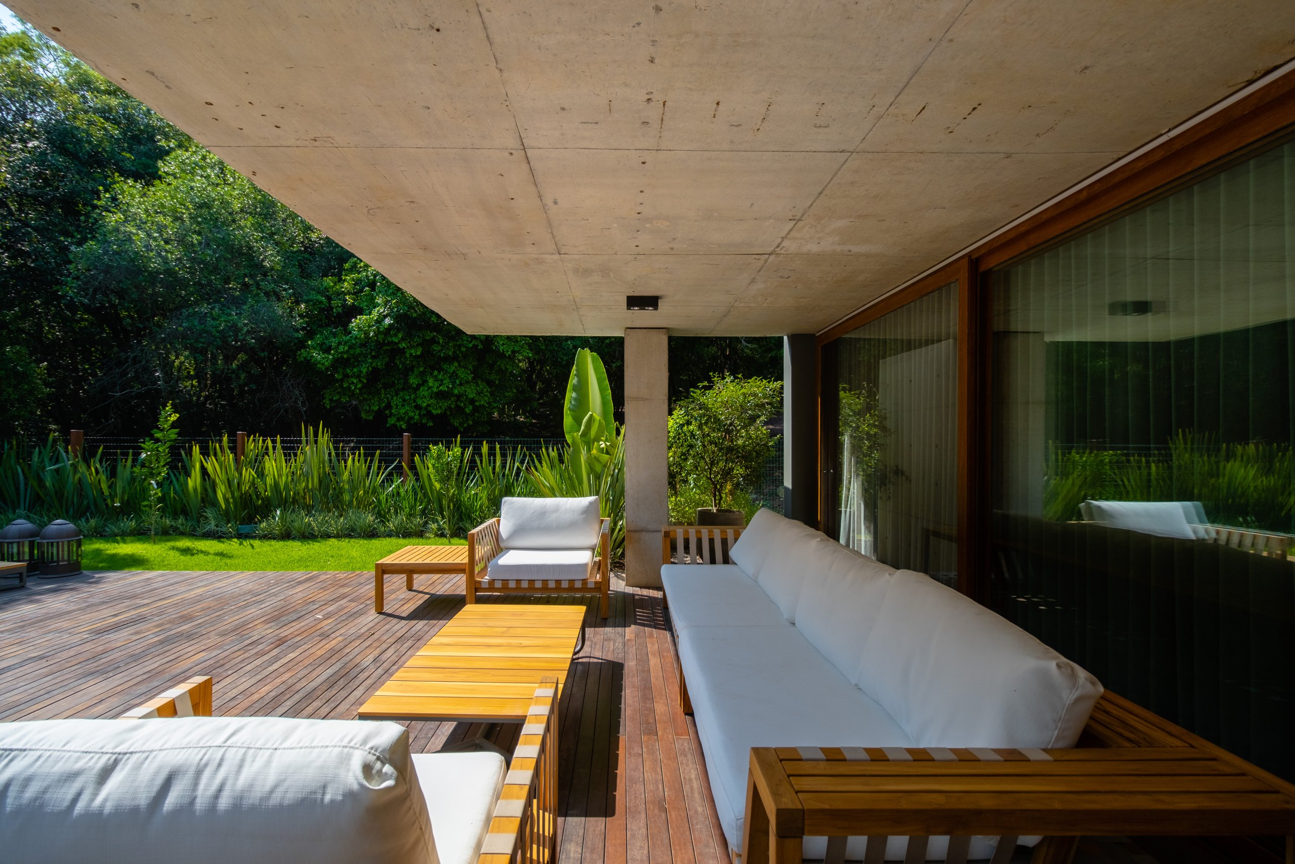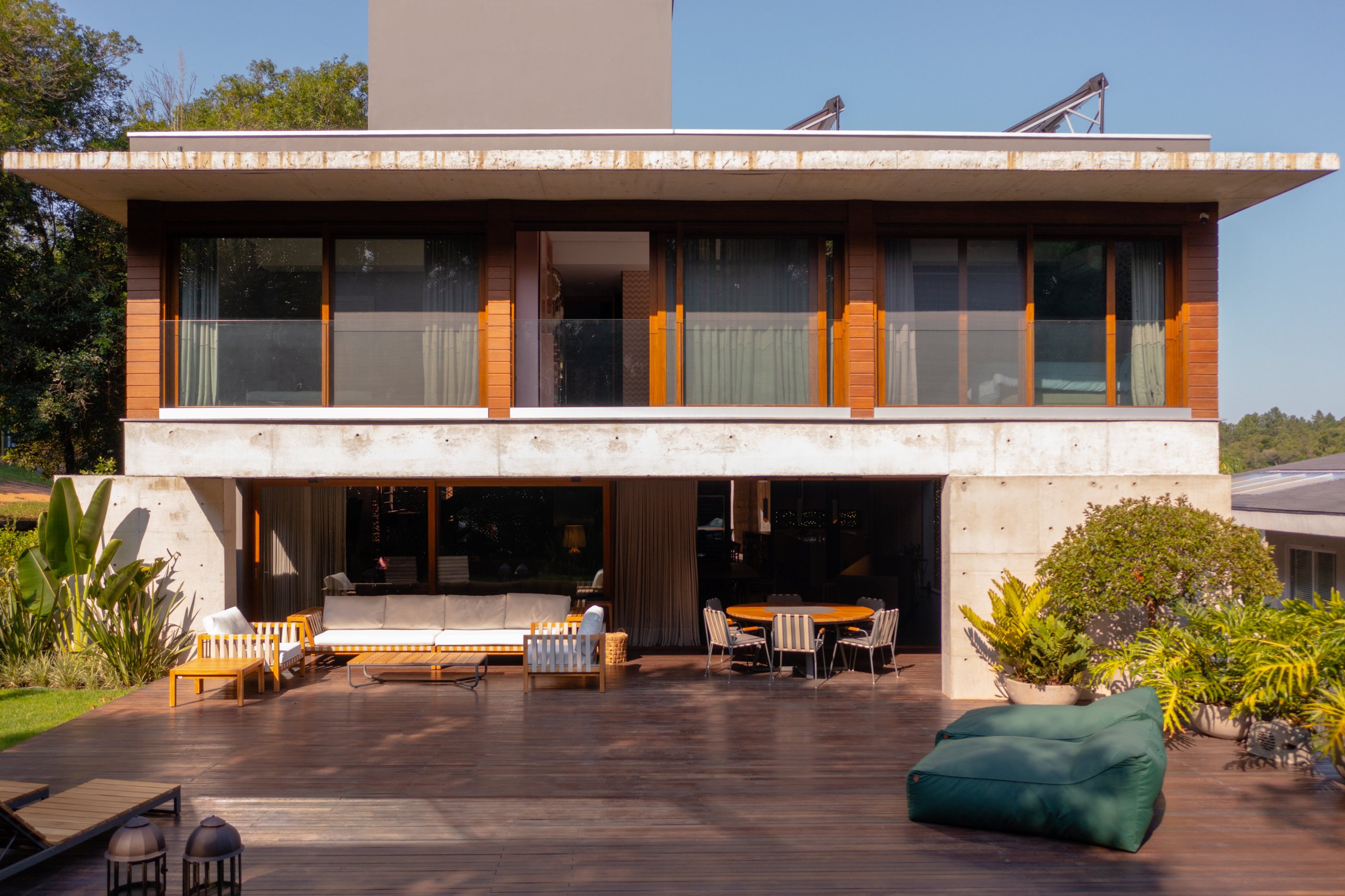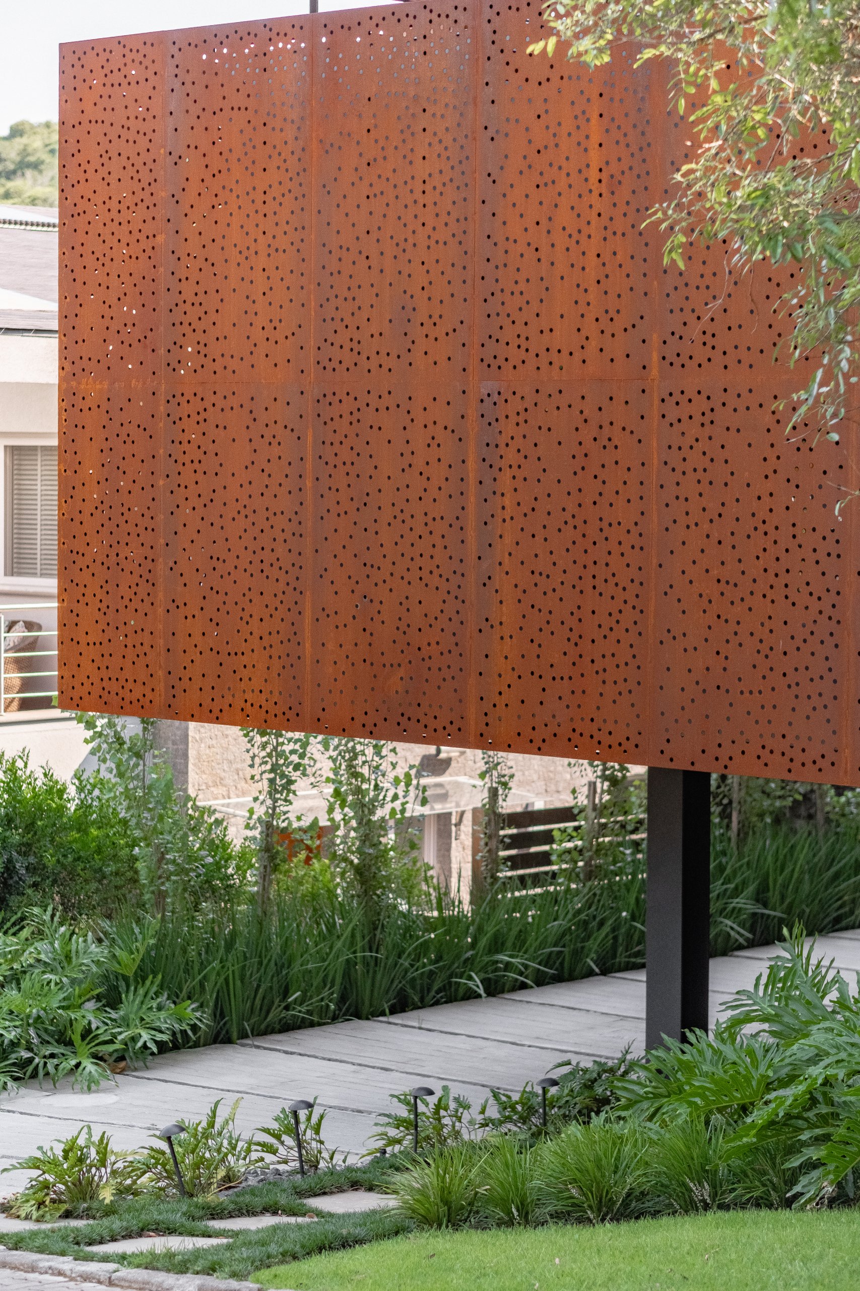 Como um elemento flutuante translúcido que brinca com a percepção dos volumes, placas de aço corten perfuradas contornam toda a casa. A área social se volta para o arvoredo que dá nome à casa, inspiração também da paleta de cores que constrói um equilibrado mimetismo.