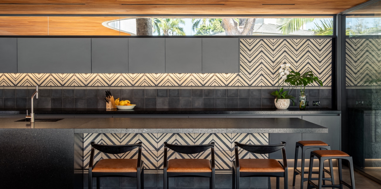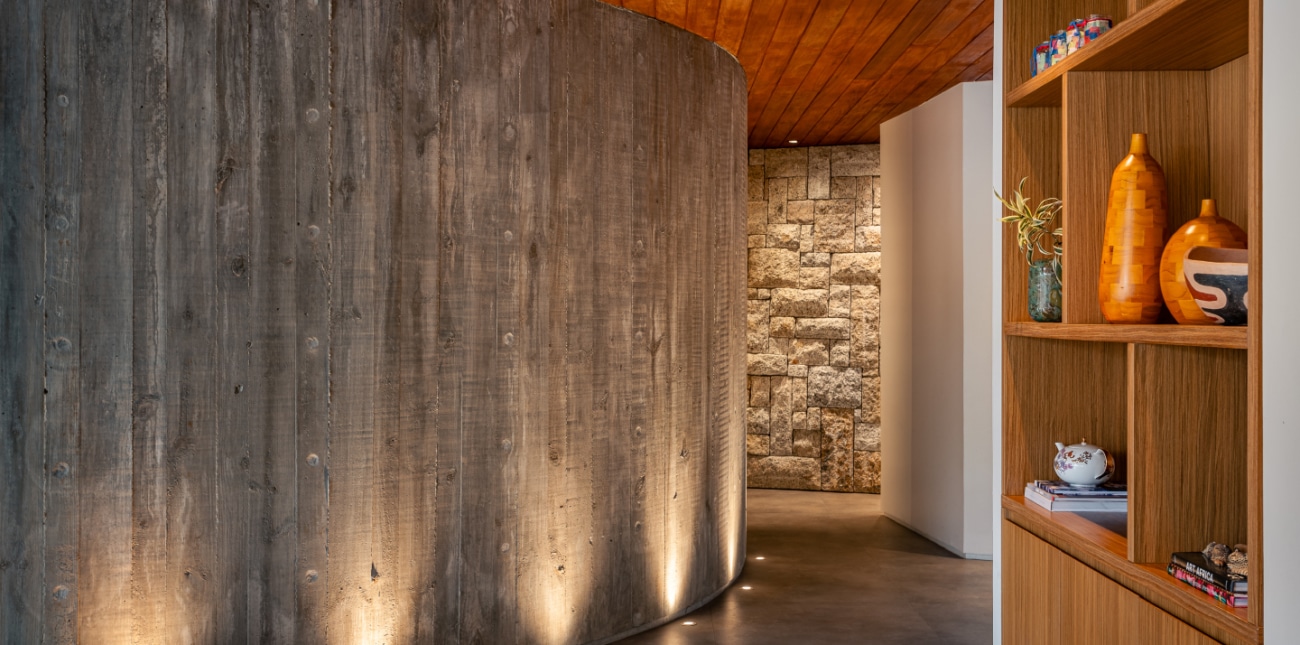 Com grandes aberturas envidraçadas, a área social recebe constante entrada de luz natural e estabelece contato direto com a parte de fora. Para os revestimentos internos das áreas molhadas, a arquiteta Ingrid Stemmer criou painéis de ladrilho hidráulico inspirados na cestaria da tribo Carajá, para living, cozinha e banheiros.