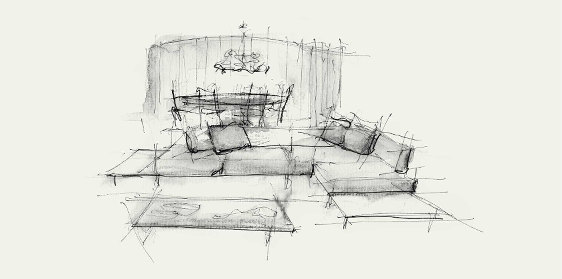O primeiro esboço do projeto foi uma mancha fluida no espaço entre as árvores existentes, resultando em uma casa sinuosa, de formas orgânicas, que encantou os clientes logo no primeiro momento. O Jacarandá do terreno foi inserido em um pequeno pátio interno circular, que ilumina o lavabo.
