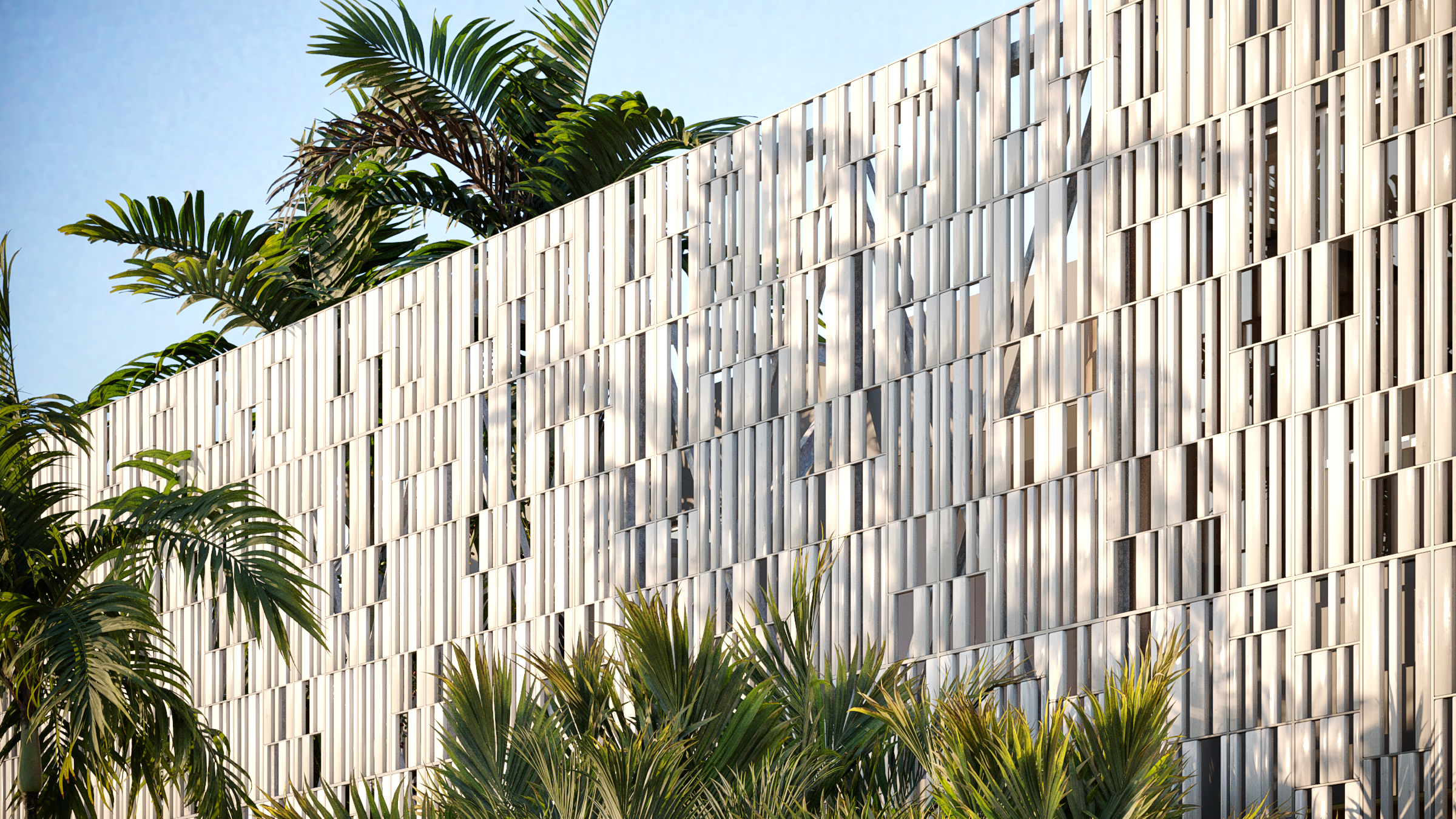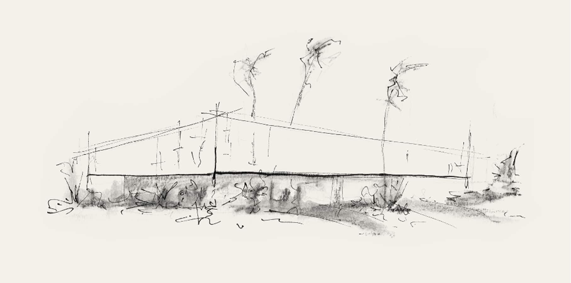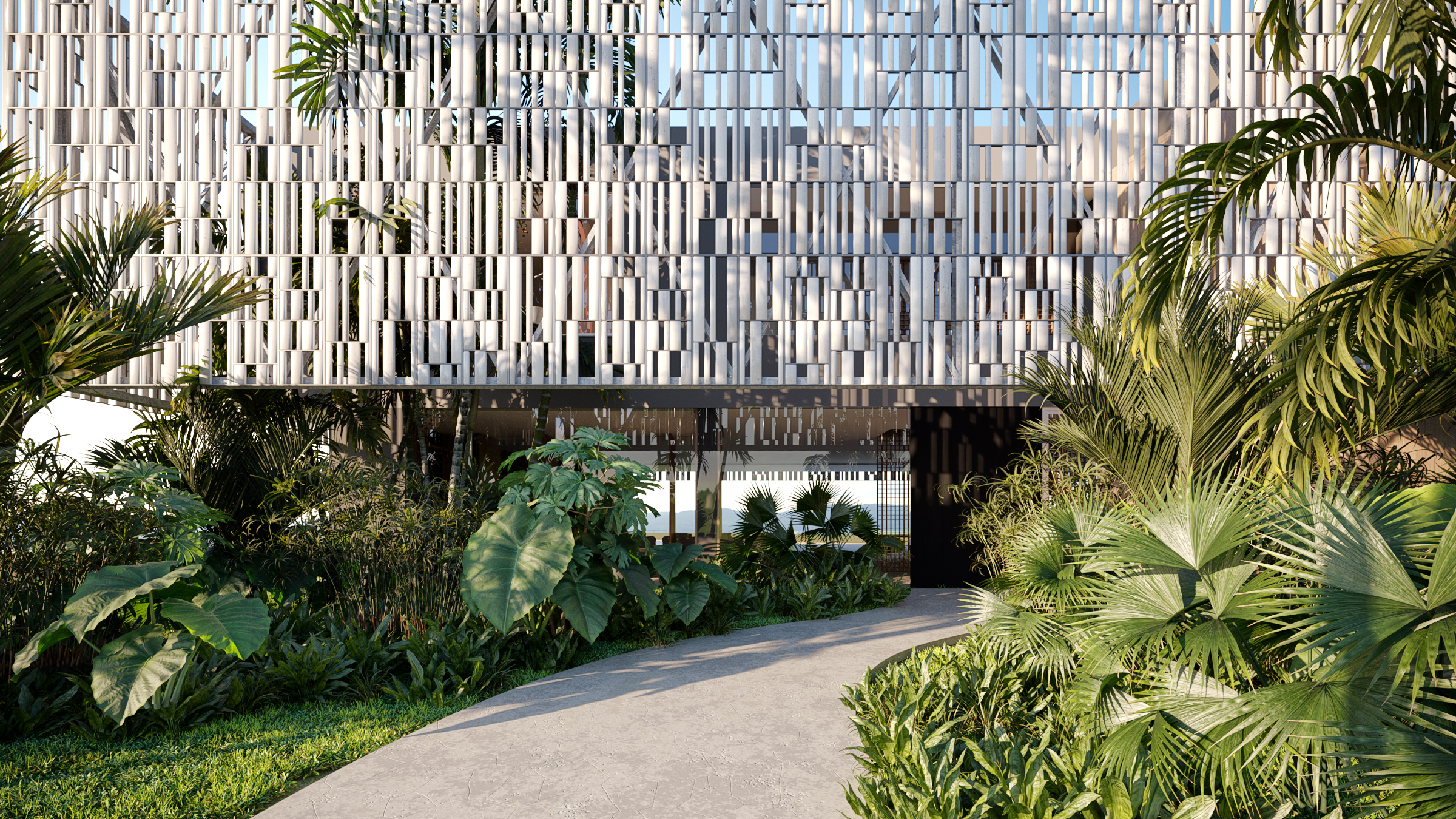 Envolta por um painel metálico vazado que abraça também a vegetação, a casa ganha em dinamismo e privacidade ao mesmo tempo em que estabelece contato direto com a natureza. Sua geometria sinuosa, iniciada desde a passarela de entrada, garante volumetria que atrai o olhar do visitante. O hall de entrada dá acesso ao pavimento térreo, onde volumes também curvos, revestidos em madeira ripada, sugerem o fluxo pela área social.