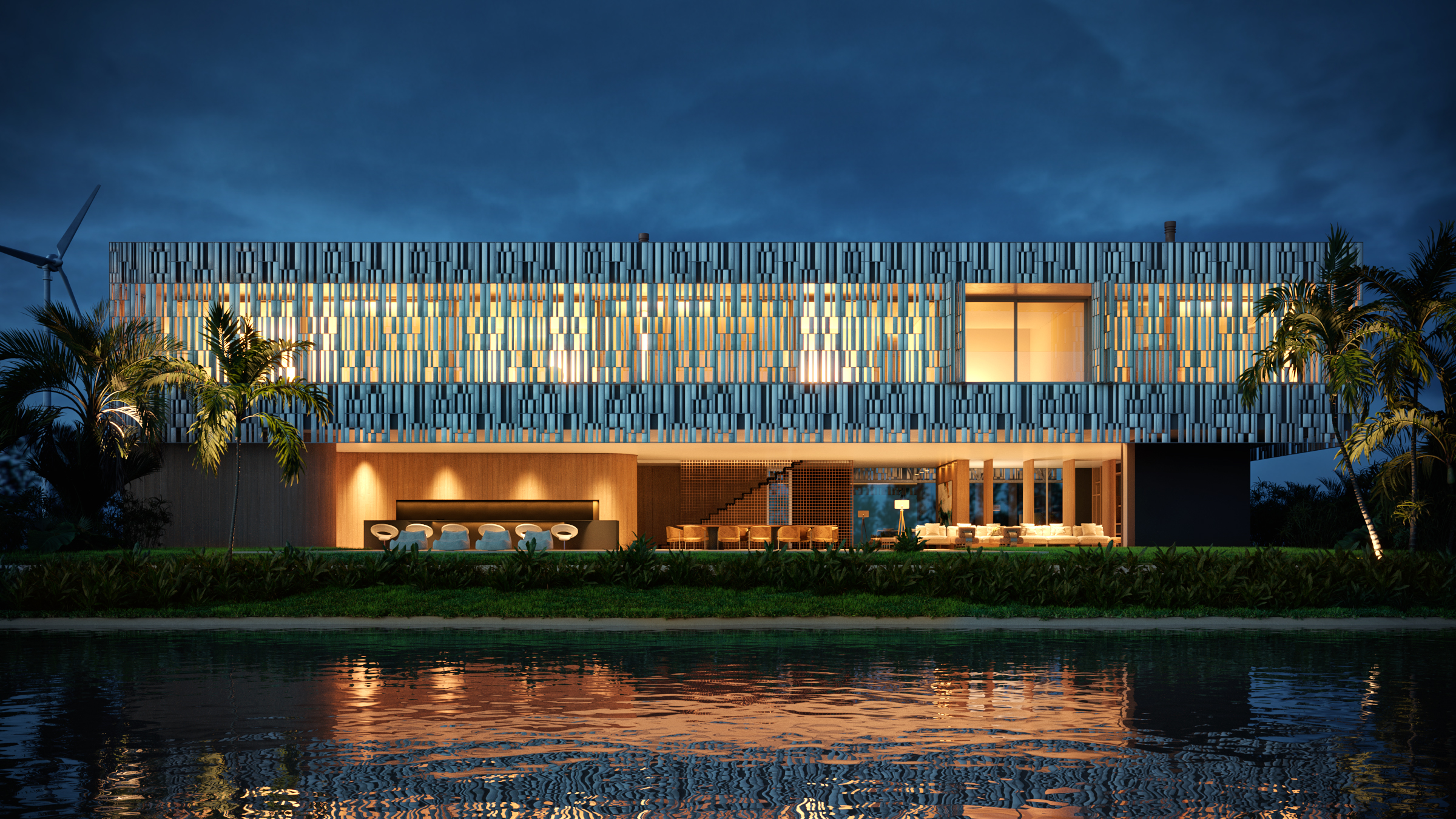 O segundo pavimento concentra a área íntima da residência, equipada com sala de estar privativa e 6 suítes. Comum a todos estes espaços, uma ampla varanda voltada para os fundos do terreno dá vista para a piscina e para o lago vizinho. Este recuo, aliado ao painel metálico com aberturas camarão, proporciona proteção solar e privacidade aos dormitórios. Nos corredores internos, aberturas zenitais mantêm o conforto térmico e a iluminação natural. Também no segundo pavimento ficam a academia e área de serviço, composta por três dormitórios (sendo uma suíte) e uma cozinha.