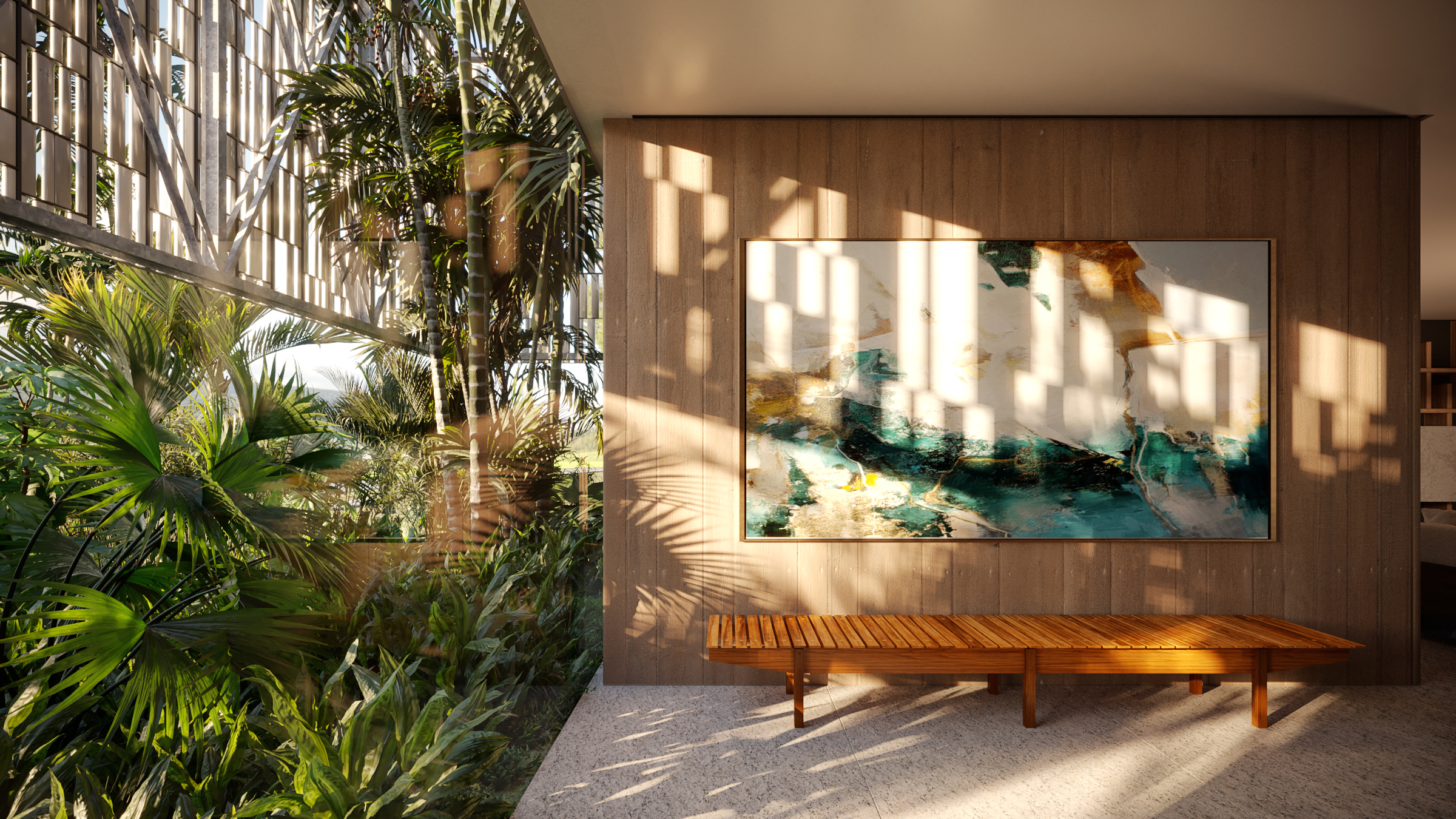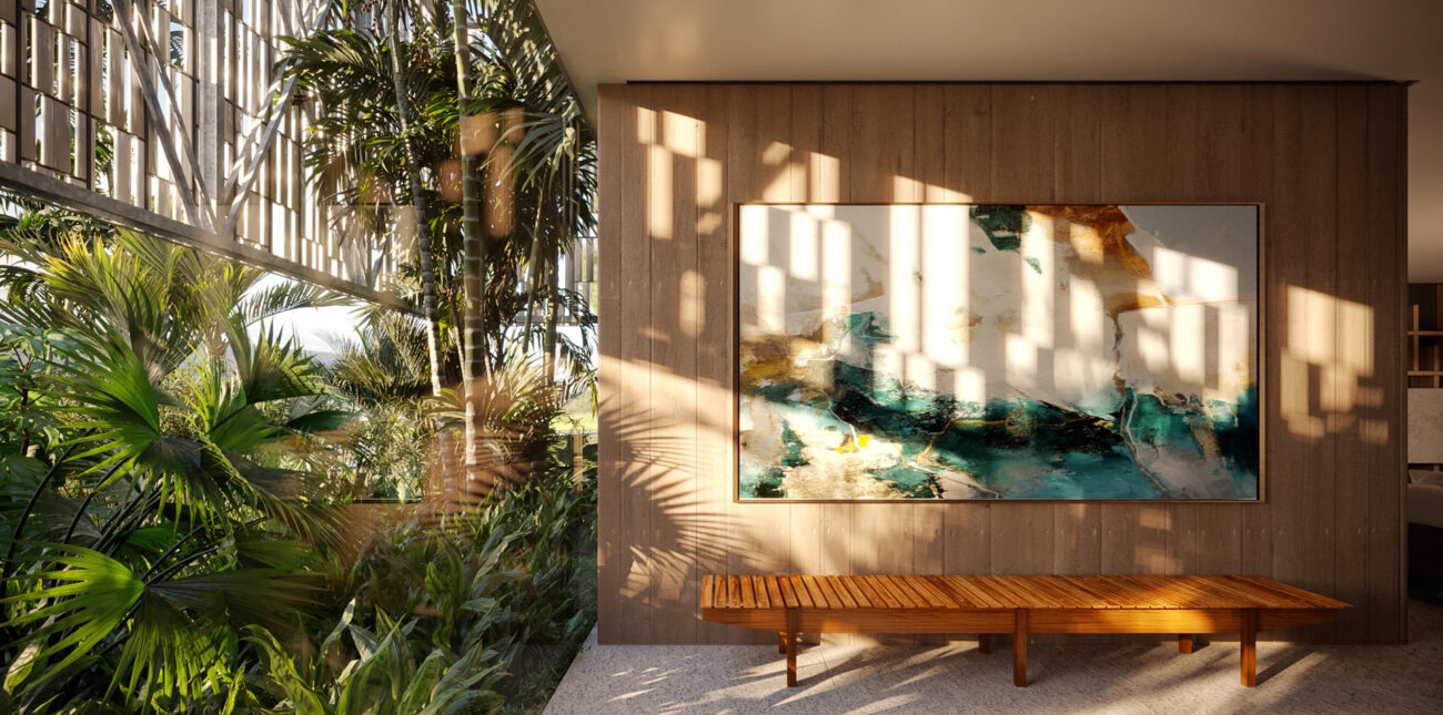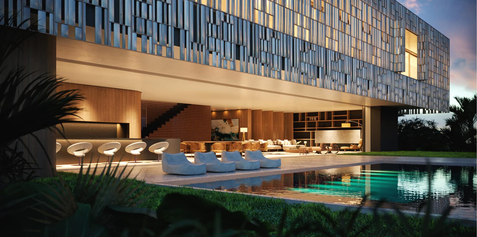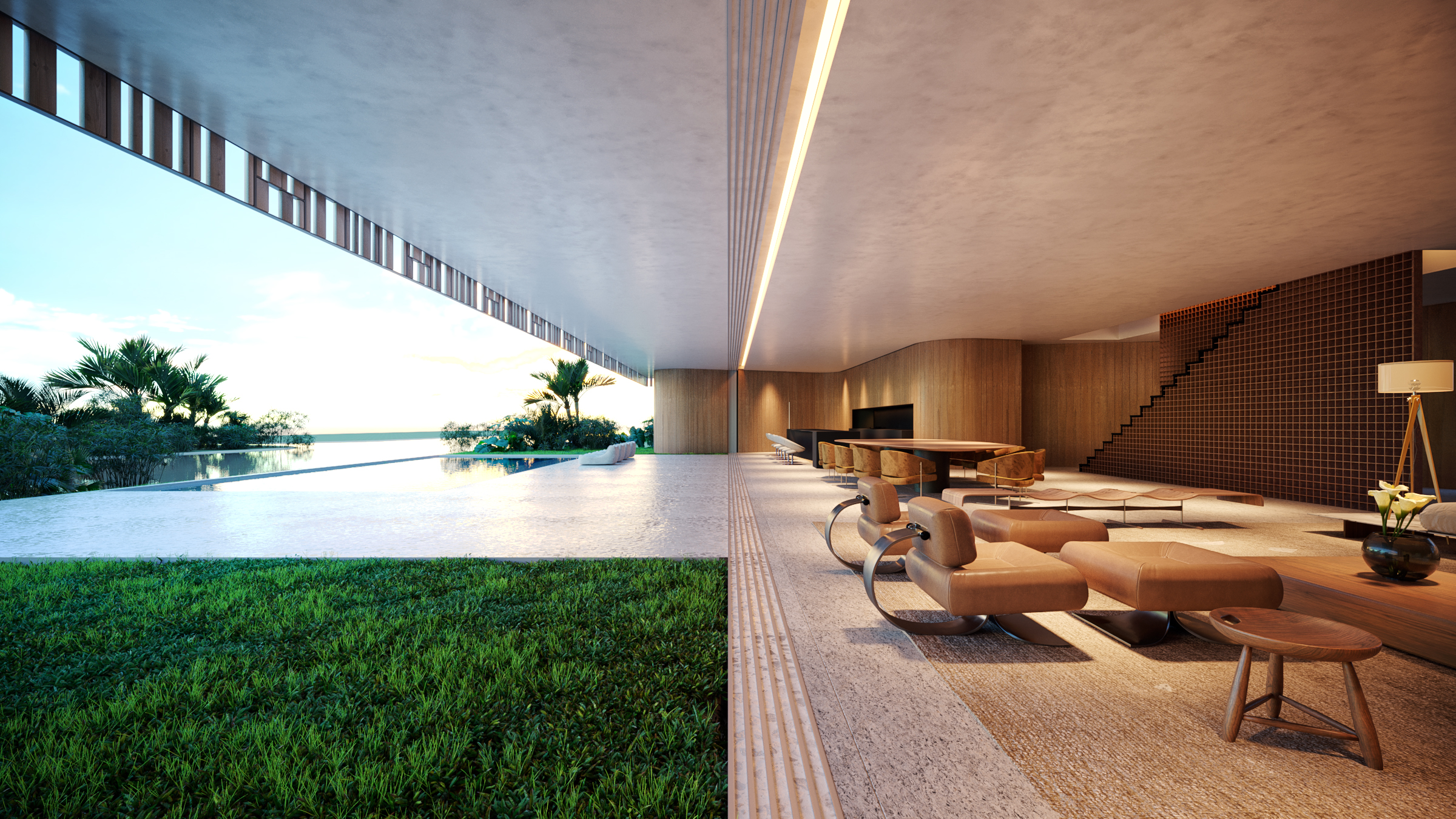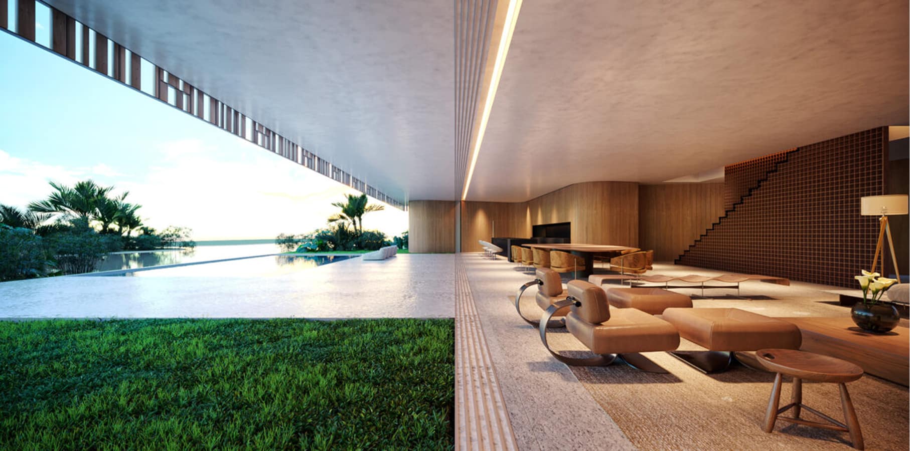 Este espaço integra living, sala de jantar, cozinha e área gourmet, além de conectar totalmente com a área externa através de um vão de 23 metros. Ficam ainda no térreo uma brinquedoteca, escritório e ambientes de serviço.