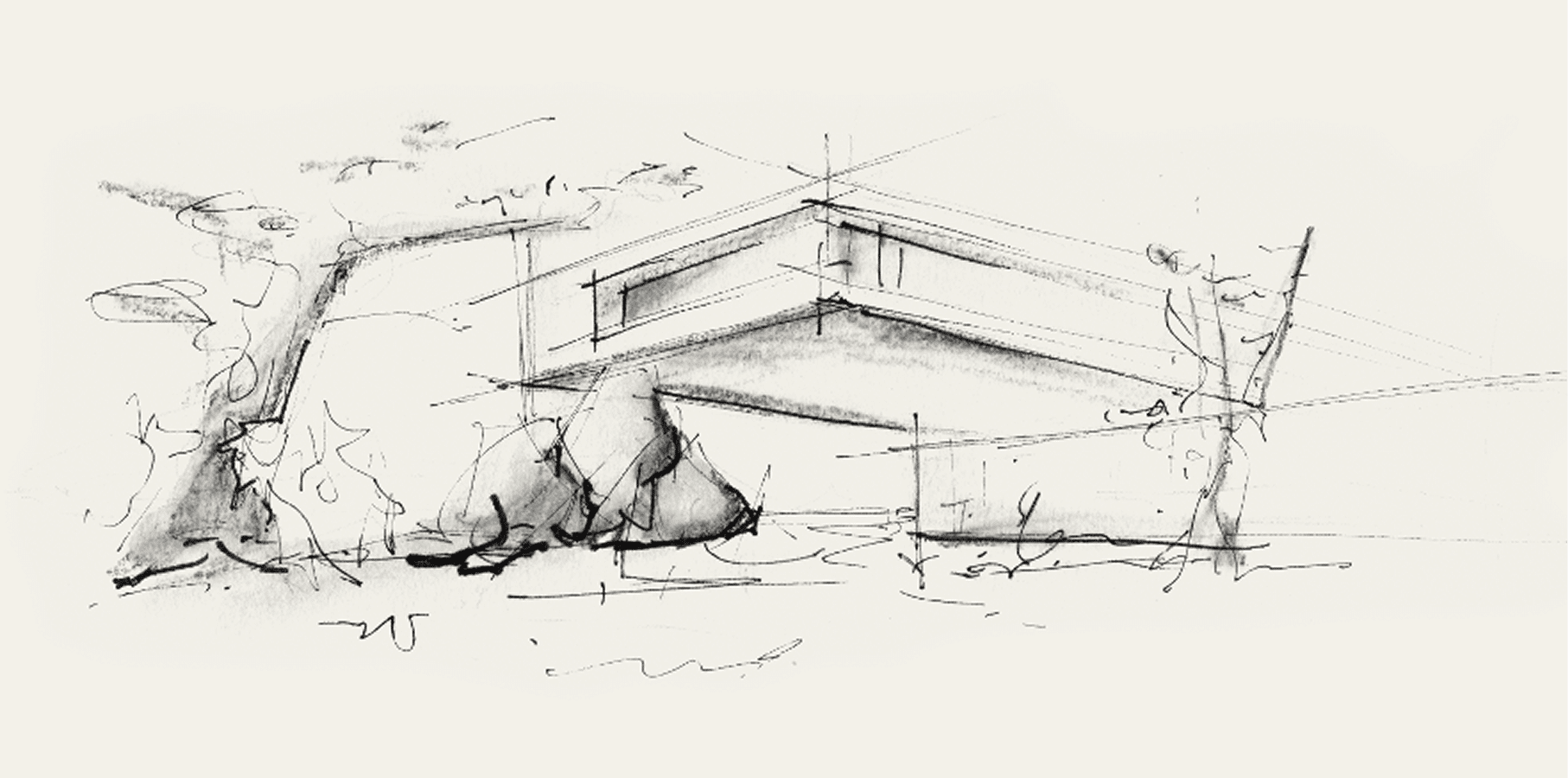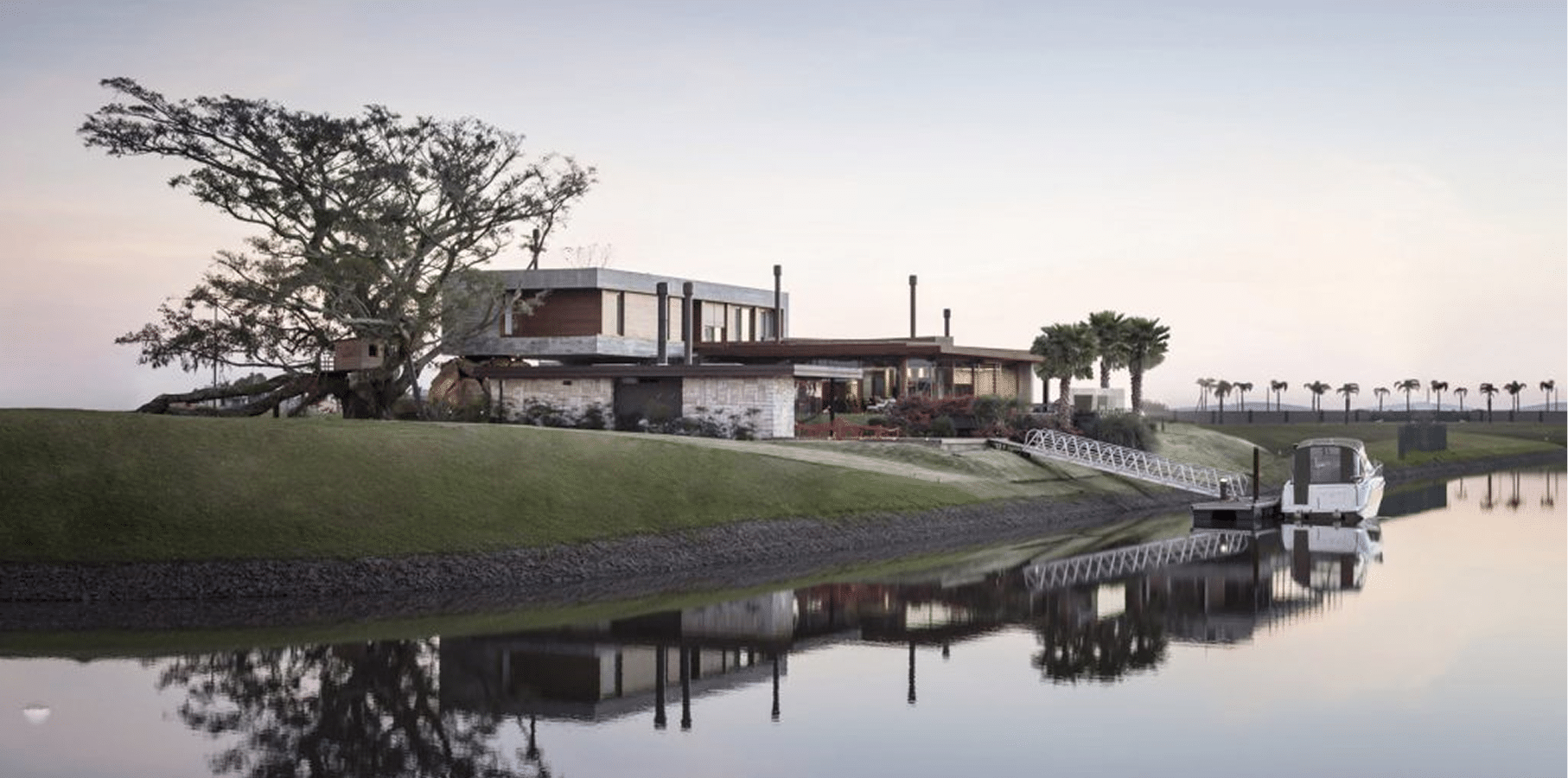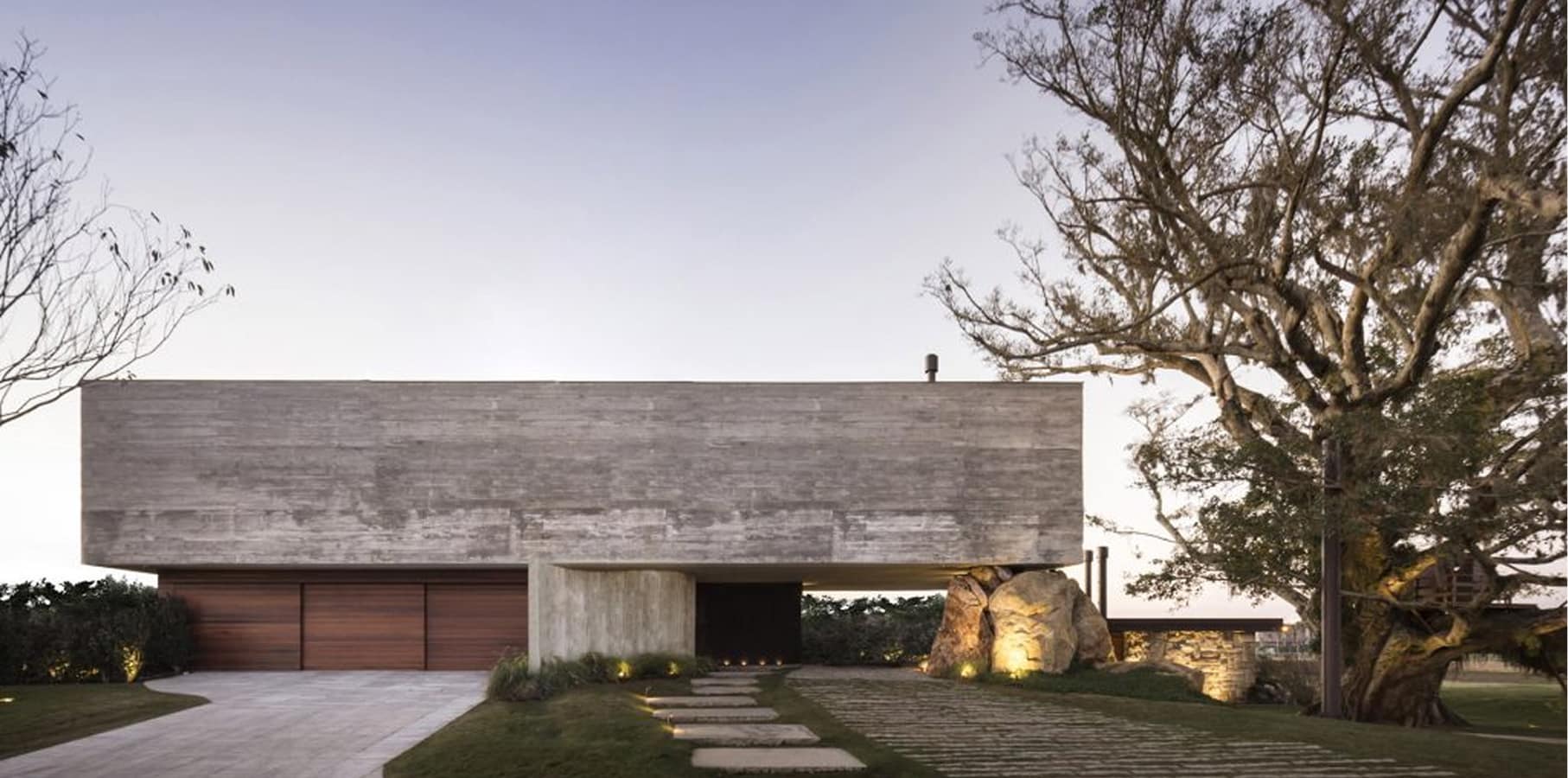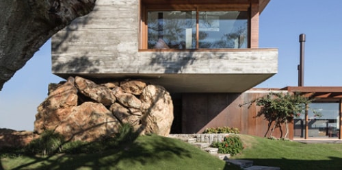 A escultórica figueira e a naturalidade orgânica de seus galhos contrastam com a rigidez do bloco em concreto na fachada. Ele abriga os dormitórios no nível superior e protege a moradia do vento minuano que sopra do sul. No andar térreo, um volume longitudinal em aço corten e vidro projeta a área social em direção à água.