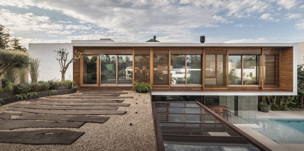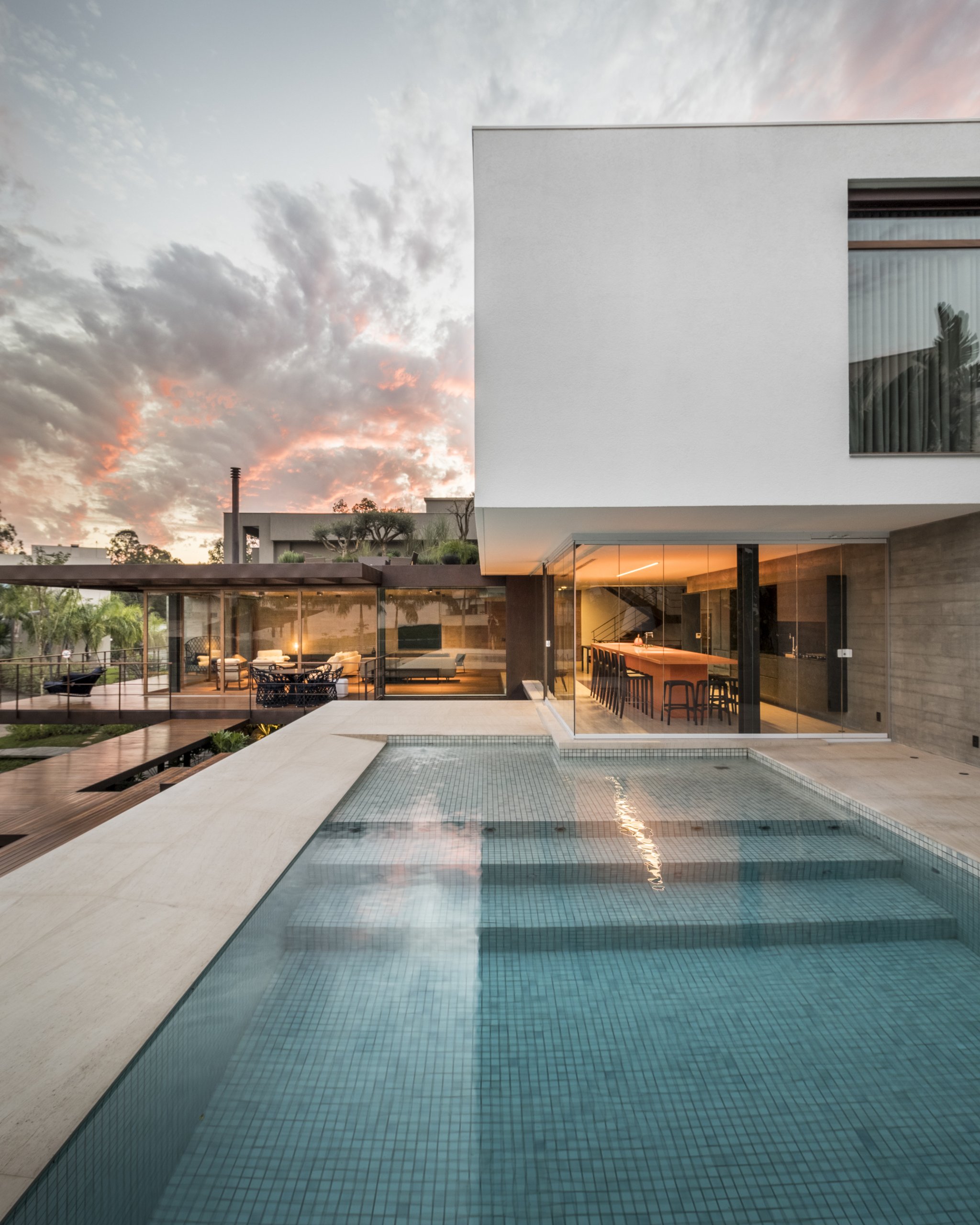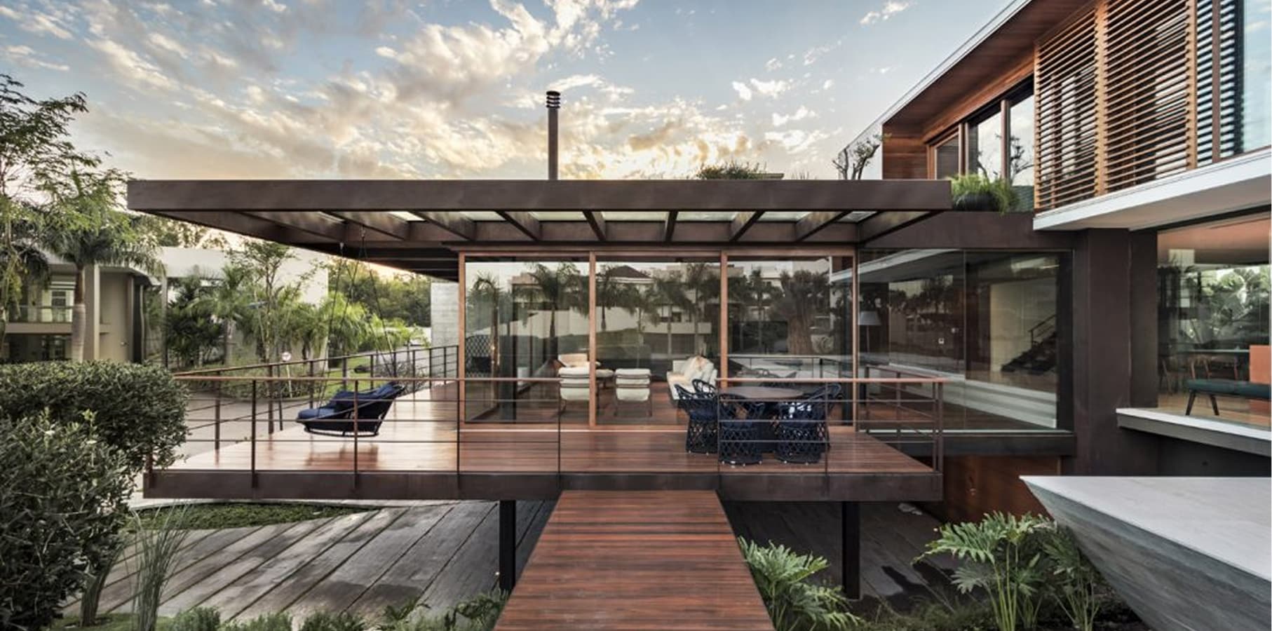 Os decks que se distribuem pelo aclive do terreno são a reinterpretação deste conceito. Entre madeira e estruturas metálicas, o conjunto flutua sobre o jardim. A definição clara do que é interno e do que é externo se desfaz, e isso é intencional, provocando também uma visão diferente sobre o que é lazer, o que é estar, o que é receber.