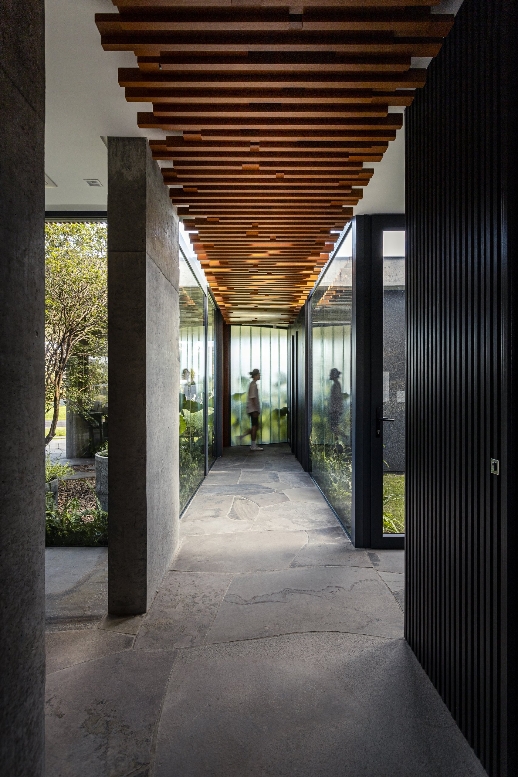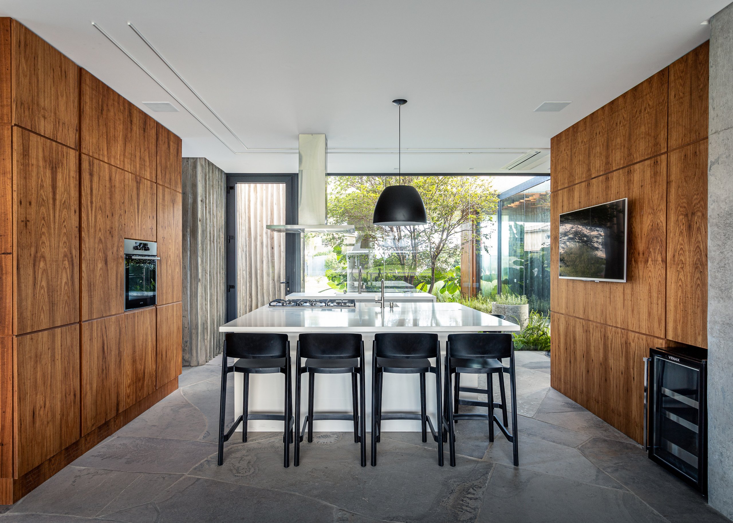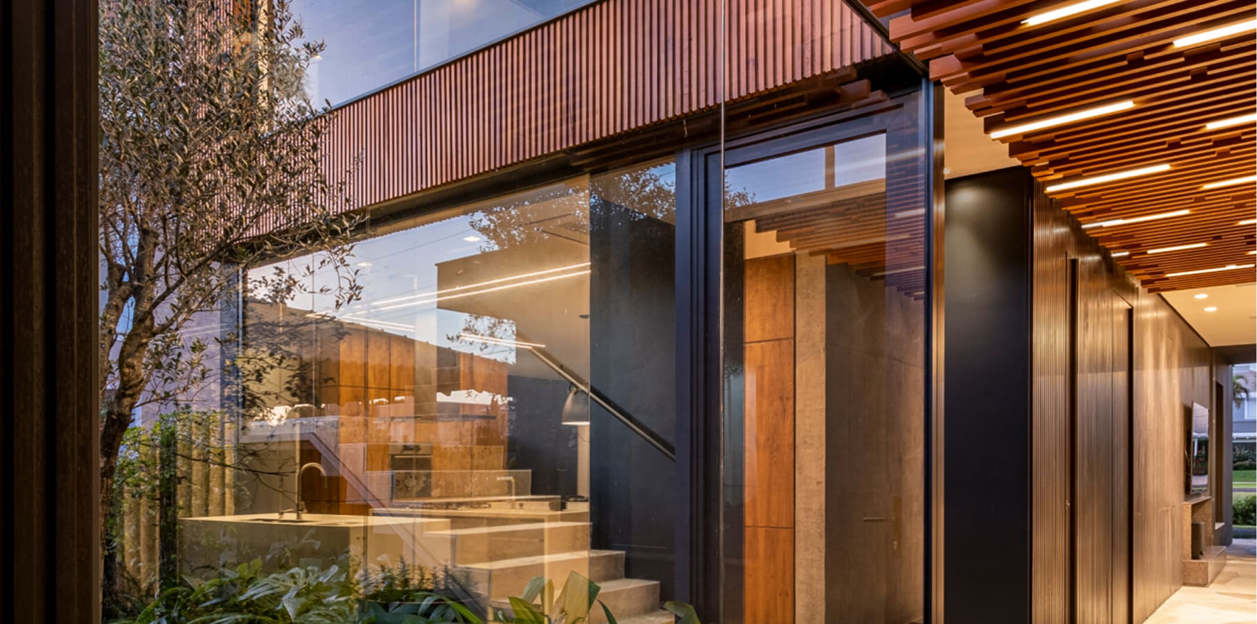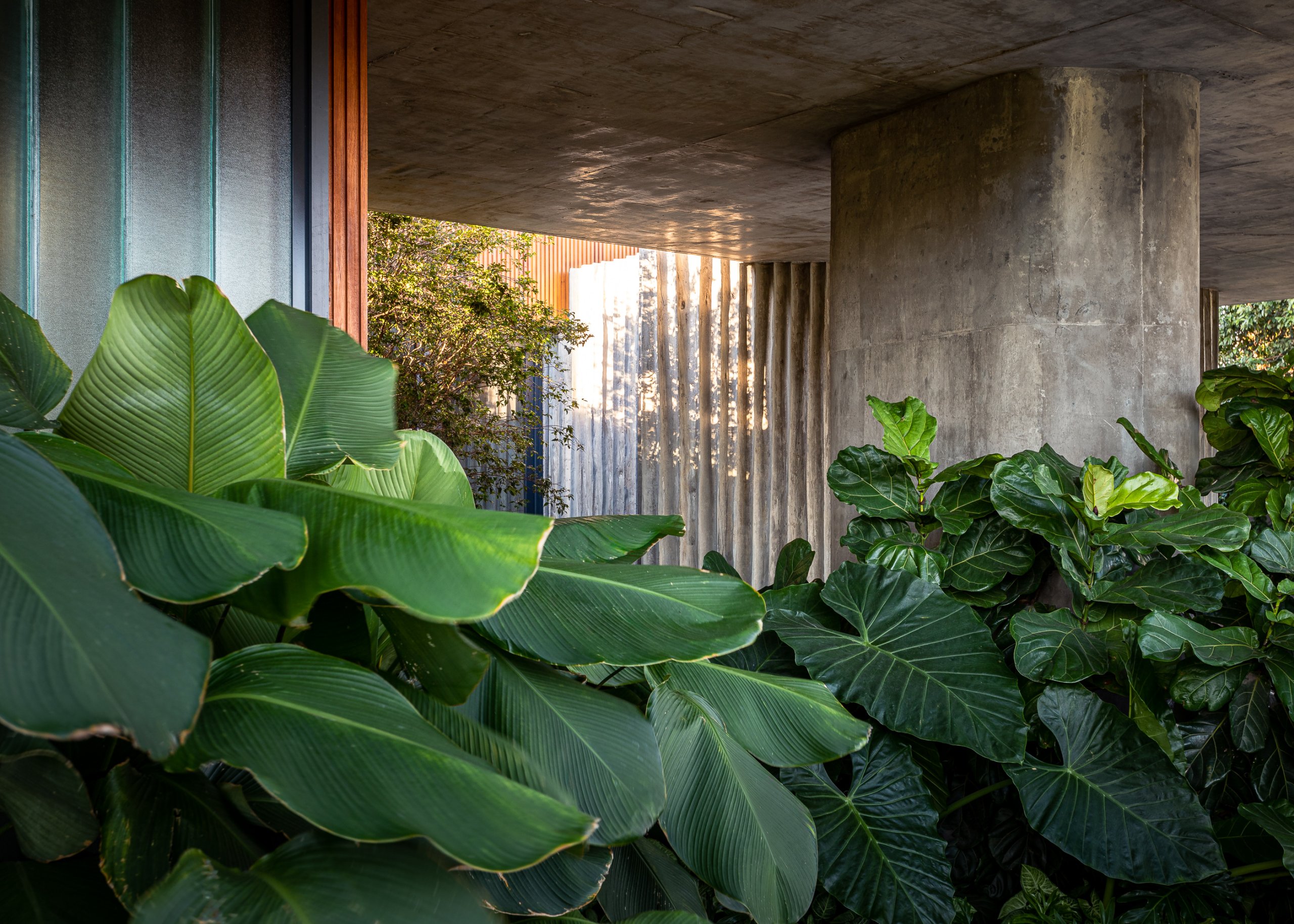 O hall e a área social interligam-se por uma circulação em vidro coberta por uma pérgola de madeira cumaru que protege a vegetação do vento, possibilitando o cultivo de ervas e temperos que abastecem a cozinha e frutos que fazem a alegria dos pássaros e da moradora.