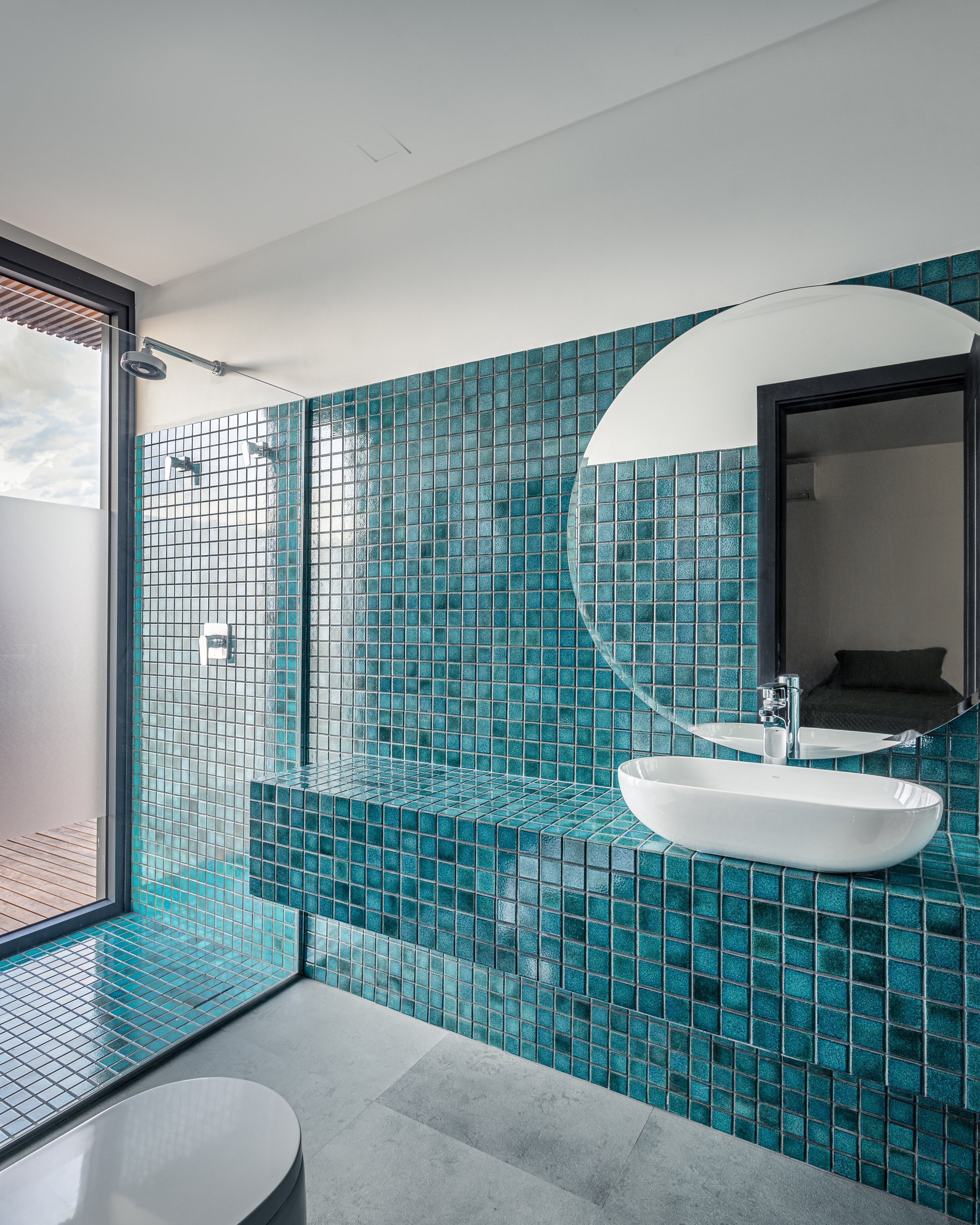 No térreo, encontram-se as dependências mais utilizadas pela moradora no dia a dia, como um grande living com cozinha integrada e a suíte principal, que se abre sobre o pátio e a piscina. No segundo pavimento, as demais suítes e sala íntima destinadas aos hóspedes conferem autonomia e privacidade aos visitantes.