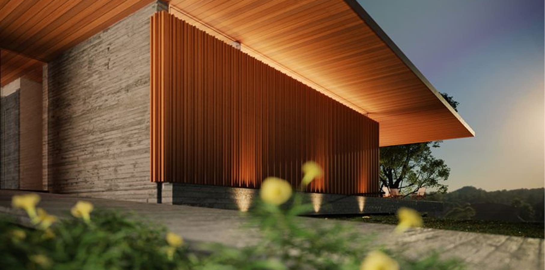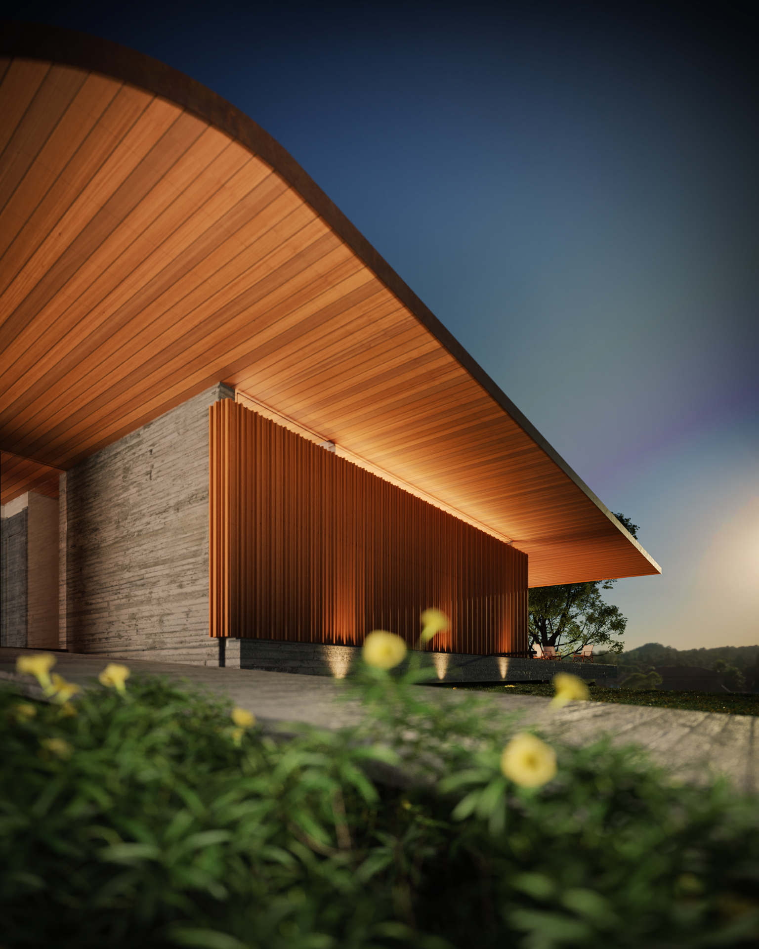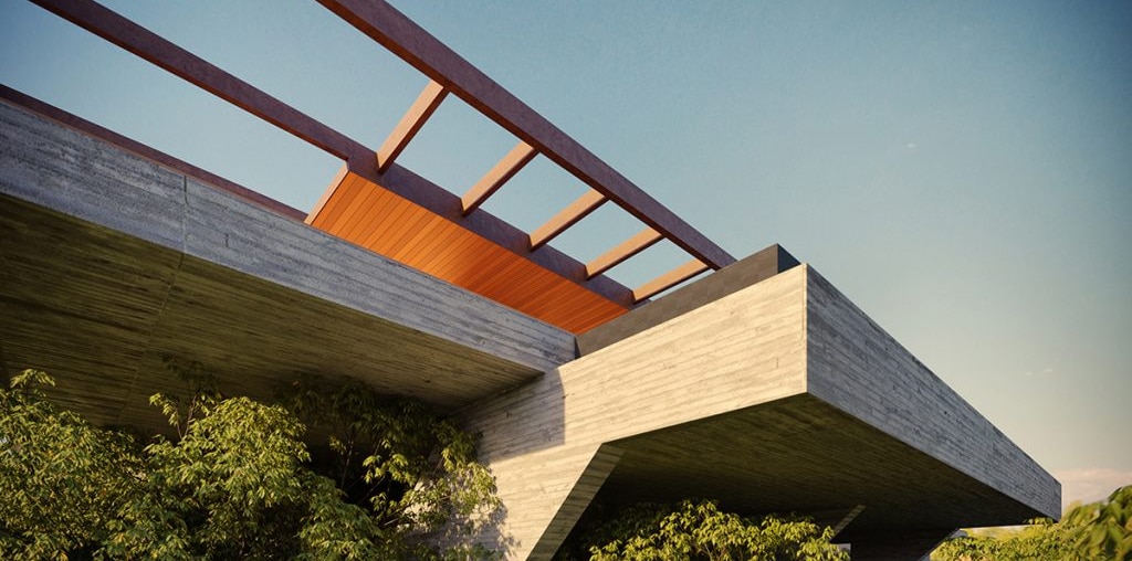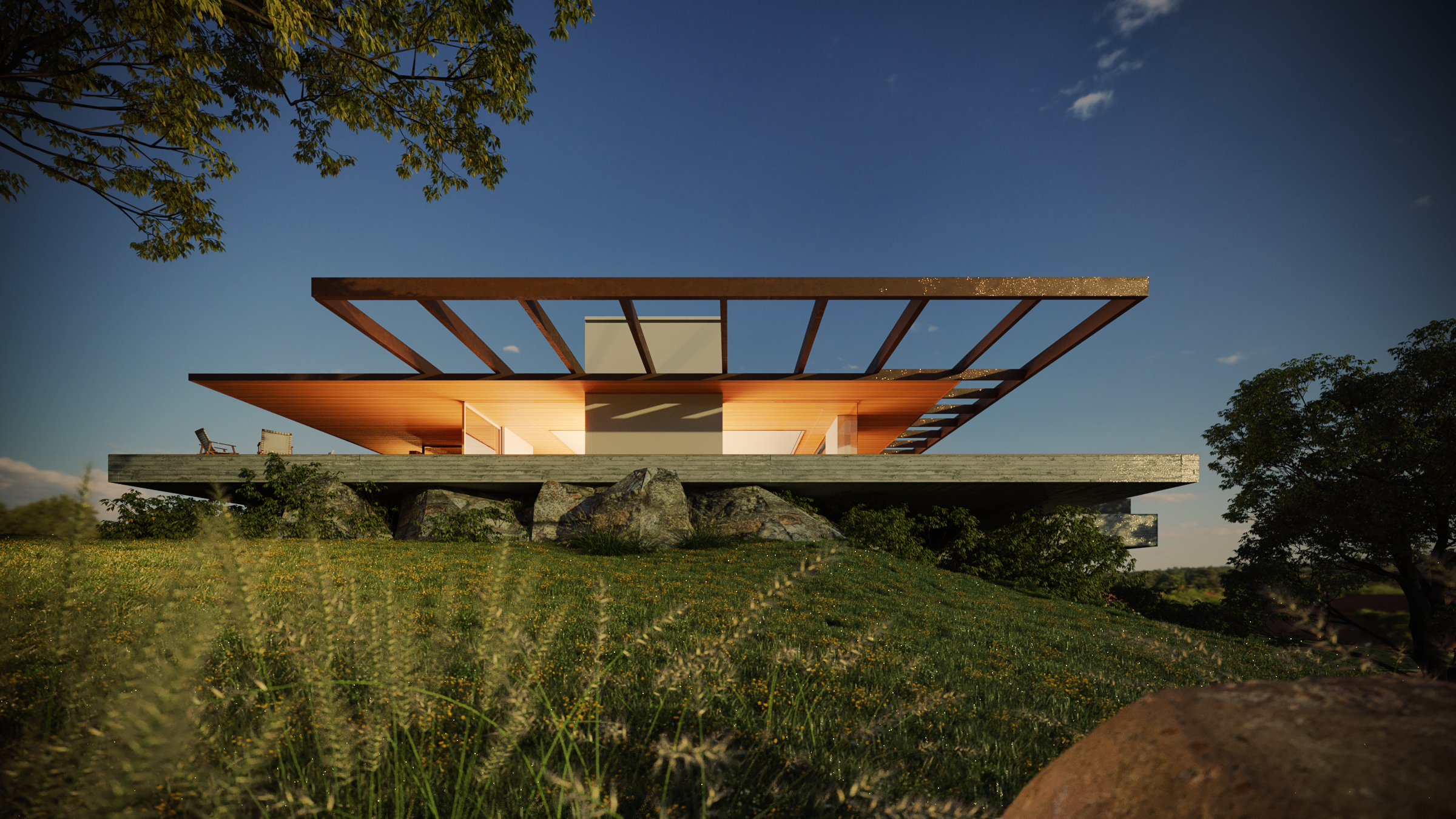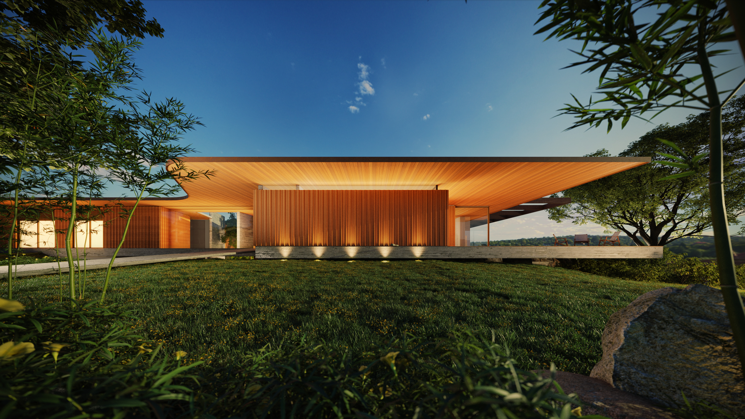 Foi projetado um longo volume horizontal que parece flutuar sobre o cume rochoso, permitindo que o jardim deslize sob ele. Na face sul, vidros de alto desempenho garantem a transparência e o conforto térmico. Na face norte, voltada para cidade, painéis em madeira dão unidade ao conjunto e cumprem a função de brises, preservando a privacidade. Pátios internos maximizam a iluminação natural e a ventilação cruzada em todos os ambientes.