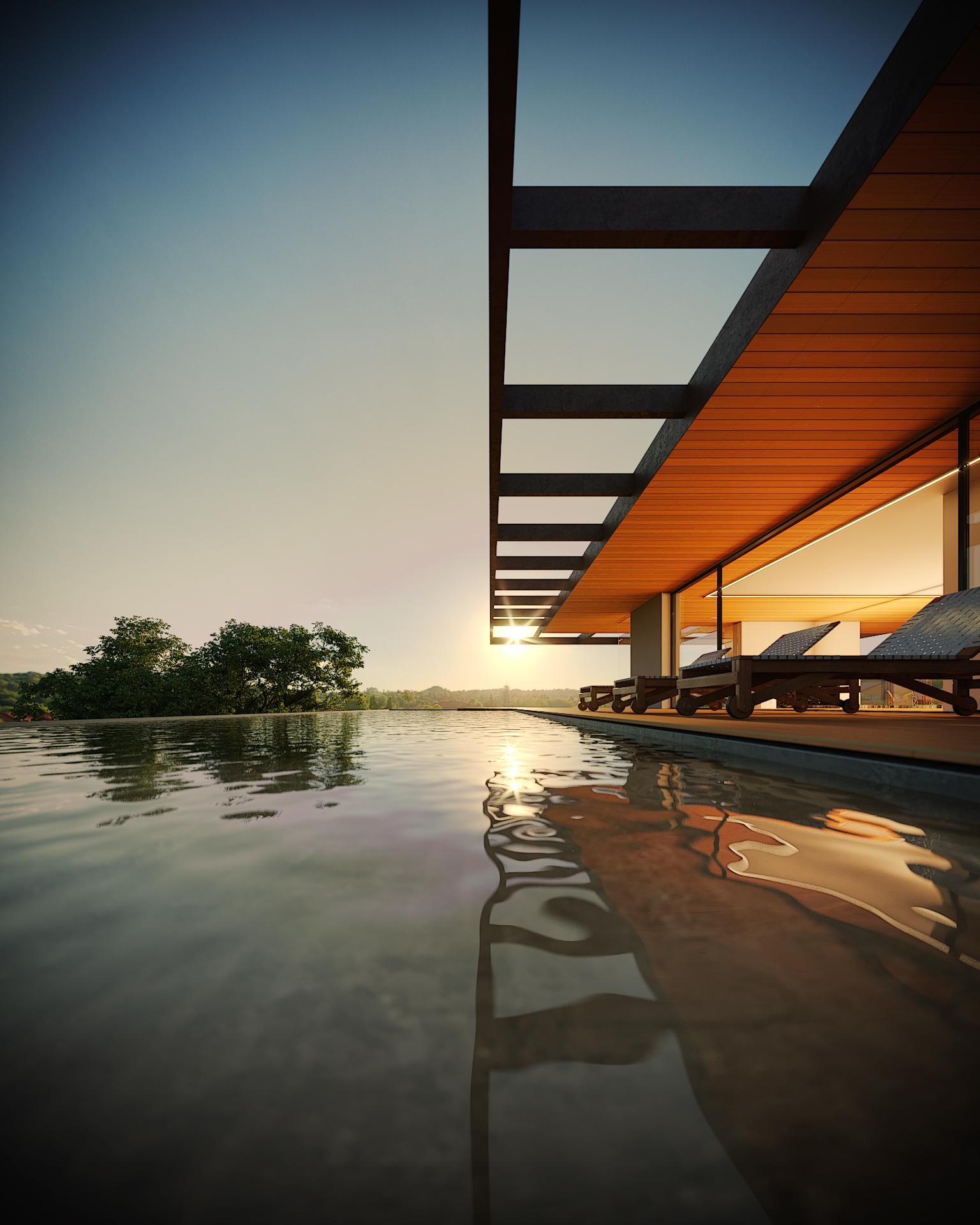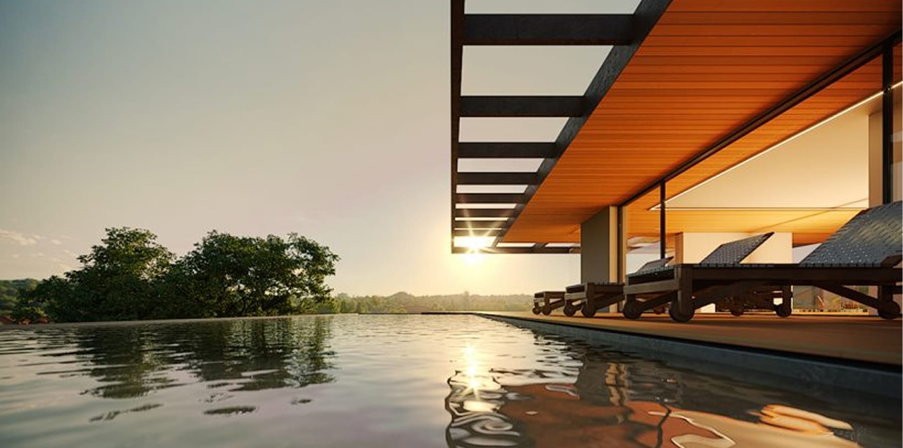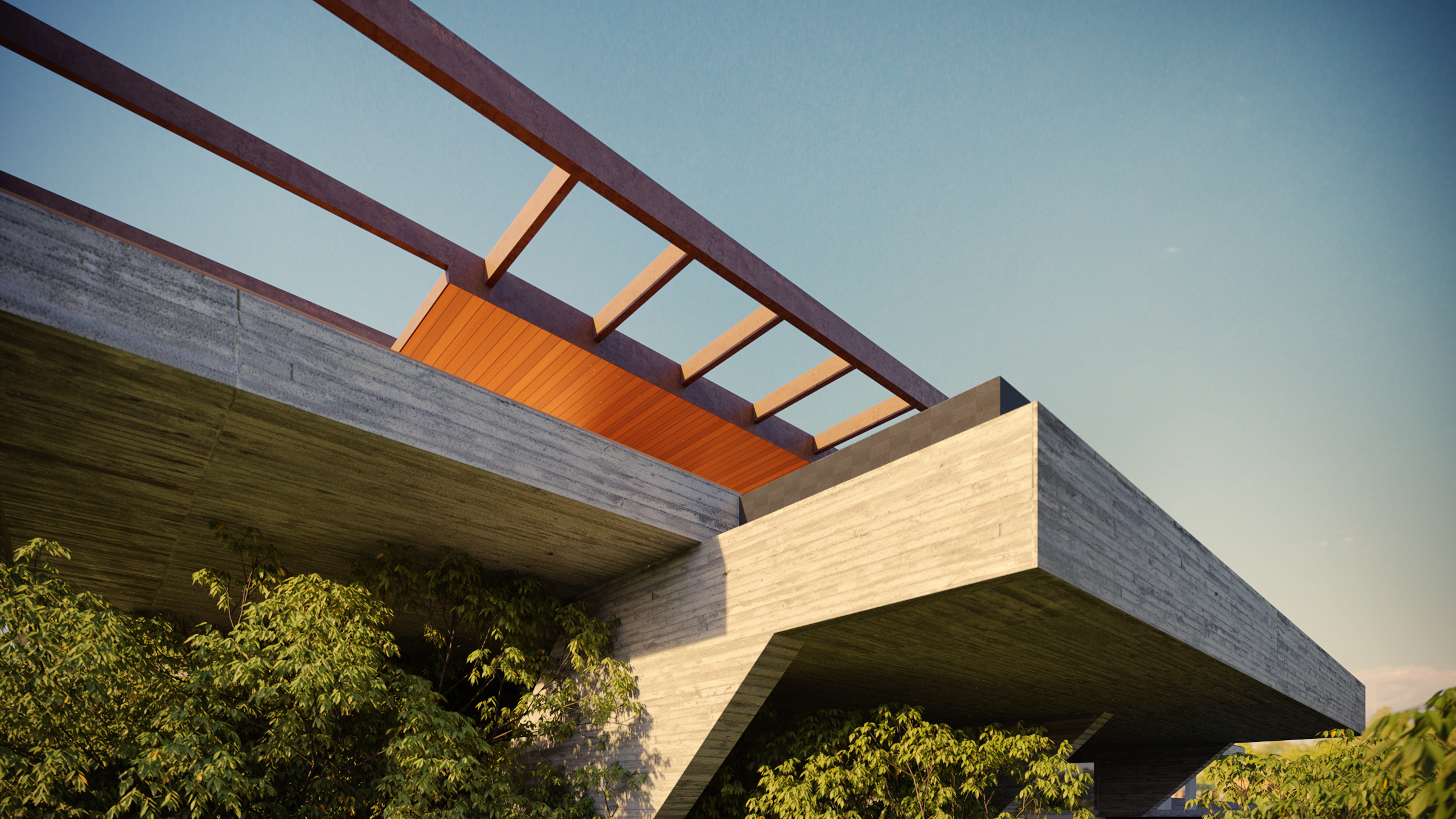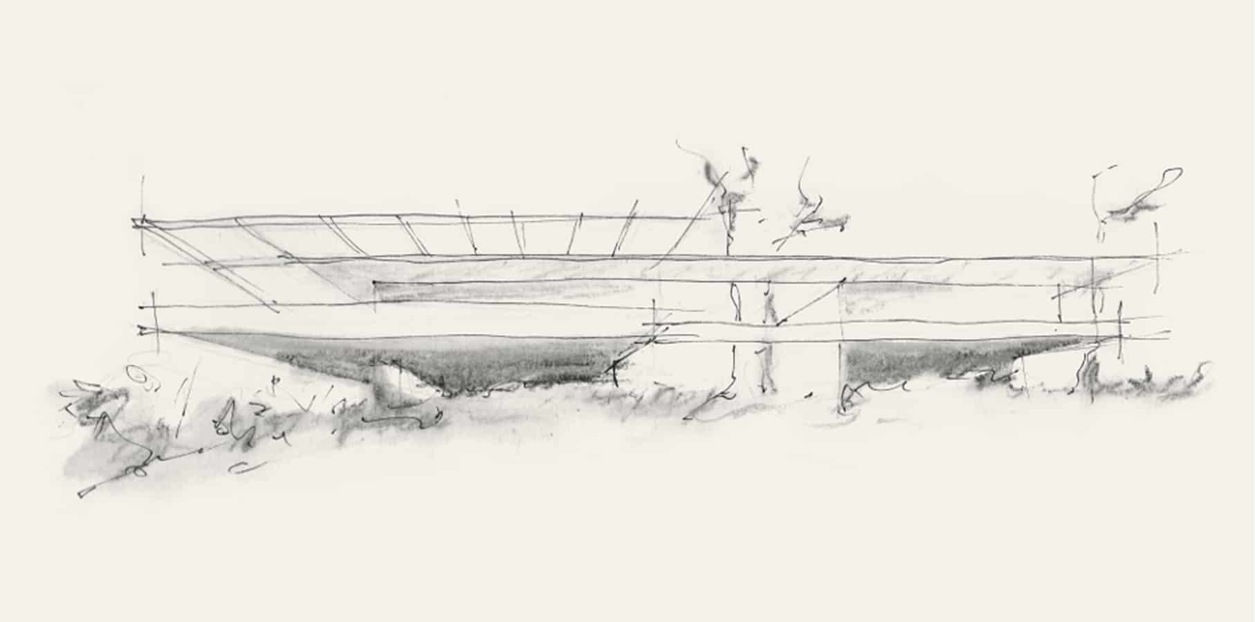 Foi projetado um longo volume horizontal que parece flutuar sobre o cume rochoso, permitindo que o jardim deslize sob ele. Na face sul, vidros de alto desempenho garantem a transparência e o conforto térmico. Na face norte, voltada para cidade, painéis em madeira dão unidade ao conjunto e cumprem a função de brises, preservando a privacidade. Pátios internos maximizam a iluminação natural e a ventilação cruzada em todos os ambientes.