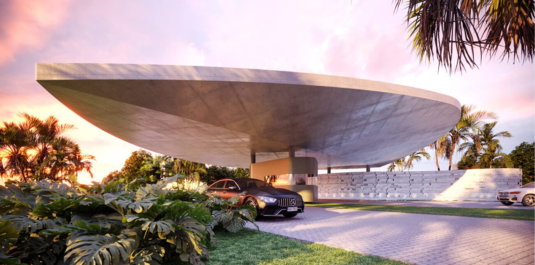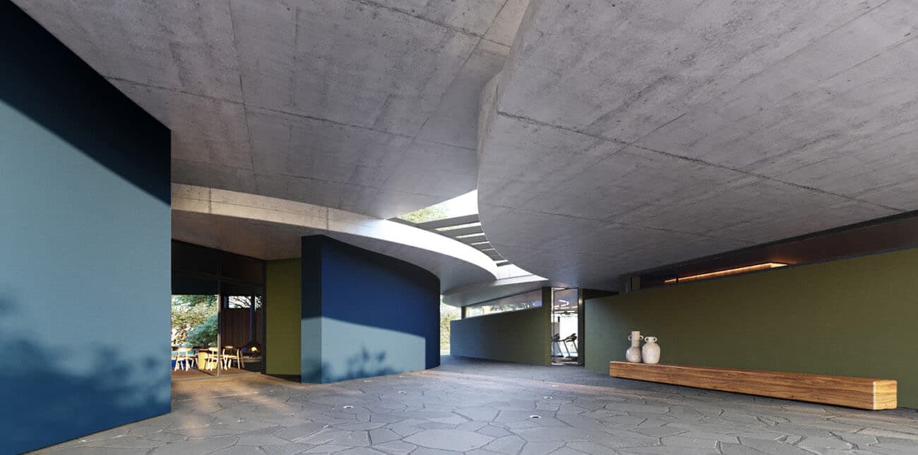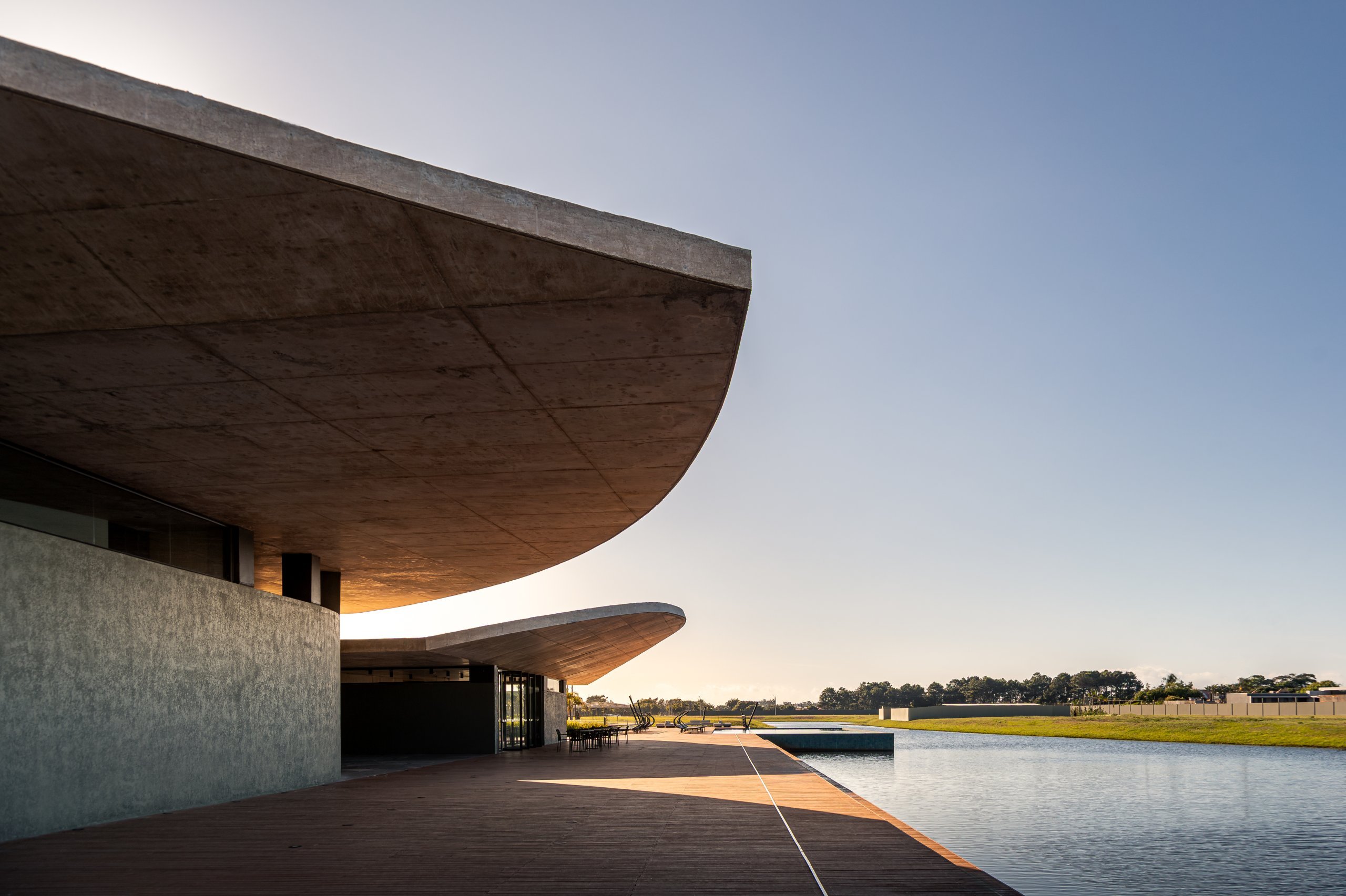 Já na entrada do condomínio, o pórtico moldado em concreto aparente empresta a forma orgânica de uma semi-pétala. As curvas leves e fluídas seguem para as edificações que recebem salões de festas, áreas desportivas e de lazer, além da piscina aquecida com borda infinita. A consagrada Casa do Baile de Niemeyer, projetada em Belo Horizonte em 1943, é uma referência modernista para o uso de amplos ambientes e elementos naturais em estado puro, fortalecendo a relação entre interno e externo e a experiência perene e atemporal do espaço.