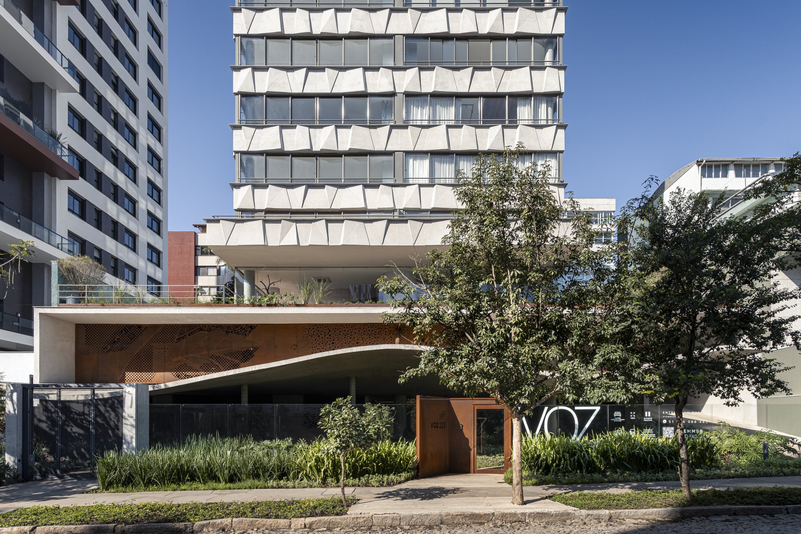 Inspirado na fluidez da fala e na essência do lugar, o Voz se destaca pelas linhas orgânicas e pela mensagem esculpida em sua fachada, refletindo a harmonia entre modernidade e tradição.