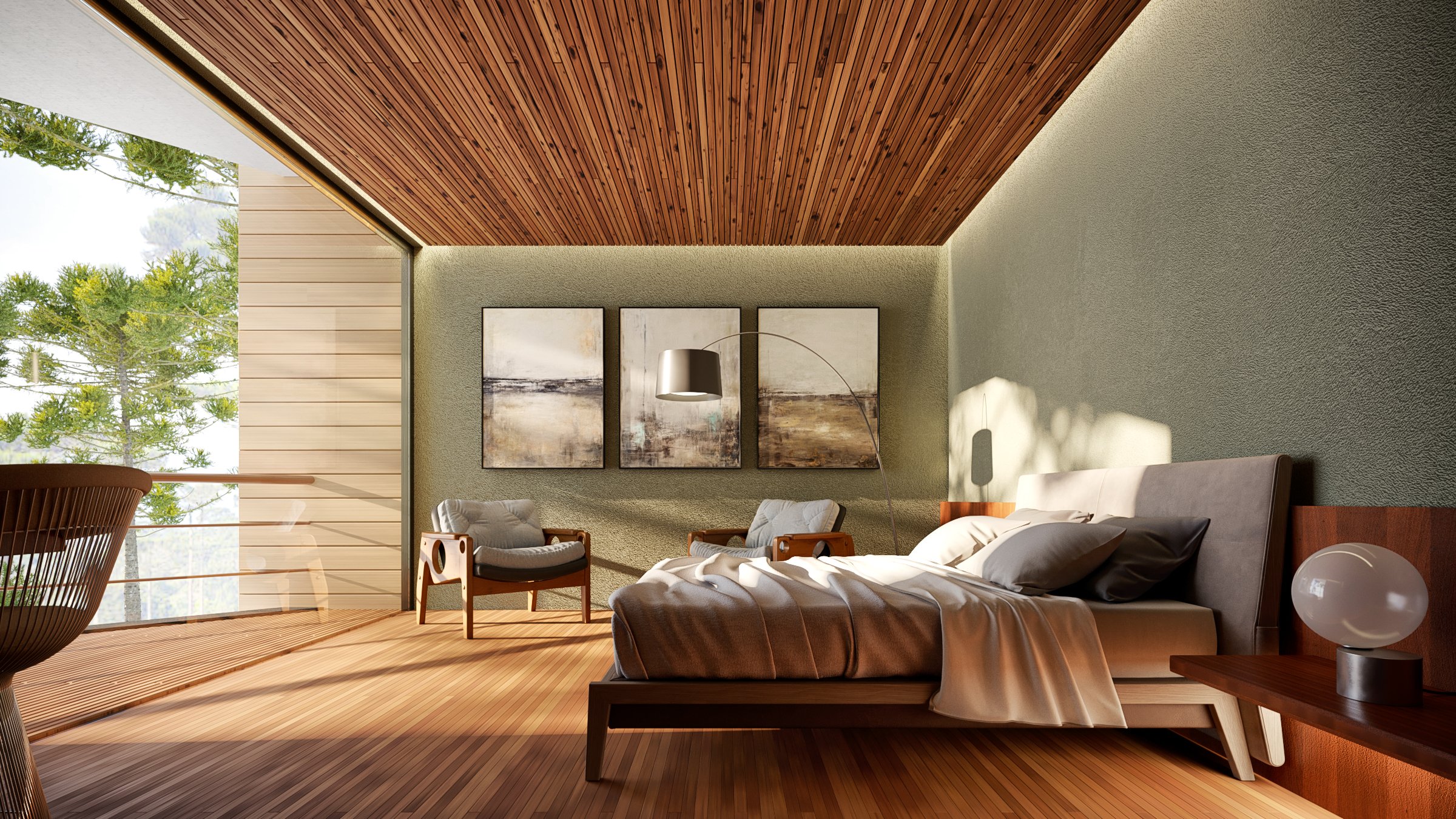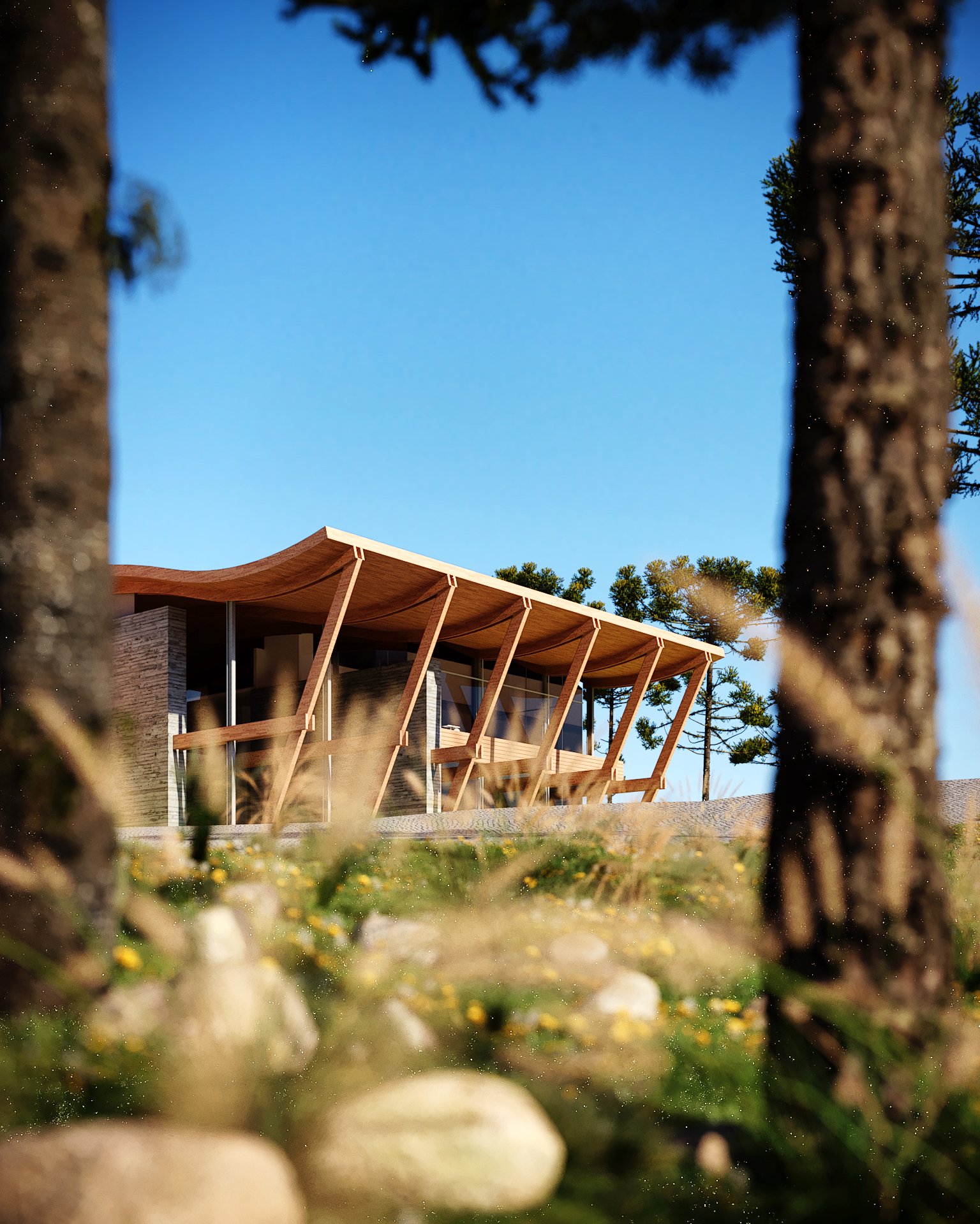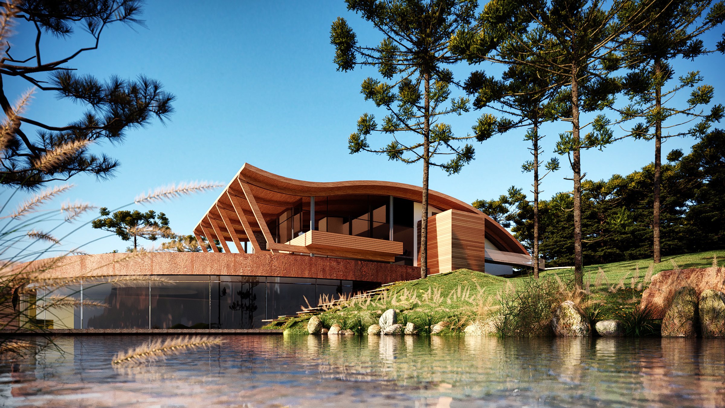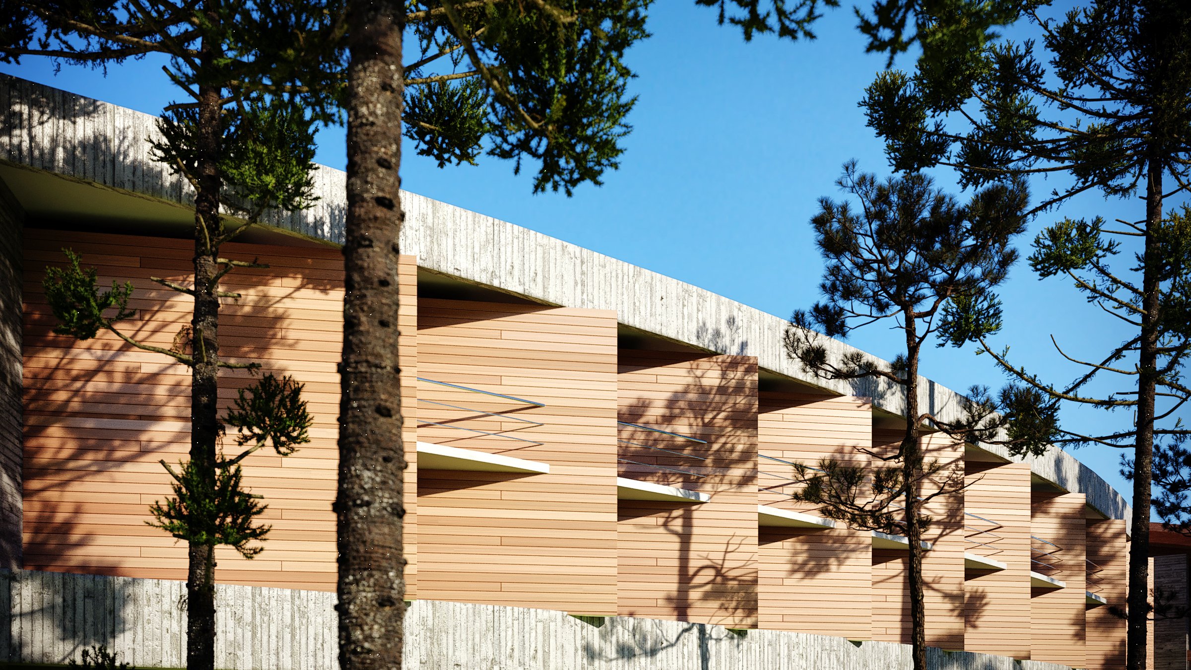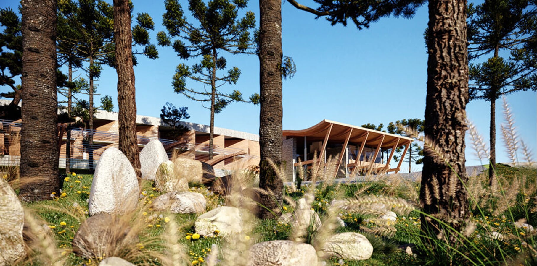 Todos os dormitórios possuem agradável vista para o vale e privilegiada orientação solar. Os corredores tem jardins laterais que proporcionam ventilação e iluminação natural. Cobertas por vegetação como um telhado verde, as construções se disfarçam na serra formando um agradável platô refletidas pelo lago já existente no terreno.