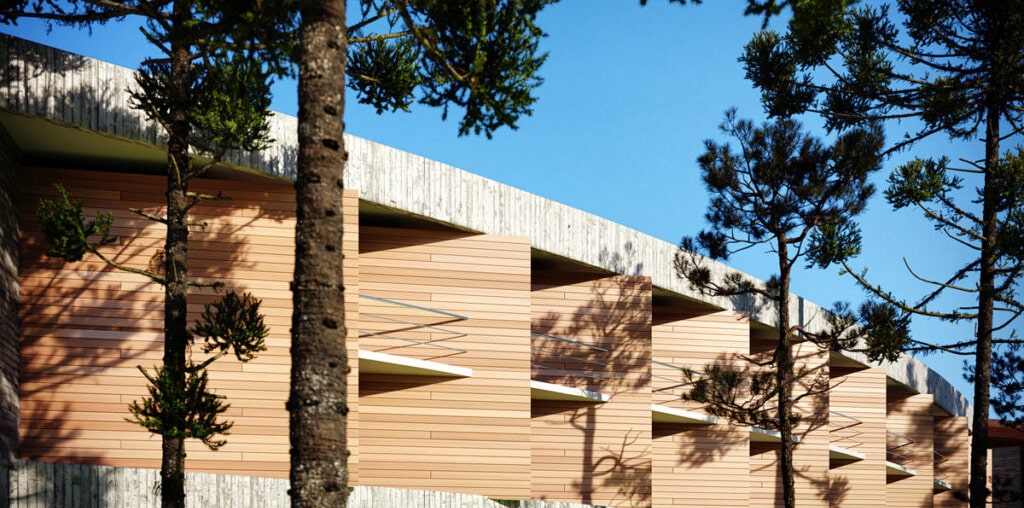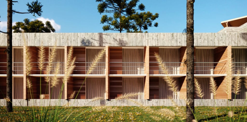 O prédio principal deste hotel, a 60km de Porto Alegre, na cidade serrana de Morro Reuter, integra-se à natureza pela aplicação de materiais característicos da região, com madeira e lâminas de pedra que lembram as tradicionais taipas coloniais. Os panos de vidro conferem transparência. As edificações anexas procuram mimetizar-se ao meio-ambiente, tornando-se parte do entorno e salientando o prédio da área comum.